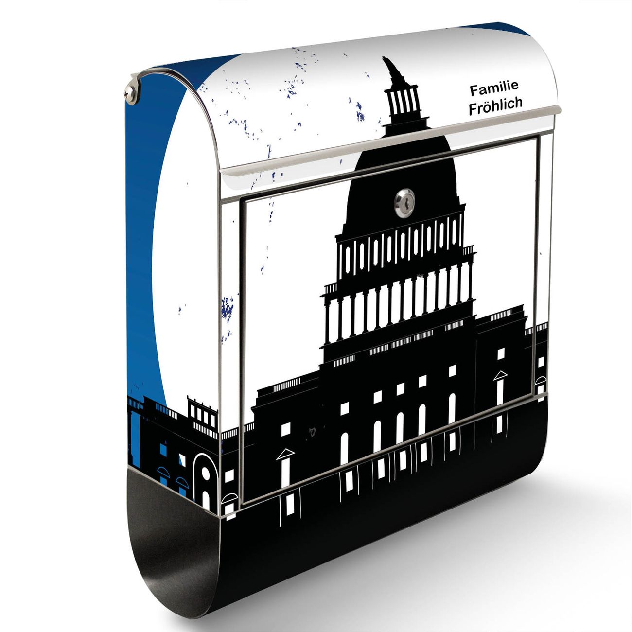 Der banjado Edelstahl Standbriefkasten mit Motiv City Poster Washington und eigenem Wunschtext bietet Ihnen mit seinem Fassungsvermögen genügend Platz auch für große A4 Sendungen. Das integrierte Zeitungsfach eignet sich hervorragend, um unkompliziert die Tageszeitung zu fassen.