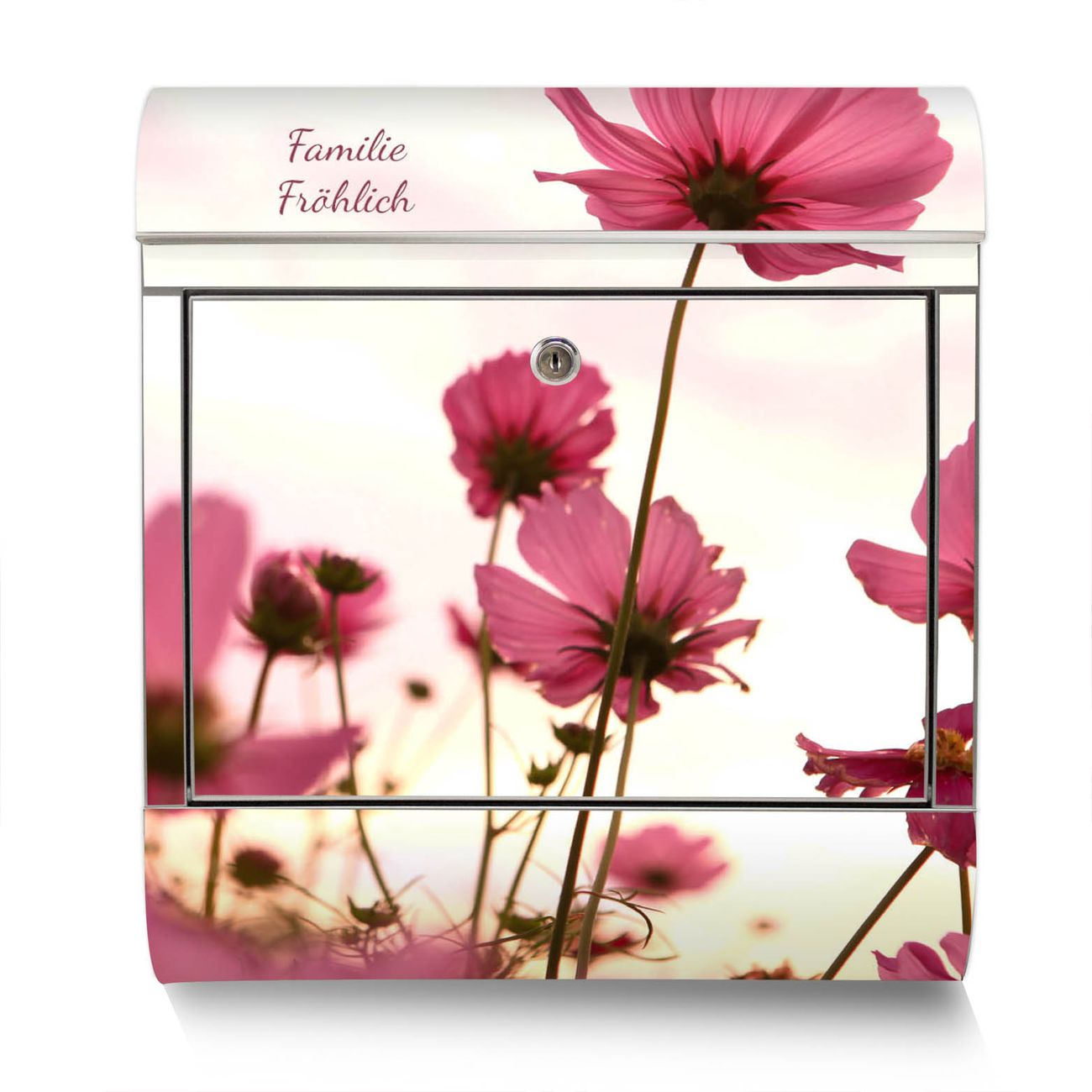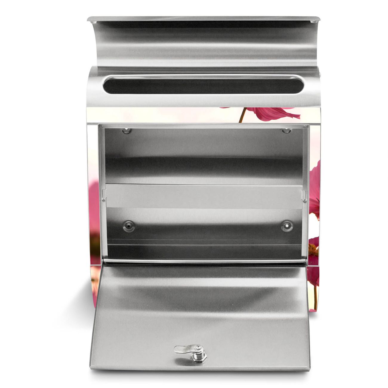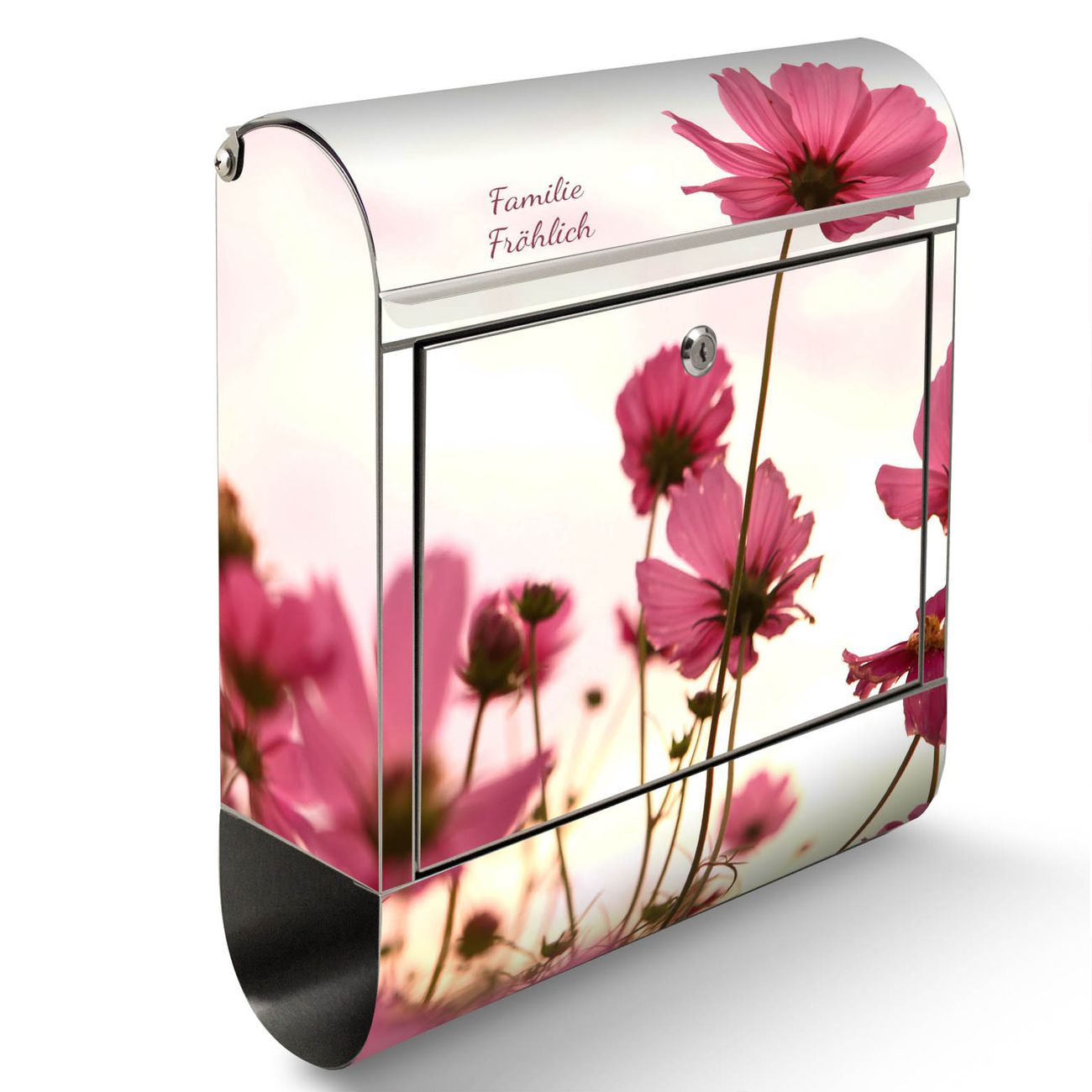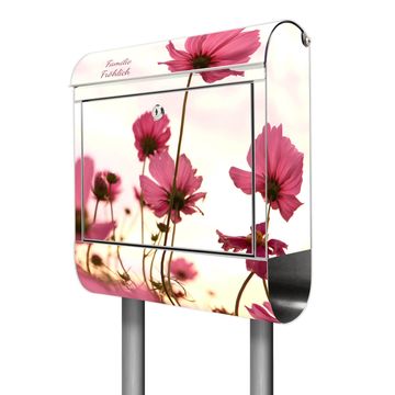 Der banjado Edelstahl Standbriefkasten mit Motiv Cosmea und eigenem Wunschtext bietet Ihnen mit seinem Fassungsvermögen genügend Platz auch für große A4 Sendungen. Das integrierte Zeitungsfach eignet sich hervorragend, um unkompliziert die Tageszeitung zu fassen.