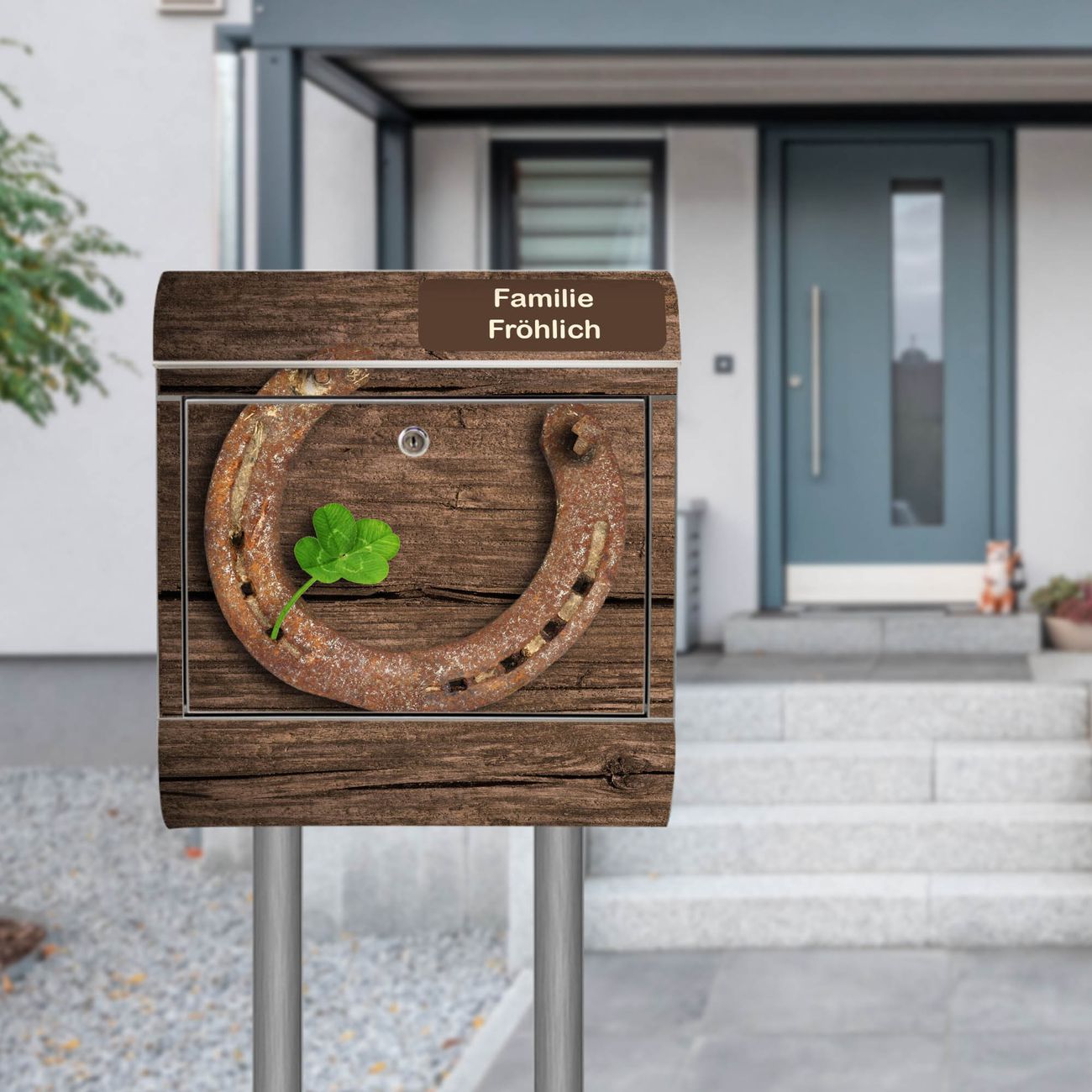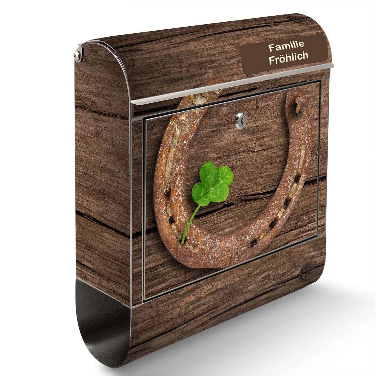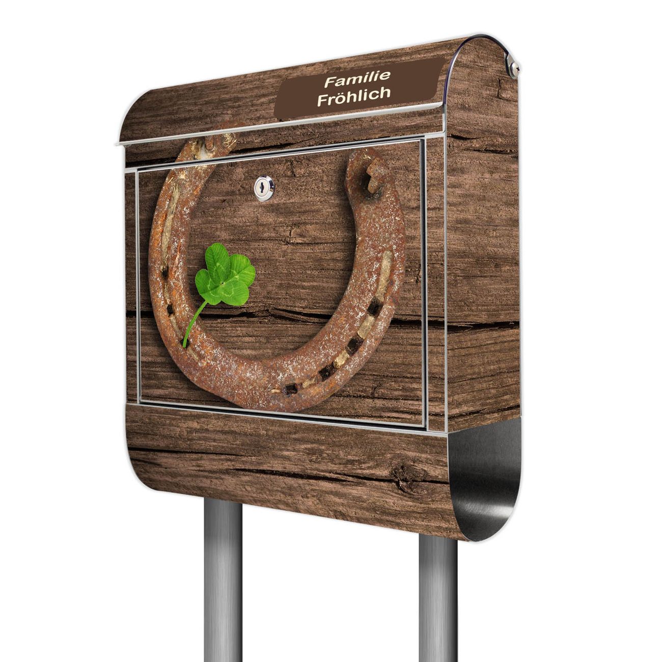 Der banjado Edelstahl Standbriefkasten mit Motiv Doppeltes Glück und eigenem Wunschtext bietet Ihnen mit seinem Fassungsvermögen genügend Platz auch für große A4 Sendungen. Das integrierte Zeitungsfach eignet sich hervorragend, um unkompliziert die Tageszeitung zu fassen.