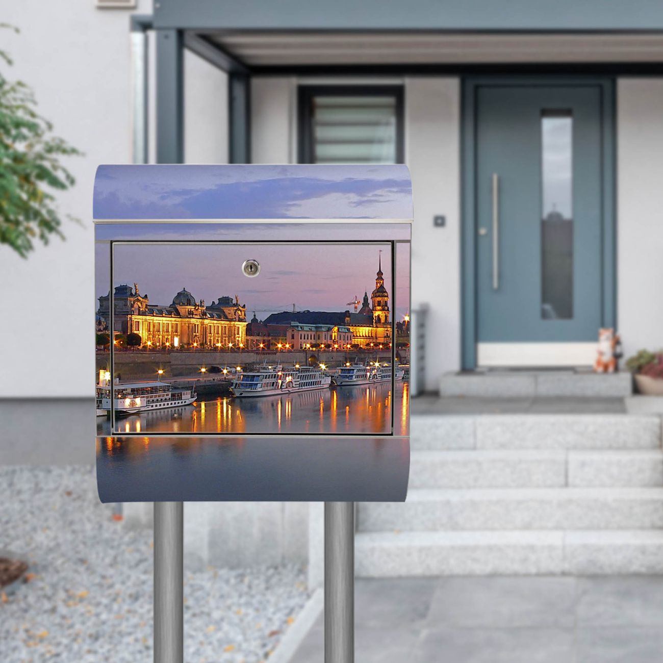 Der Motivstandbriefkasten hat ein sehr ansprechendes und ausgefallenes Design, damit entlocken Sie Ihren Nachbarn und dem Postboten ein Lächeln. Heben Sie Sich ab von der tristen grauen Masse, ohne auf Funktionalität zu verzichten. Der Briefkasten besteht aus hochwertigem 18/0 Edelstahl und die Wetter- und UV-resistenten Folie mit Dresden Motiv ist zusätzlich mit einem Schutzlaminat überzogen. Der Standbriefkasten wird mit Montagematerial und zwei Schlüsseln geliefert.