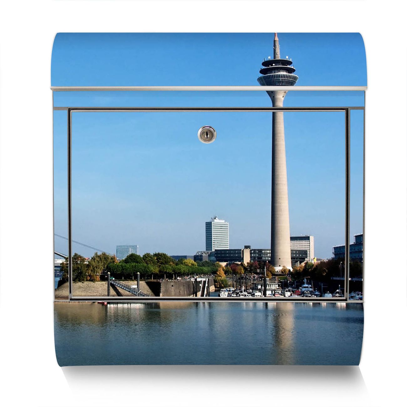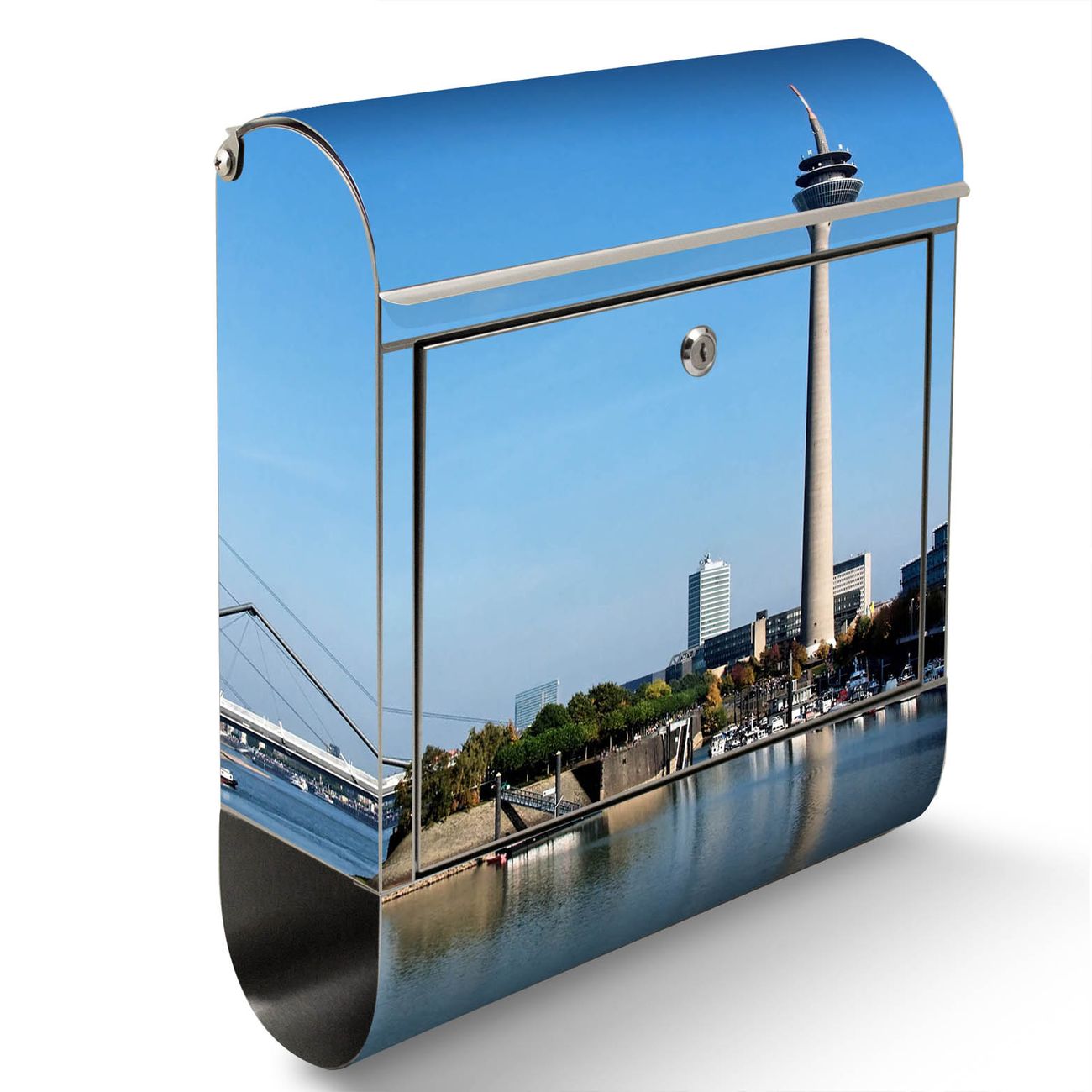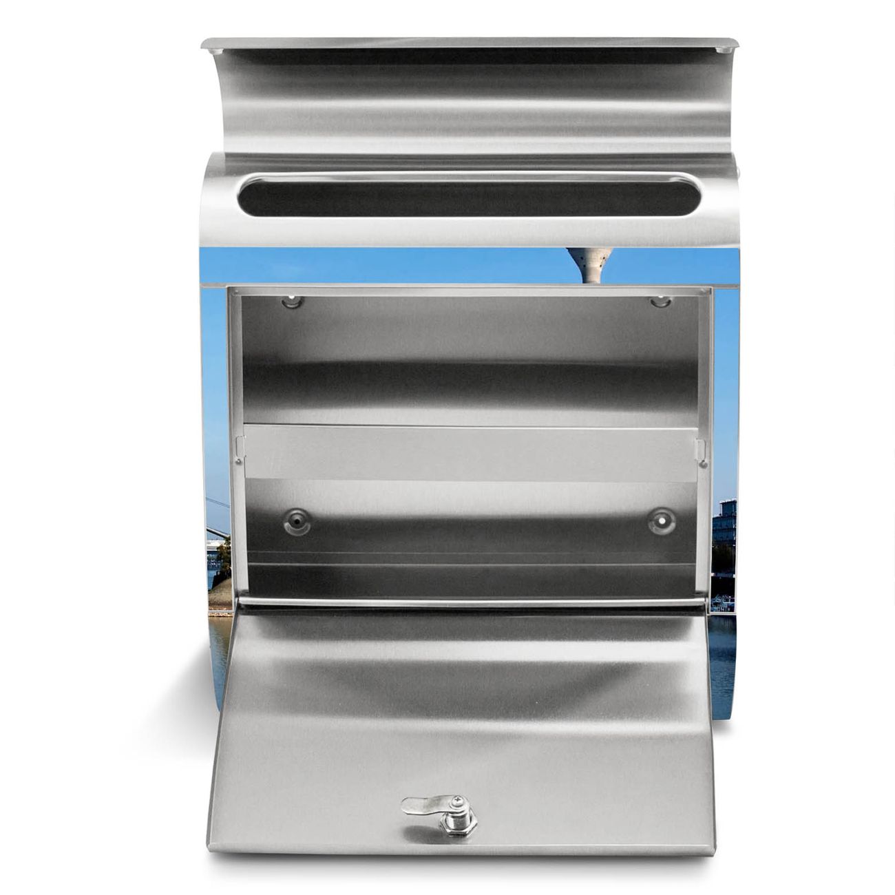 Der banjado Edelstahl Standbriefkasten mit Motiv Düsseldorf bietet Ihnen mit seinem Fassungsvermögen genügend Platz auch für große A4 Sendungen. Das integrierte Zeitungsfach eignet sich hervorragend, um unkompliziert die Tageszeitung zu fassen.