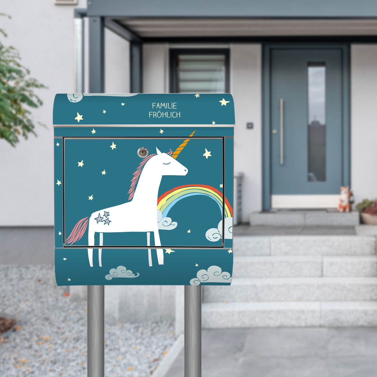 Der Motivstandbriefkasten hat ein sehr ansprechendes und ausgefallenes Design, damit entlocken Sie Ihren Nachbarn und dem Postboten ein Lächeln. Heben Sie Sich ab von der tristen grauen Masse, ohne auf Funktionalität zu verzichten. Der Briefkasten besteht aus hochwertigem 18/0 Edelstahl und die Wetter- und UV-resistenten Folie mit Einhorn Motiv ist zusätzlich mit einem Schutzlaminat überzogen. Der Standbriefkasten wird mit Montagematerial und zwei Schlüsseln geliefert.