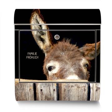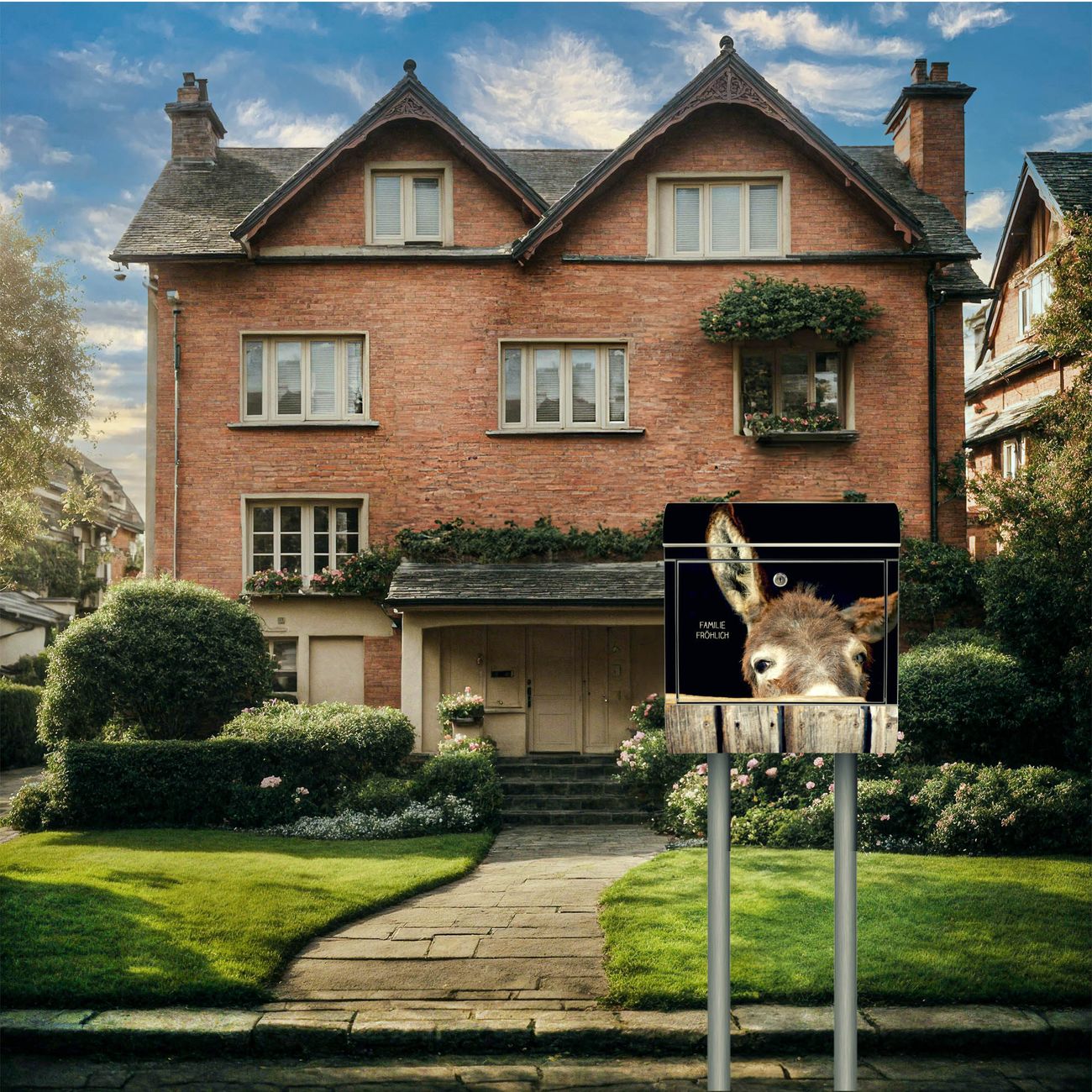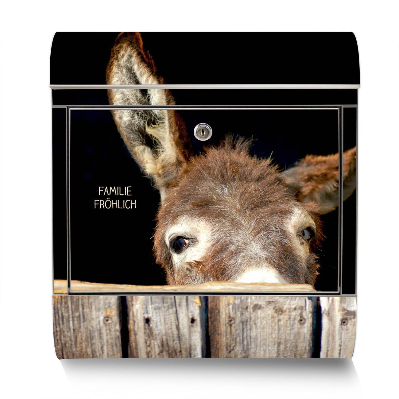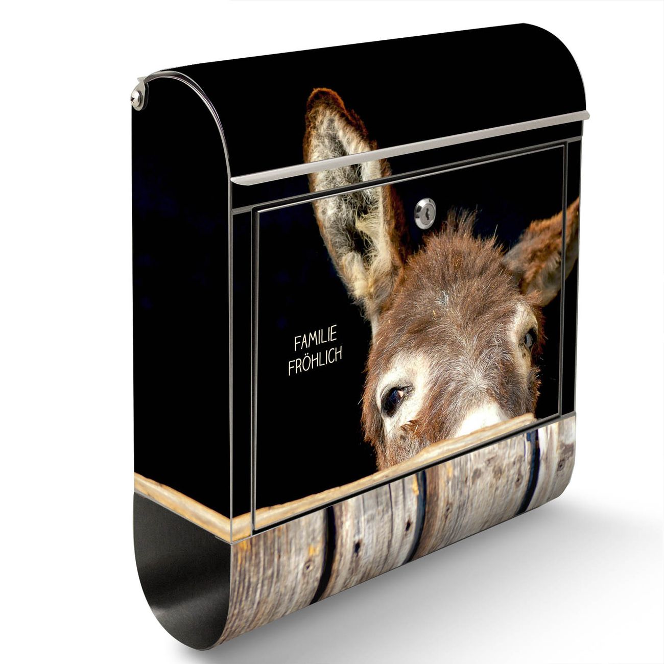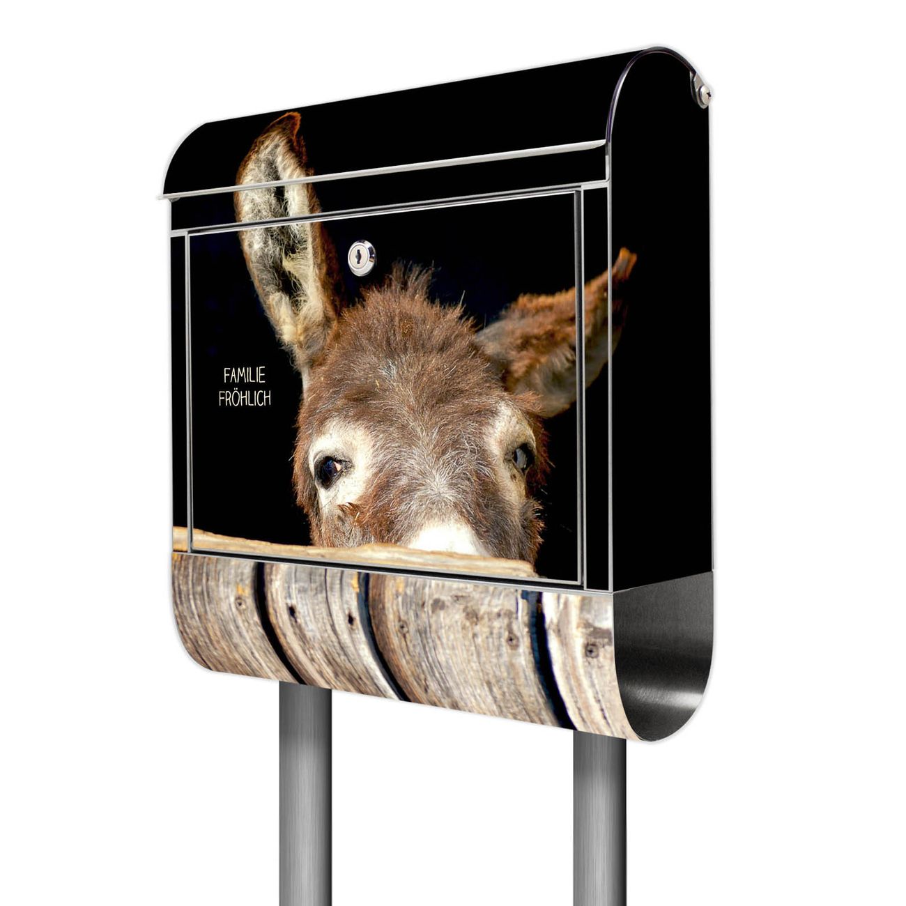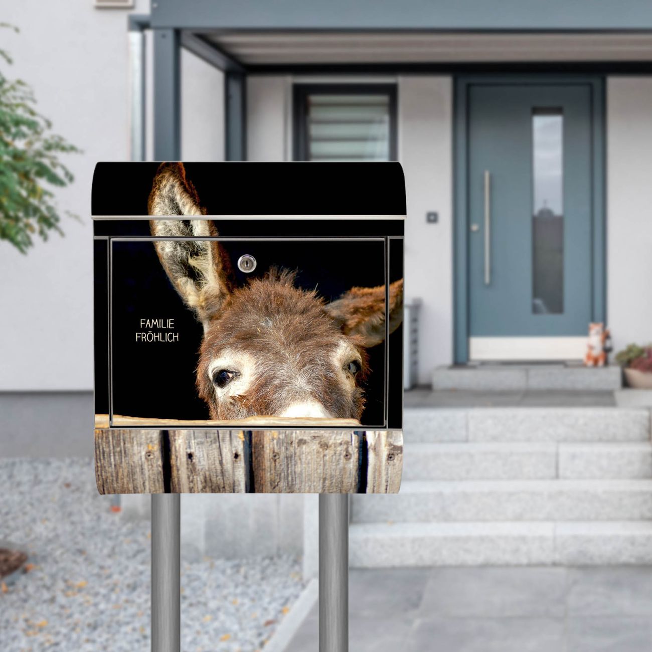 Der banjado Edelstahl Standbriefkasten mit Motiv Esel und eigenem Wunschtext bietet Ihnen mit seinem Fassungsvermögen genügend Platz auch für große A4 Sendungen. Das integrierte Zeitungsfach eignet sich hervorragend, um unkompliziert die Tageszeitung zu fassen.