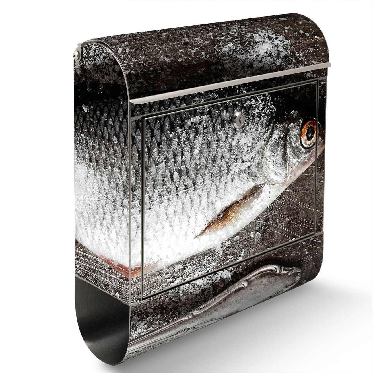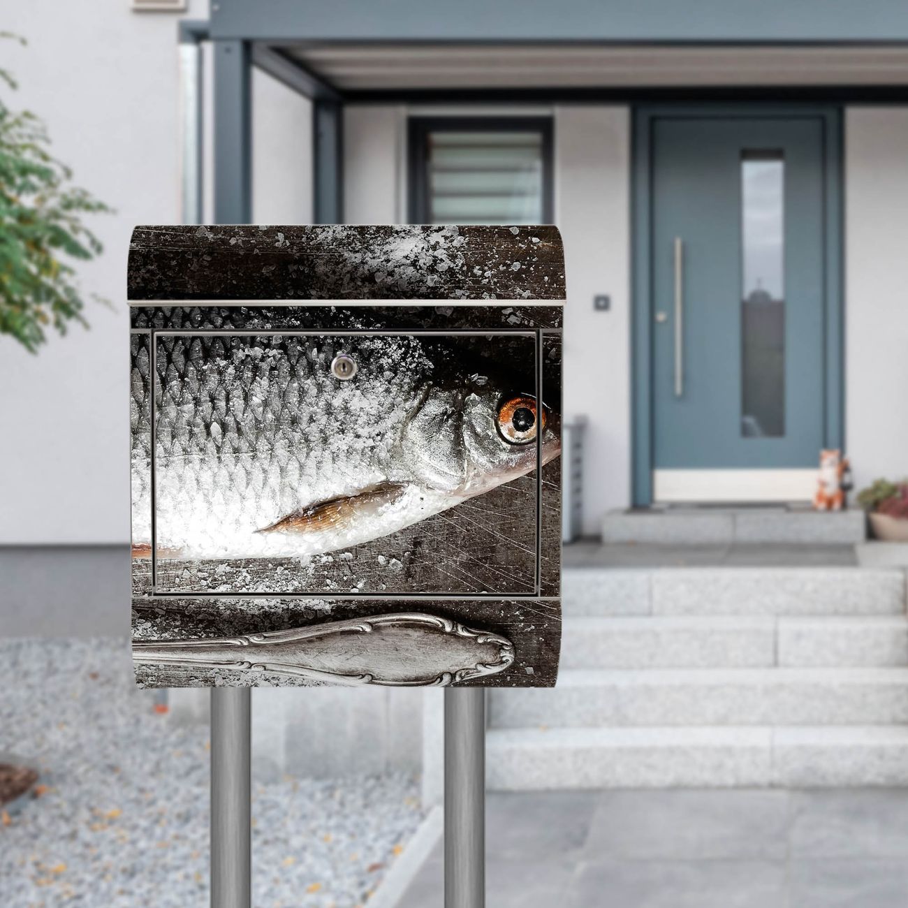 Der Motivstandbriefkasten hat ein sehr ansprechendes und ausgefallenes Design, damit entlocken Sie Ihren Nachbarn und dem Postboten ein Lächeln. Heben Sie Sich ab von der tristen grauen Masse, ohne auf Funktionalität zu verzichten. Der Briefkasten besteht aus hochwertigem 18/0 Edelstahl und die Wetter- und UV-resistenten Folie mit Fisch Und Salz Motiv ist zusätzlich mit einem Schutzlaminat überzogen. Der Standbriefkasten wird mit Montagematerial und zwei Schlüsseln geliefert.