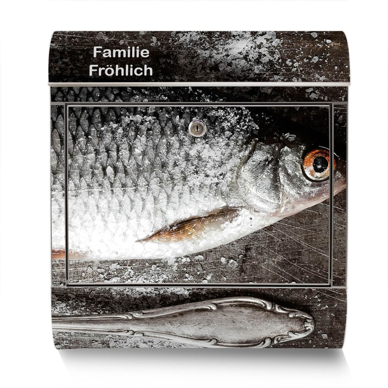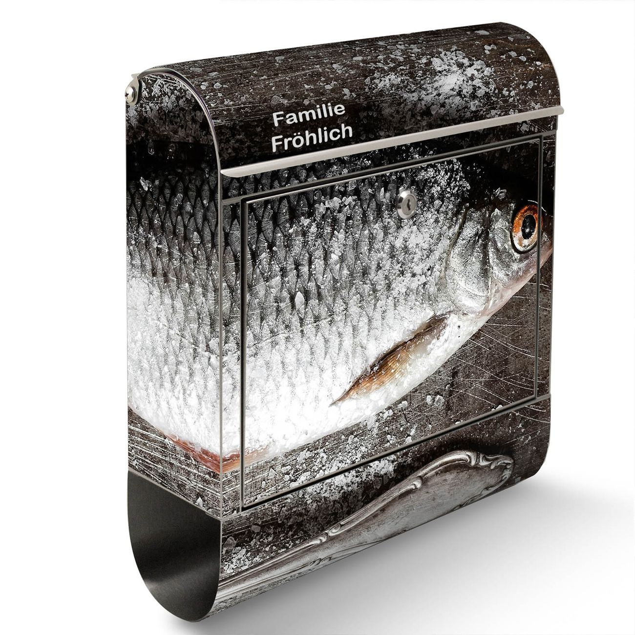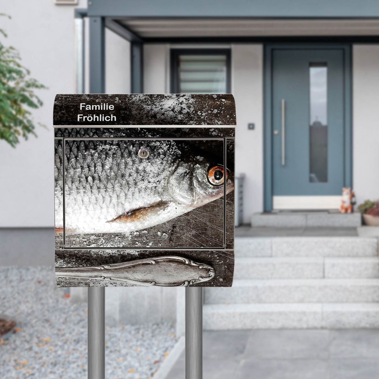 Der banjado Edelstahl Standbriefkasten mit Motiv Fisch Und Salz und eigenem Wunschtext bietet Ihnen mit seinem Fassungsvermögen genügend Platz auch für große A4 Sendungen. Das integrierte Zeitungsfach eignet sich hervorragend, um unkompliziert die Tageszeitung zu fassen.