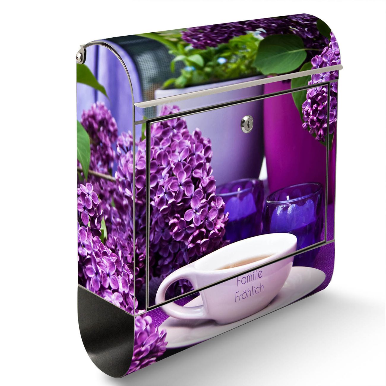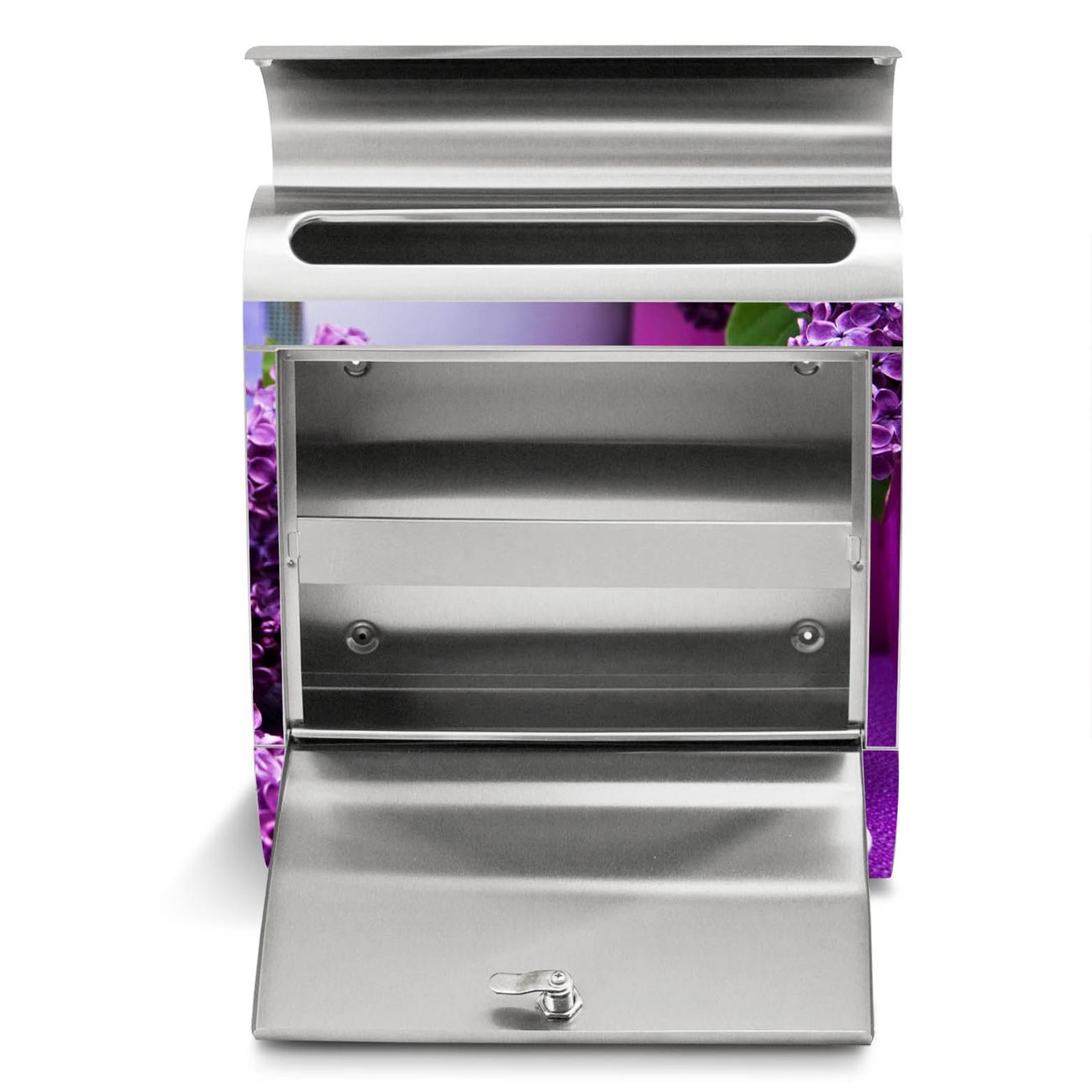 Der banjado Edelstahl Standbriefkasten mit Motiv Flieder und eigenem Wunschtext bietet Ihnen mit seinem Fassungsvermögen genügend Platz auch für große A4 Sendungen. Das integrierte Zeitungsfach eignet sich hervorragend, um unkompliziert die Tageszeitung zu fassen.