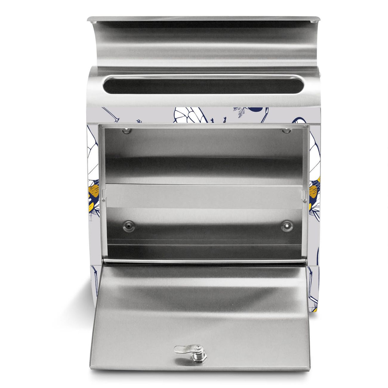 Der Motivstandbriefkasten hat ein sehr ansprechendes und ausgefallenes Design, damit entlocken Sie Ihren Nachbarn und dem Postboten ein Lächeln. Heben Sie Sich ab von der tristen grauen Masse, ohne auf Funktionalität zu verzichten. Der Briefkasten besteht aus hochwertigem 18/0 Edelstahl und die Wetter- und UV-resistenten Folie mit Fliegen und Bienen Motiv ist zusätzlich mit einem Schutzlaminat überzogen. Der Standbriefkasten wird mit Montagematerial und zwei Schlüsseln geliefert.