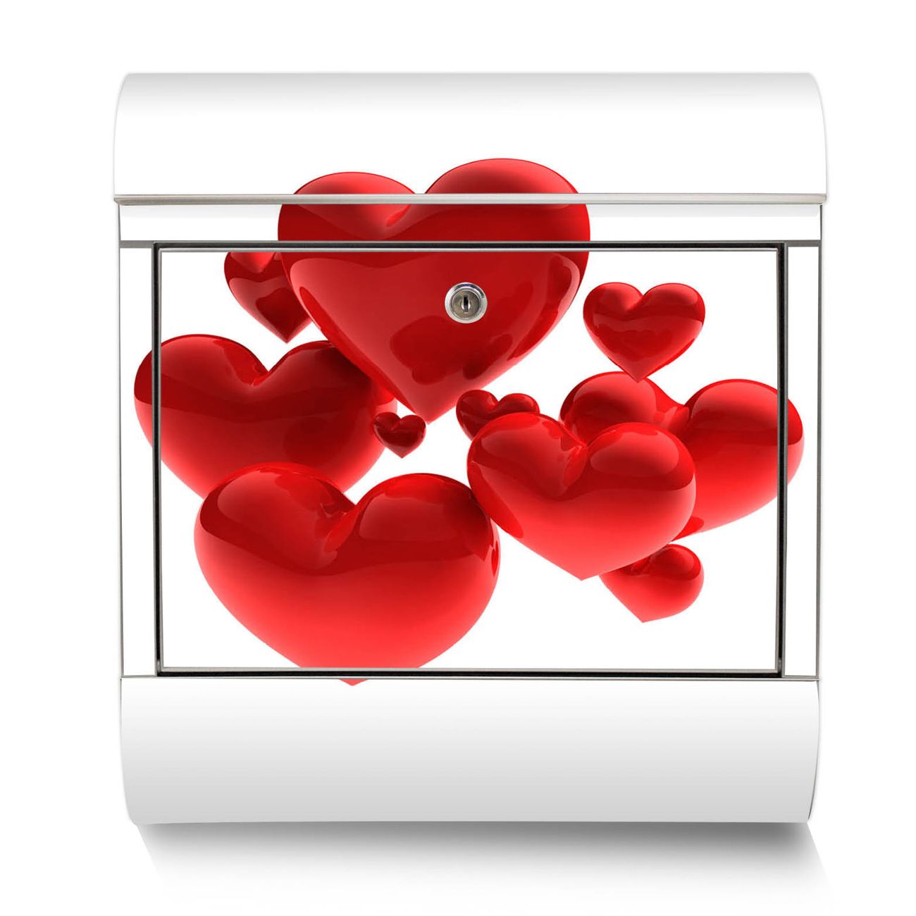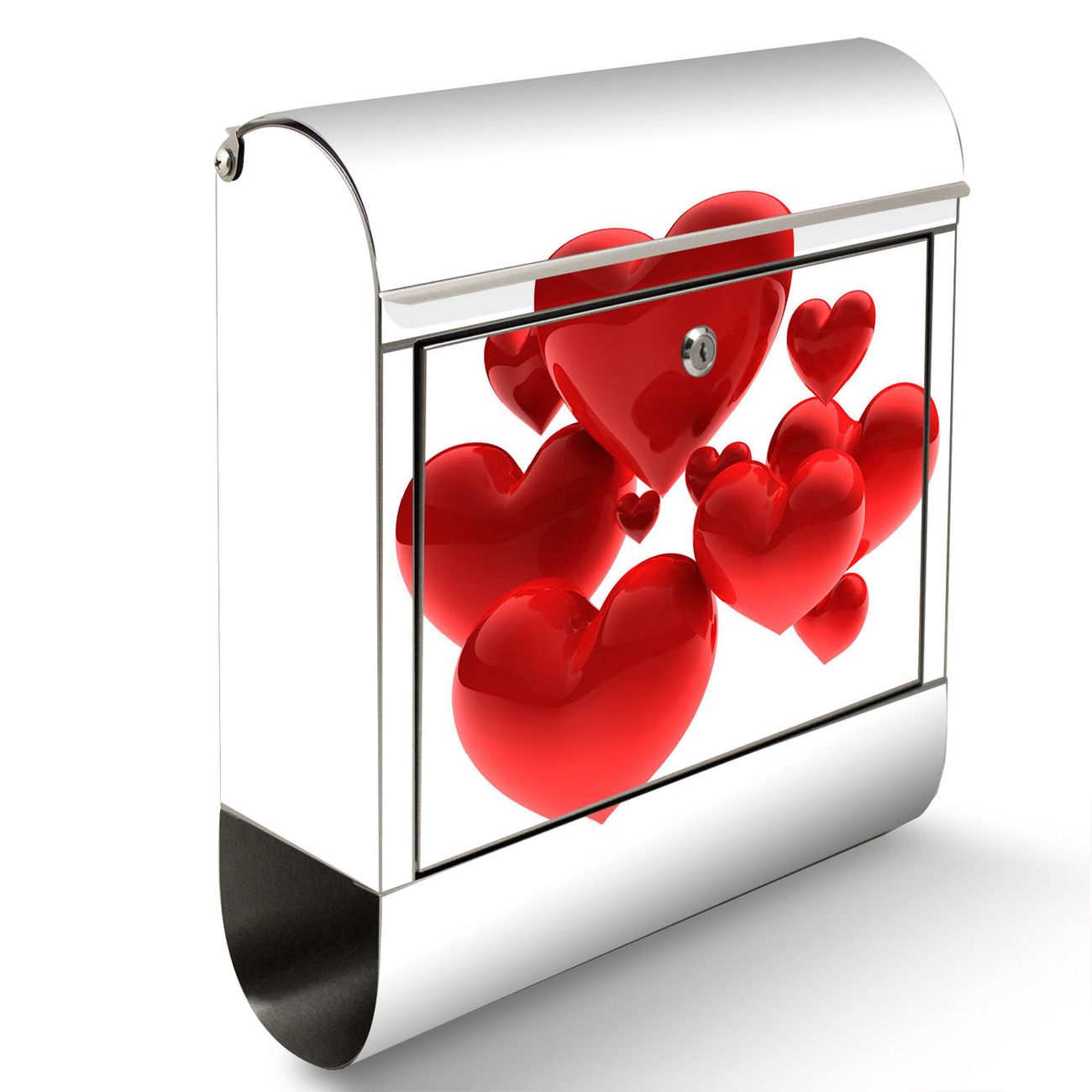 Der Motivstandbriefkasten hat ein sehr ansprechendes und ausgefallenes Design, damit entlocken Sie Ihren Nachbarn und dem Postboten ein Lächeln. Heben Sie Sich ab von der tristen grauen Masse, ohne auf Funktionalität zu verzichten. Der Briefkasten besteht aus hochwertigem 18/0 Edelstahl und die Wetter- und UV-resistenten Folie mit Fliegende Herzen Motiv ist zusätzlich mit einem Schutzlaminat überzogen. Der Standbriefkasten wird mit Montagematerial und zwei Schlüsseln geliefert.