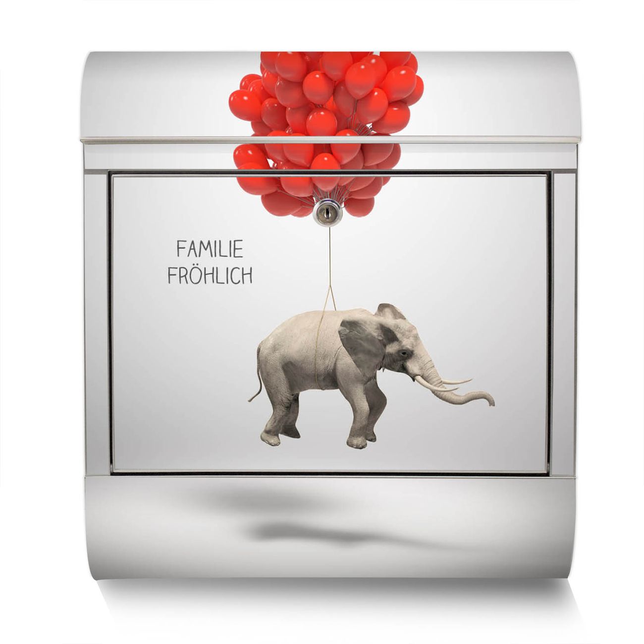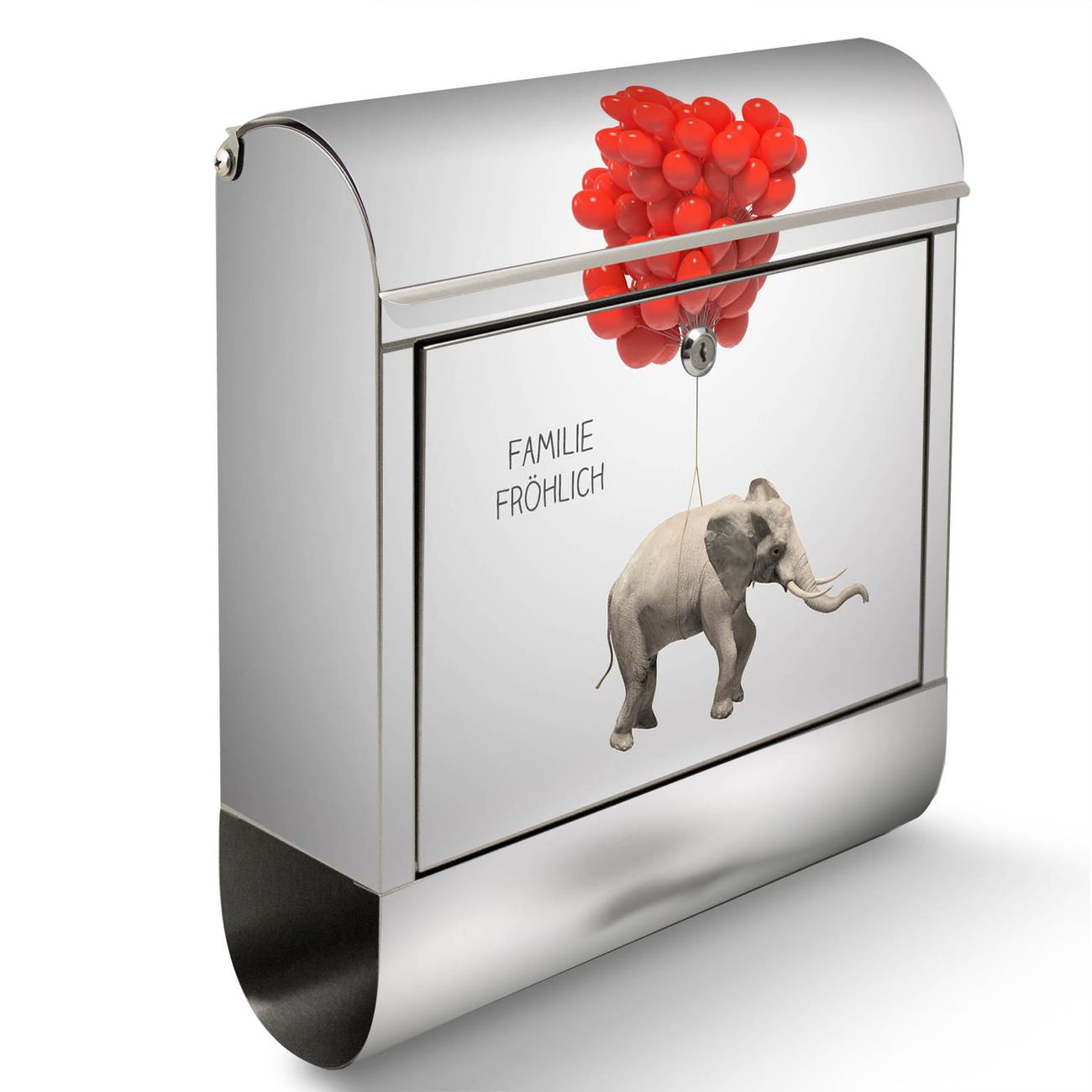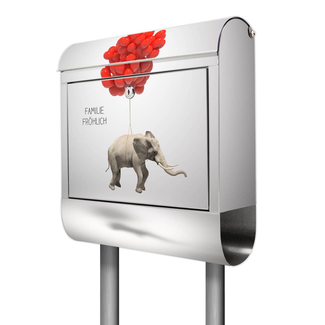 Der Motivstandbriefkasten hat ein sehr ansprechendes und ausgefallenes Design, damit entlocken Sie Ihren Nachbarn und dem Postboten ein Lächeln. Heben Sie Sich ab von der tristen grauen Masse, ohne auf Funktionalität zu verzichten. Der Briefkasten besteht aus hochwertigem 18/0 Edelstahl und die Wetter- und UV-resistenten Folie mit Fliegender Elefant Motiv ist zusätzlich mit einem Schutzlaminat überzogen. Der Standbriefkasten wird mit Montagematerial und zwei Schlüsseln geliefert.