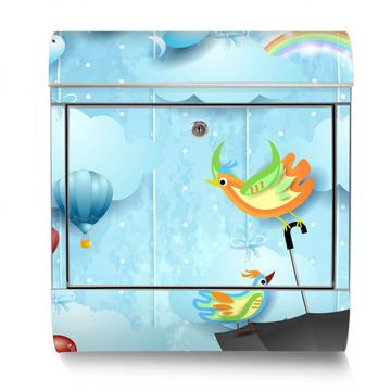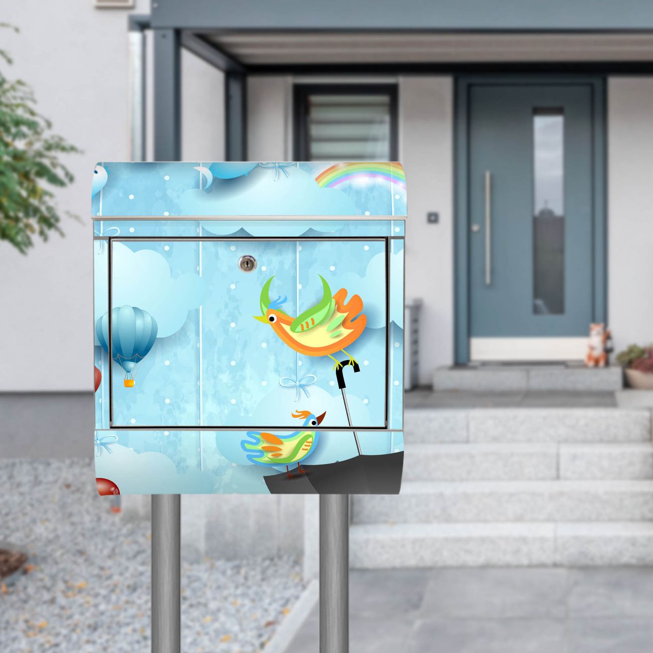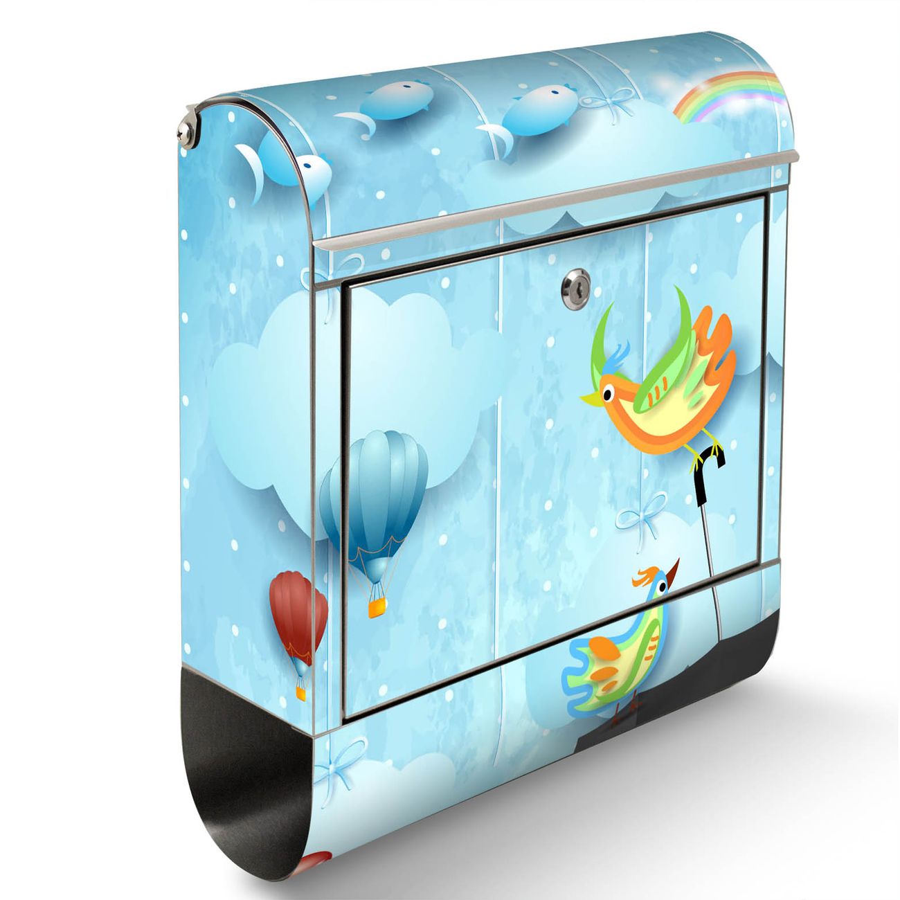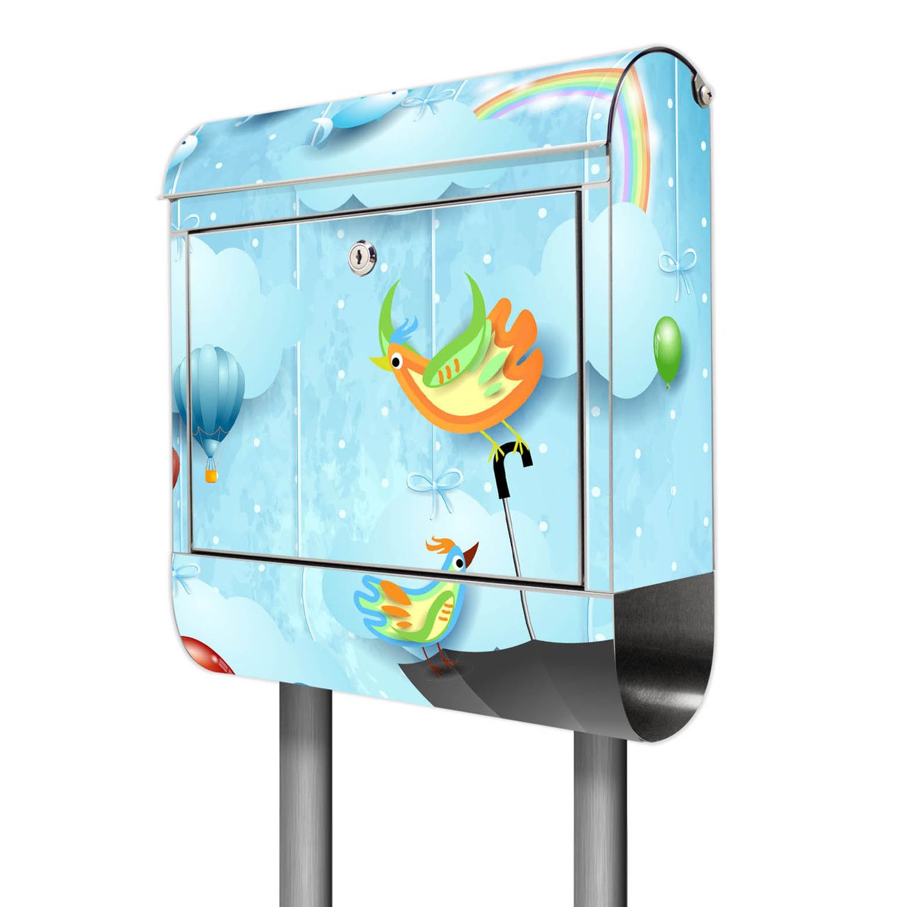 Der Motivstandbriefkasten hat ein sehr ansprechendes und ausgefallenes Design, damit entlocken Sie Ihren Nachbarn und dem Postboten ein Lächeln. Heben Sie Sich ab von der tristen grauen Masse, ohne auf Funktionalität zu verzichten. Der Briefkasten besteht aus hochwertigem 18/0 Edelstahl und die Wetter- und UV-resistenten Folie mit fliegender Regenschirm Motiv ist zusätzlich mit einem Schutzlaminat überzogen. Der Standbriefkasten wird mit Montagematerial und zwei Schlüsseln geliefert.