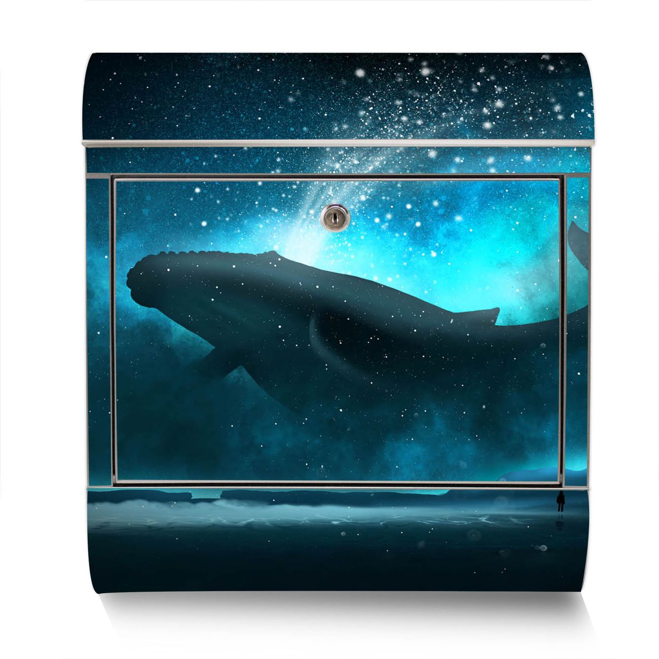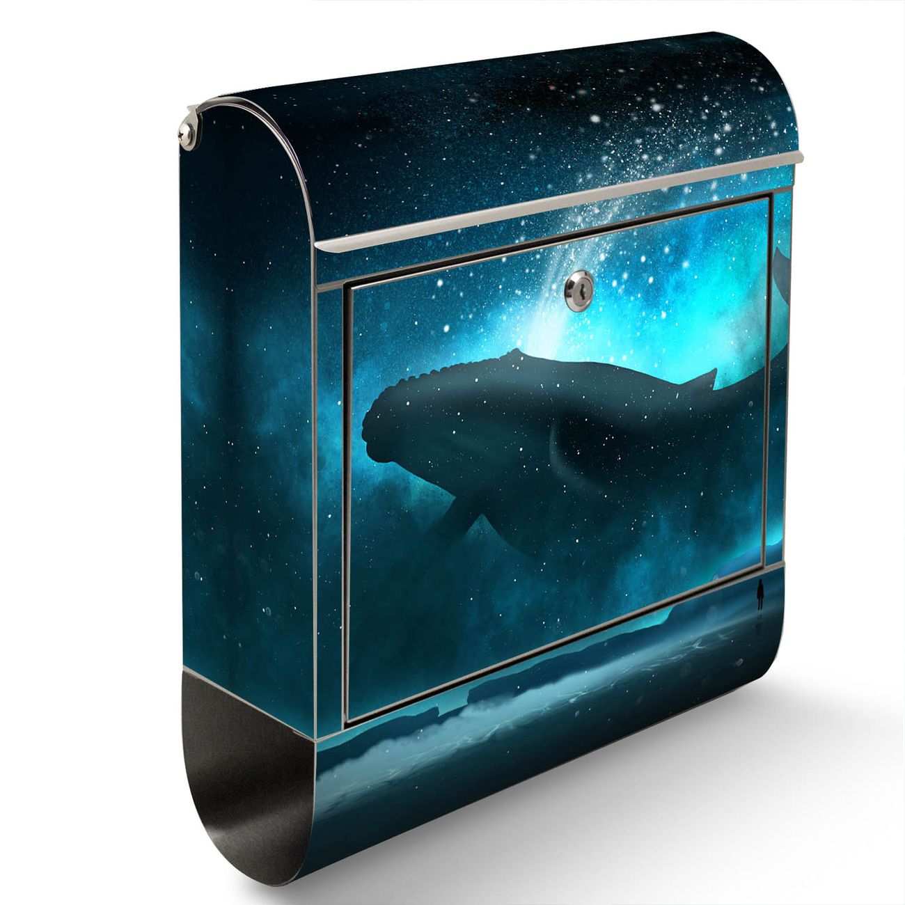 Der Motivstandbriefkasten hat ein sehr ansprechendes und ausgefallenes Design, damit entlocken Sie Ihren Nachbarn und dem Postboten ein Lächeln. Heben Sie Sich ab von der tristen grauen Masse, ohne auf Funktionalität zu verzichten. Der Briefkasten besteht aus hochwertigem 18/0 Edelstahl und die Wetter- und UV-resistenten Folie mit fliegender Wal Motiv ist zusätzlich mit einem Schutzlaminat überzogen. Der Standbriefkasten wird mit Montagematerial und zwei Schlüsseln geliefert.