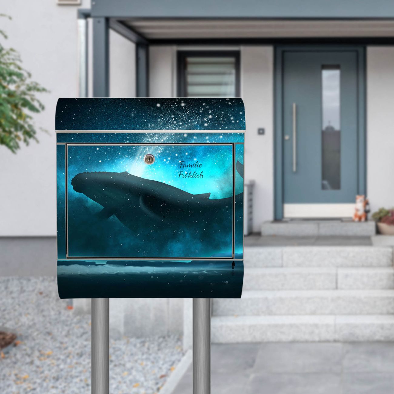 Der Motivstandbriefkasten hat ein sehr ansprechendes und ausgefallenes Design, damit entlocken Sie Ihren Nachbarn und dem Postboten ein Lächeln. Heben Sie Sich ab von der tristen grauen Masse, ohne auf Funktionalität zu verzichten. Der Briefkasten besteht aus hochwertigem 18/0 Edelstahl und die Wetter- und UV-resistenten Folie mit fliegender Wal Motiv ist zusätzlich mit einem Schutzlaminat überzogen. Der Standbriefkasten wird mit Montagematerial und zwei Schlüsseln geliefert.