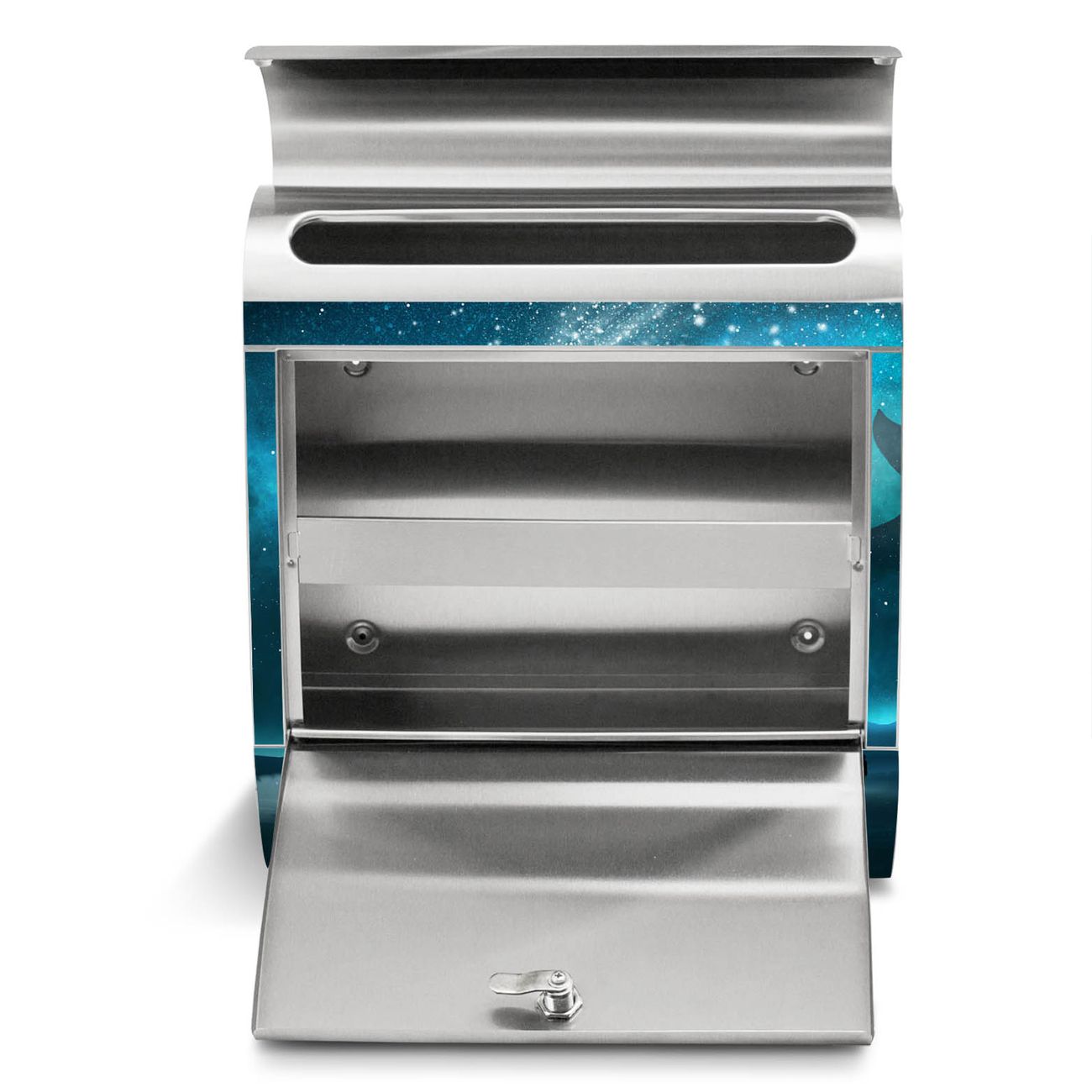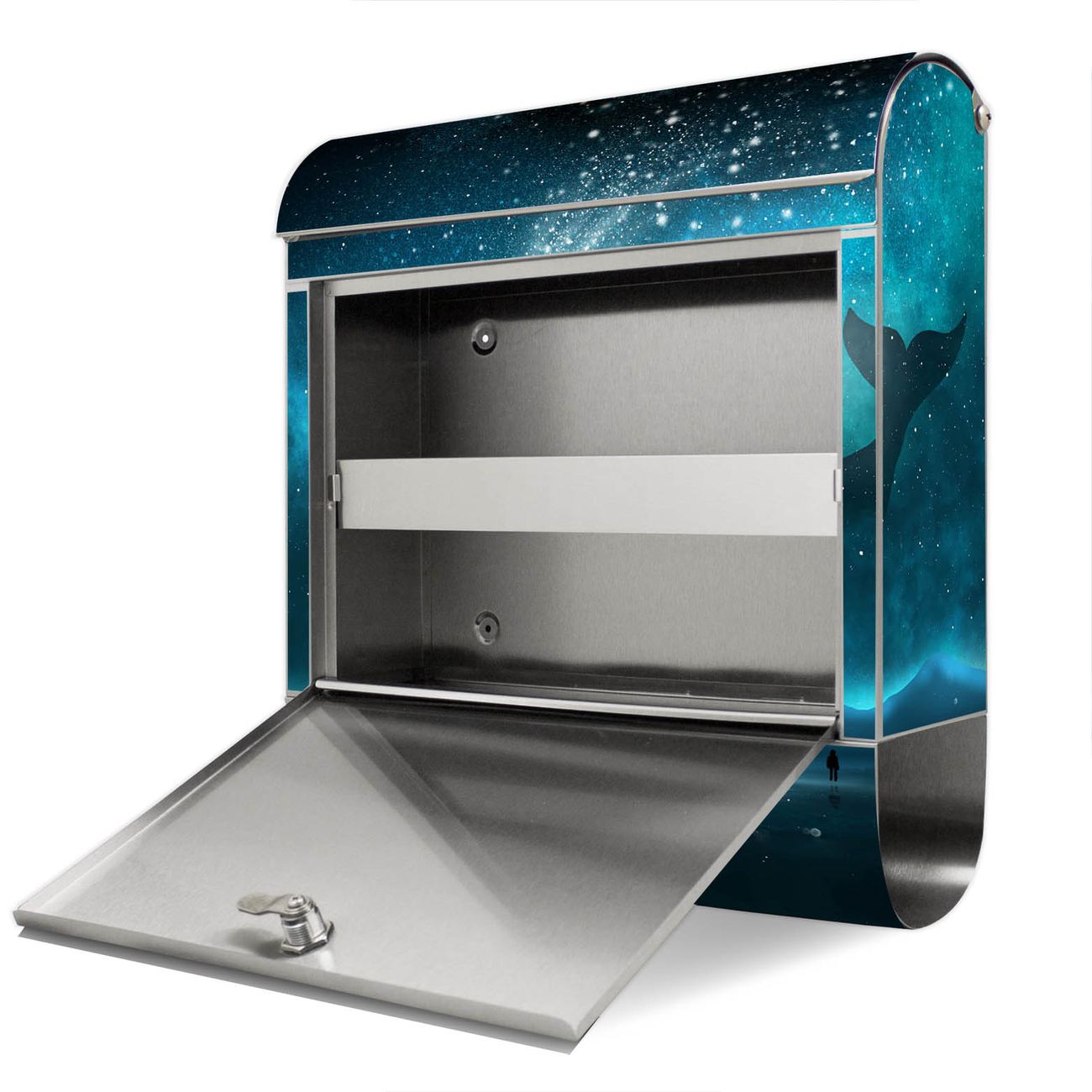 Der banjado Edelstahl Standbriefkasten mit Motiv fliegender Wal und eigenem Wunschtext bietet Ihnen mit seinem Fassungsvermögen genügend Platz auch für große A4 Sendungen. Das integrierte Zeitungsfach eignet sich hervorragend, um unkompliziert die Tageszeitung zu fassen.