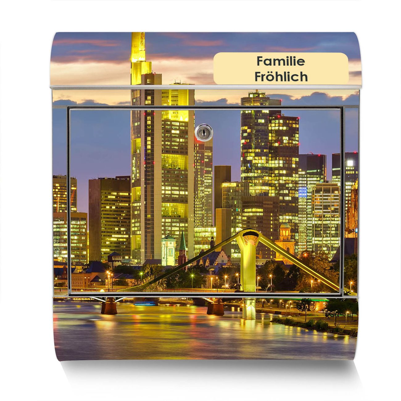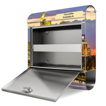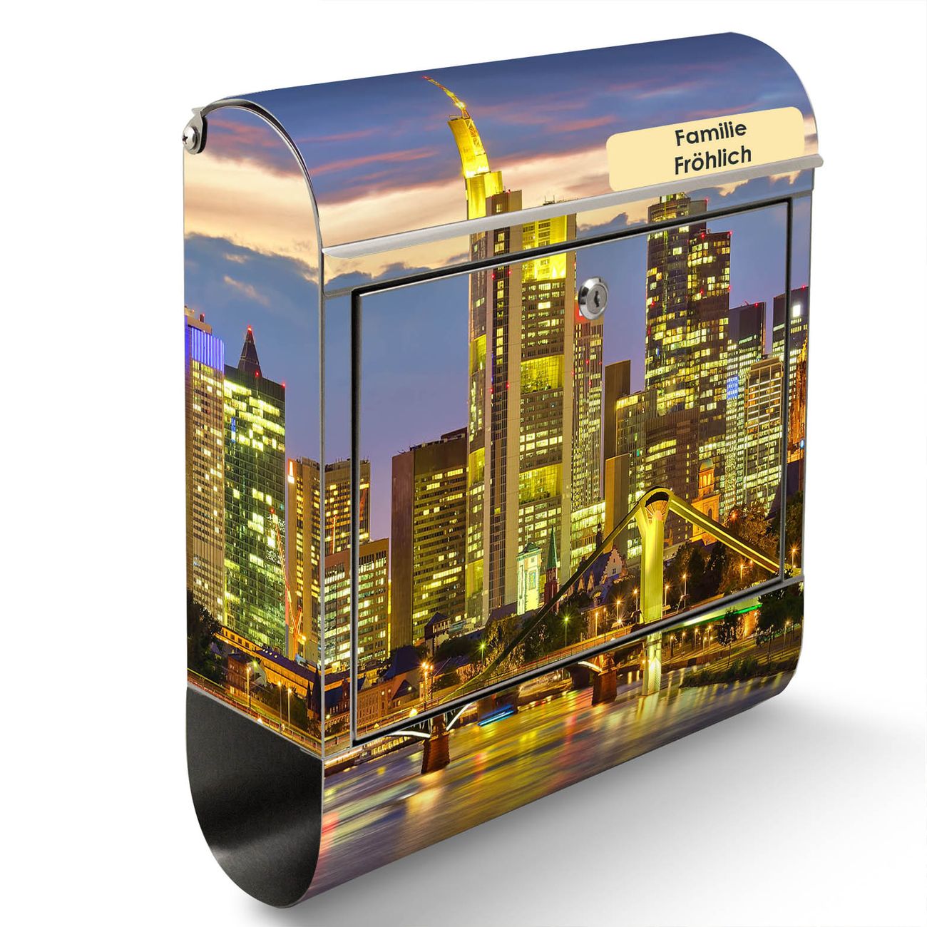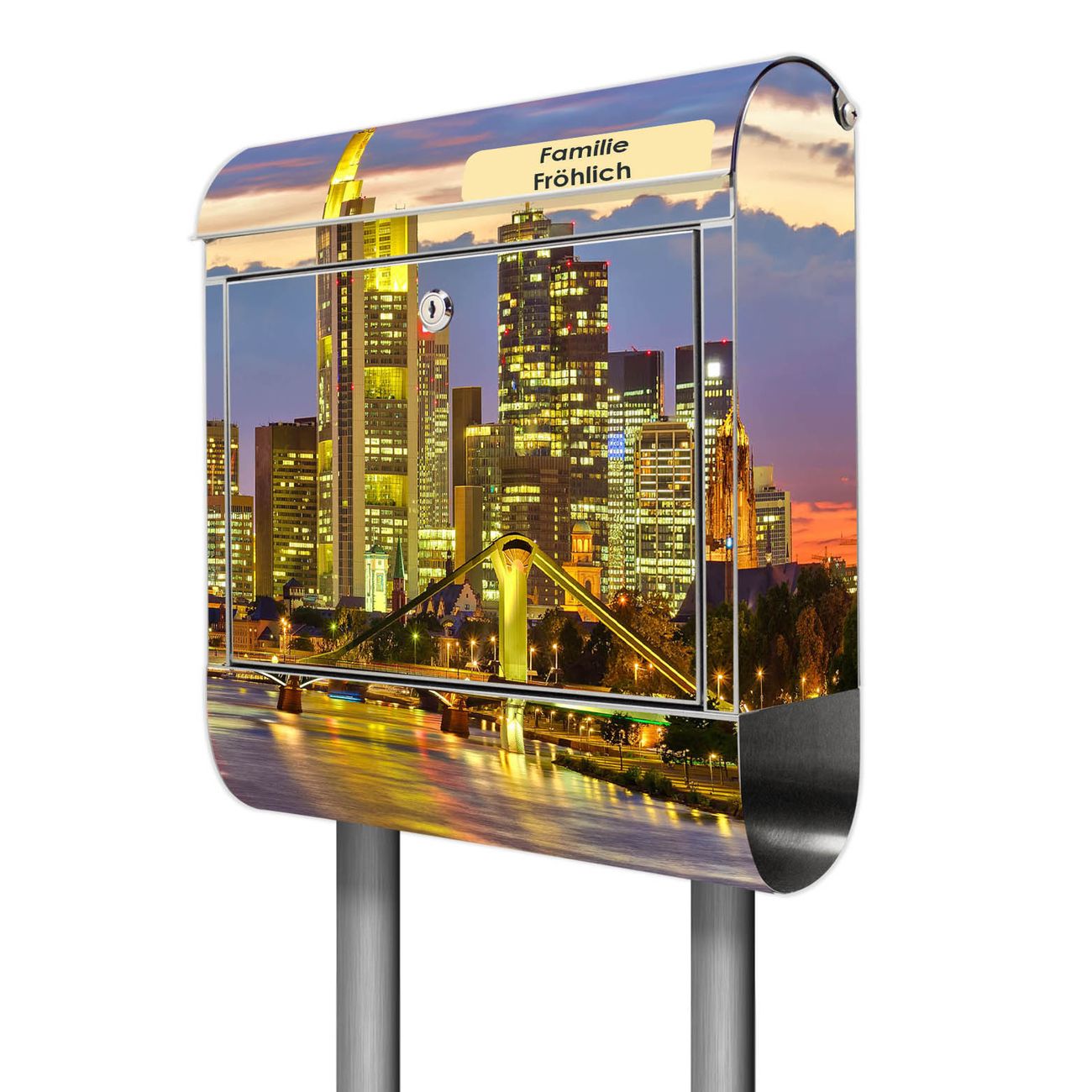 Der banjado Edelstahl Standbriefkasten mit Motiv Frankfurt Main und eigenem Wunschtext bietet Ihnen mit seinem Fassungsvermögen genügend Platz auch für große A4 Sendungen. Das integrierte Zeitungsfach eignet sich hervorragend, um unkompliziert die Tageszeitung zu fassen.
