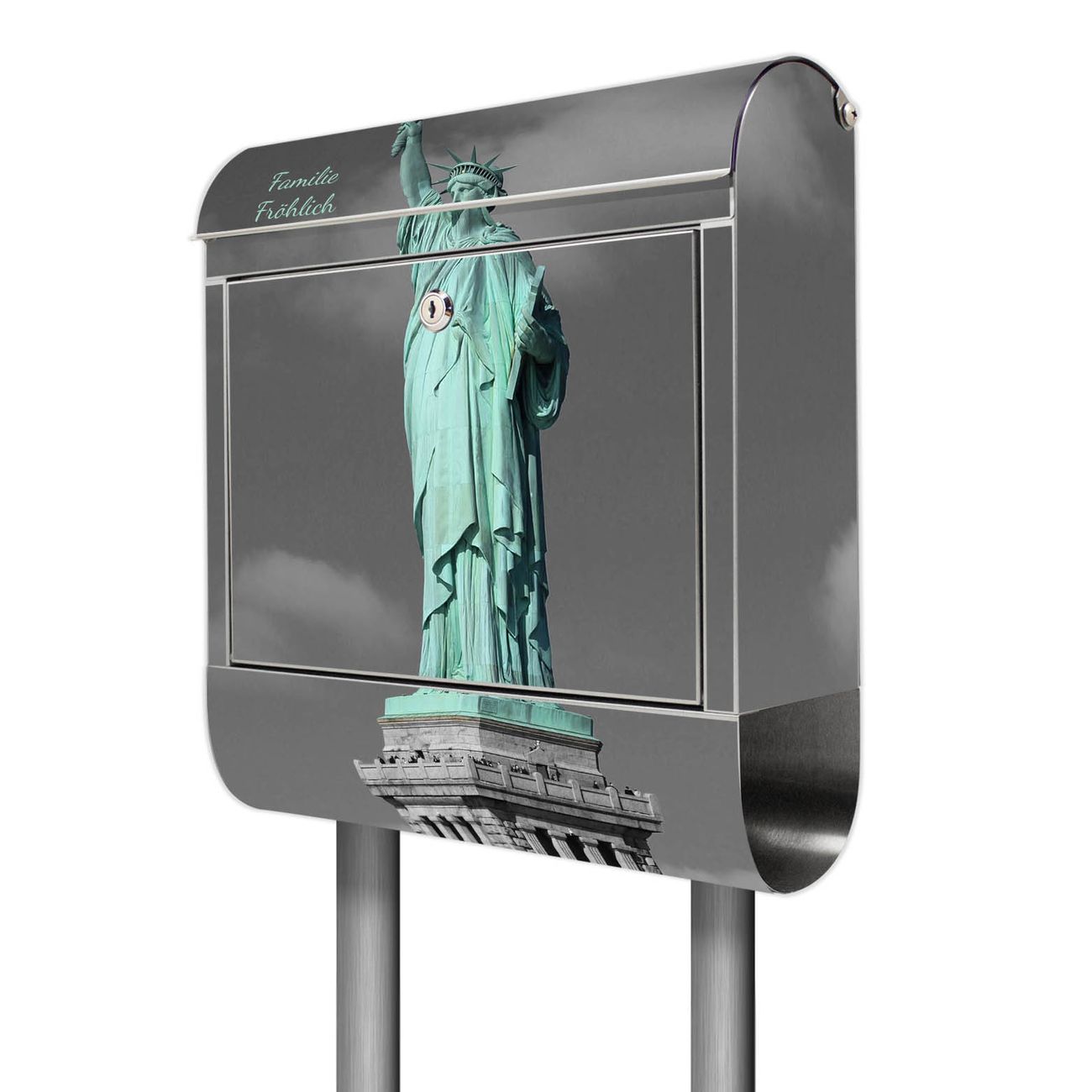 Der Motivstandbriefkasten hat ein sehr ansprechendes und ausgefallenes Design, damit entlocken Sie Ihren Nachbarn und dem Postboten ein Lächeln. Heben Sie Sich ab von der tristen grauen Masse, ohne auf Funktionalität zu verzichten. Der Briefkasten besteht aus hochwertigem 18/0 Edelstahl und die Wetter- und UV-resistenten Folie mit Freiheitsstatue Motiv ist zusätzlich mit einem Schutzlaminat überzogen. Der Standbriefkasten wird mit Montagematerial und zwei Schlüsseln geliefert.