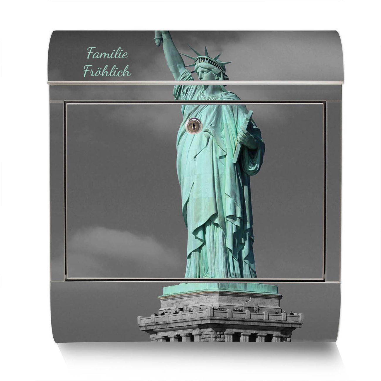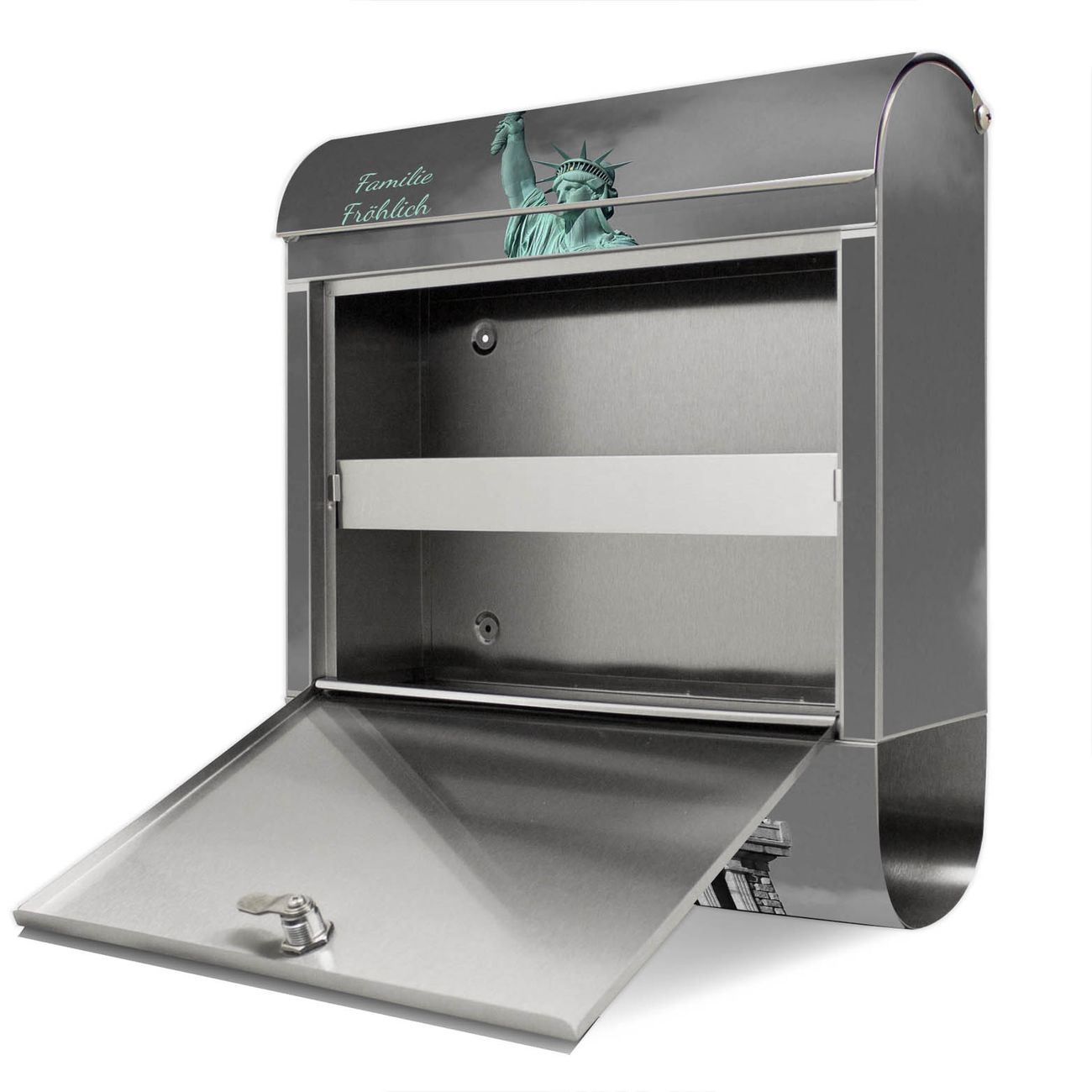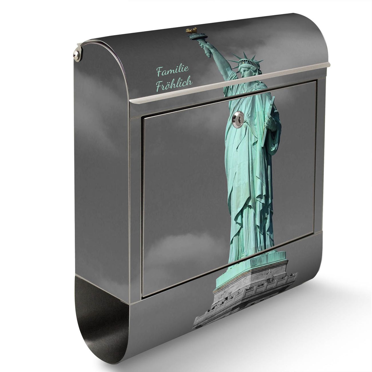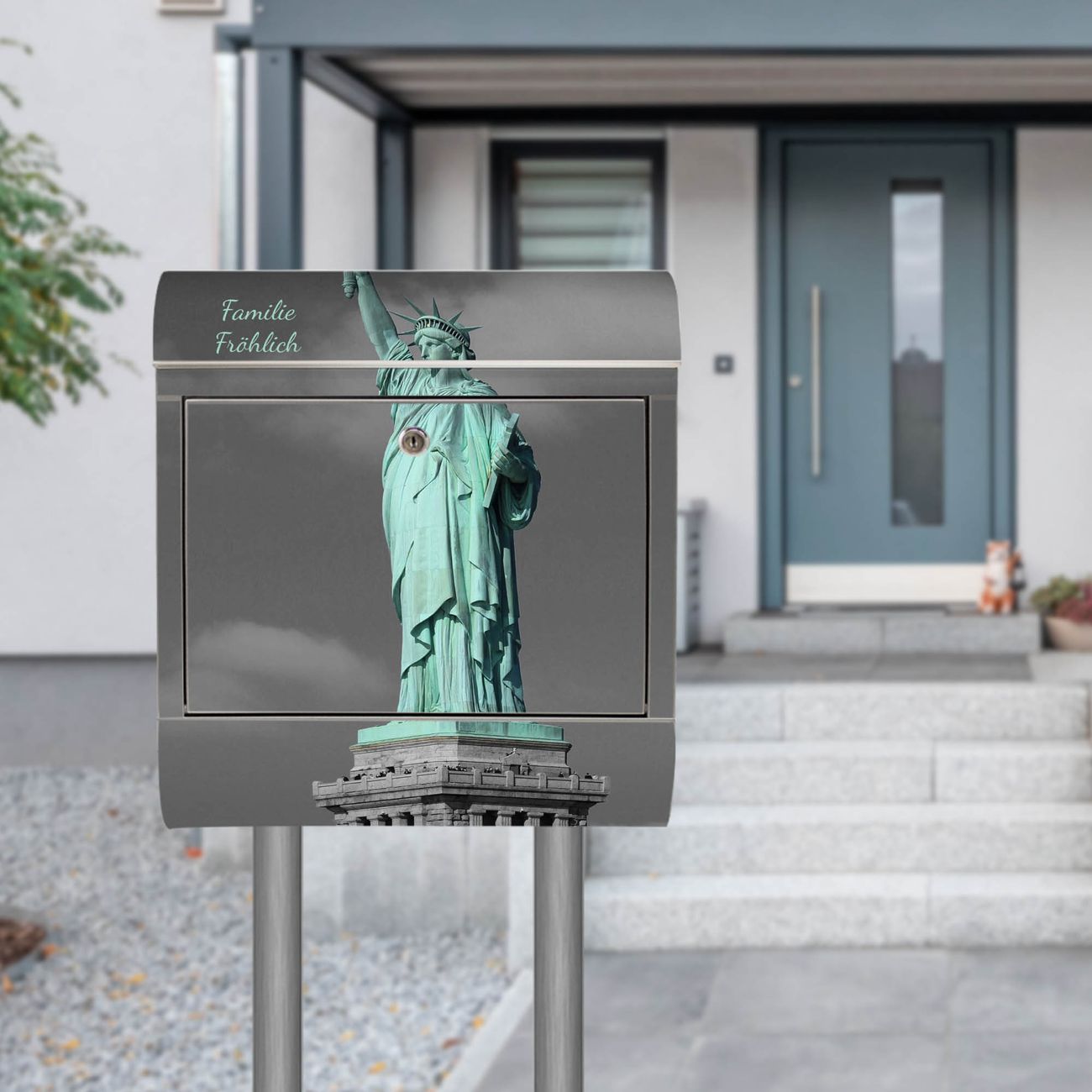 Der banjado Edelstahl Standbriefkasten mit Motiv Freiheitsstatue und eigenem Wunschtext bietet Ihnen mit seinem Fassungsvermögen genügend Platz auch für große A4 Sendungen. Das integrierte Zeitungsfach eignet sich hervorragend, um unkompliziert die Tageszeitung zu fassen.