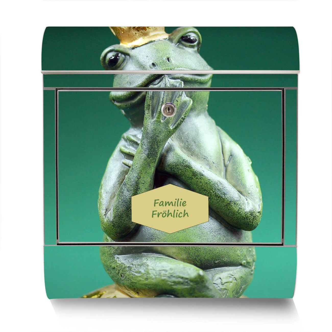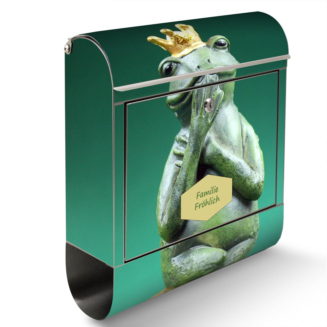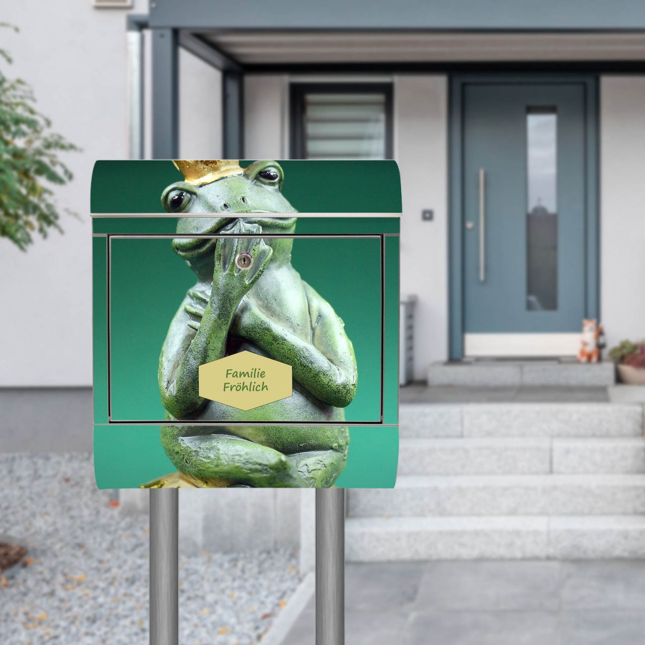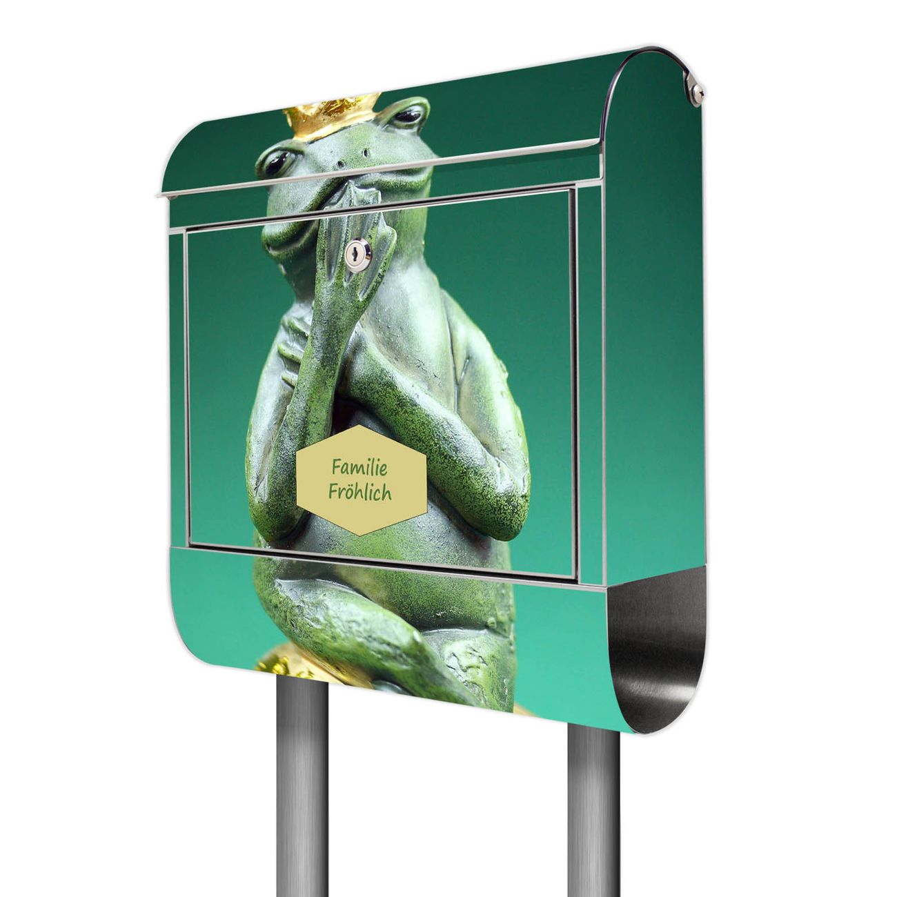 Der banjado Edelstahl Standbriefkasten mit Motiv Froschkönig und eigenem Wunschtext bietet Ihnen mit seinem Fassungsvermögen genügend Platz auch für große A4 Sendungen. Das integrierte Zeitungsfach eignet sich hervorragend, um unkompliziert die Tageszeitung zu fassen.