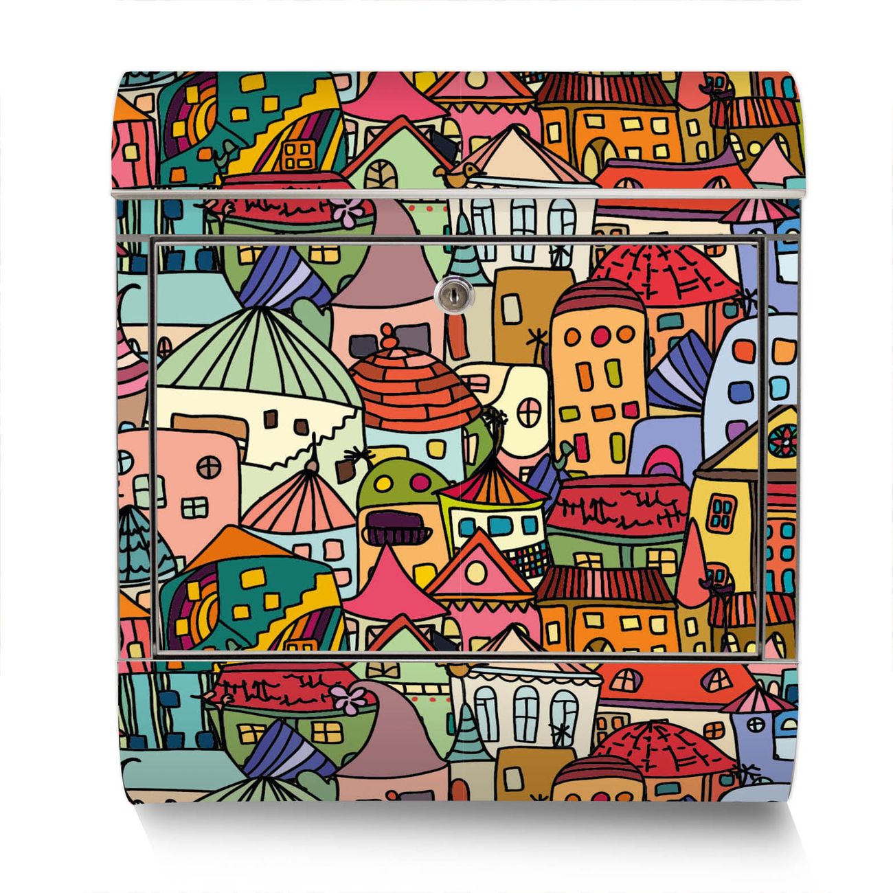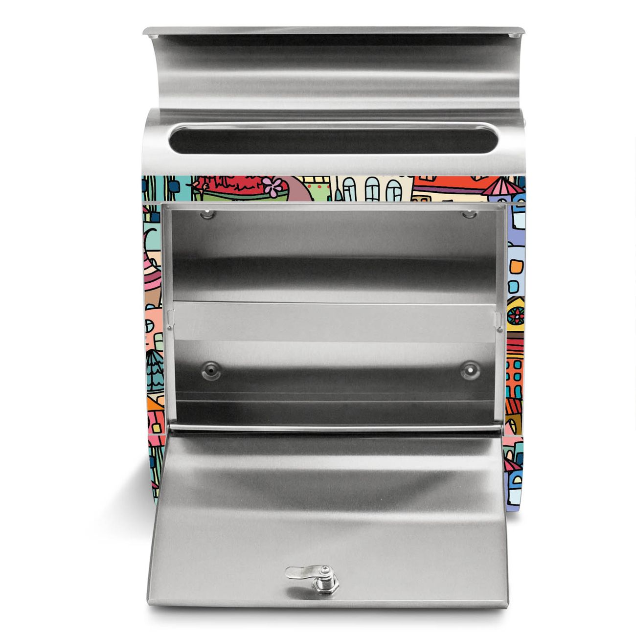 Der banjado Edelstahl Standbriefkasten mit Motiv Funky Town bietet Ihnen mit seinem Fassungsvermögen genügend Platz auch für große A4 Sendungen. Das integrierte Zeitungsfach eignet sich hervorragend, um unkompliziert die Tageszeitung zu fassen.