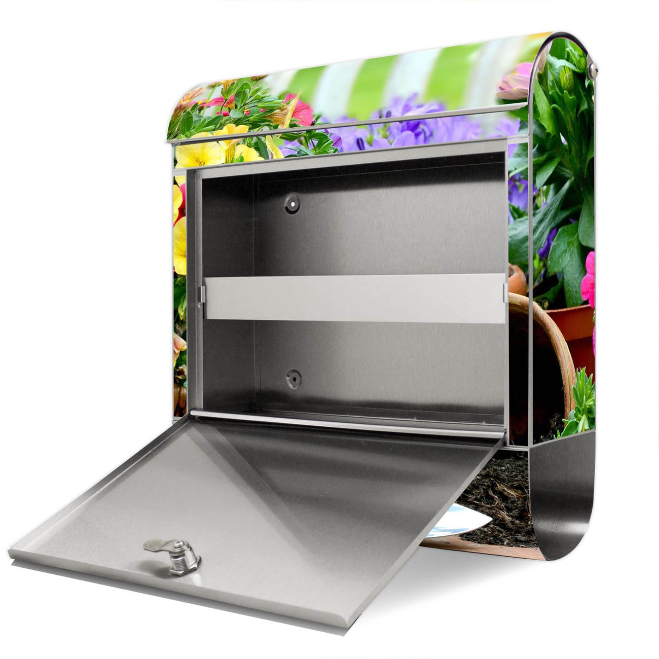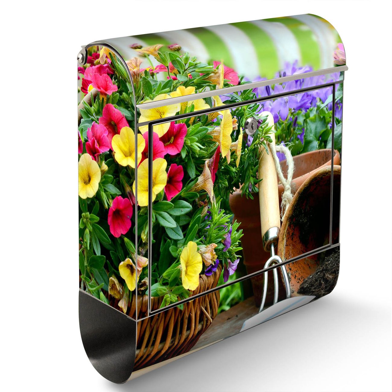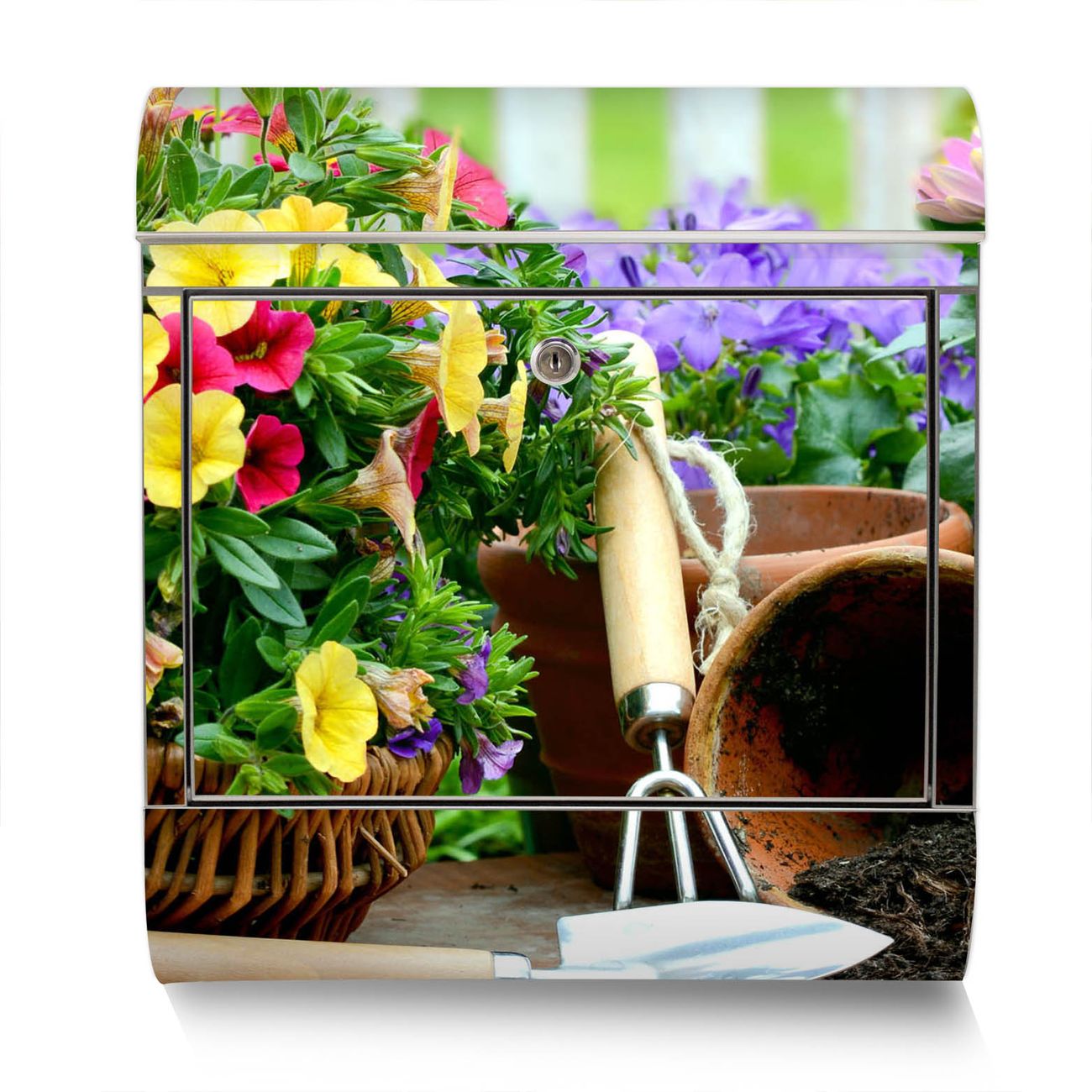 Der Motivstandbriefkasten hat ein sehr ansprechendes und ausgefallenes Design, damit entlocken Sie Ihren Nachbarn und dem Postboten ein Lächeln. Heben Sie Sich ab von der tristen grauen Masse, ohne auf Funktionalität zu verzichten. Der Briefkasten besteht aus hochwertigem 18/0 Edelstahl und die Wetter- und UV-resistenten Folie mit Gartenfreude Motiv ist zusätzlich mit einem Schutzlaminat überzogen. Der Standbriefkasten wird mit Montagematerial und zwei Schlüsseln geliefert.