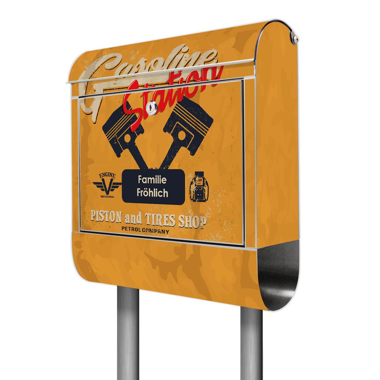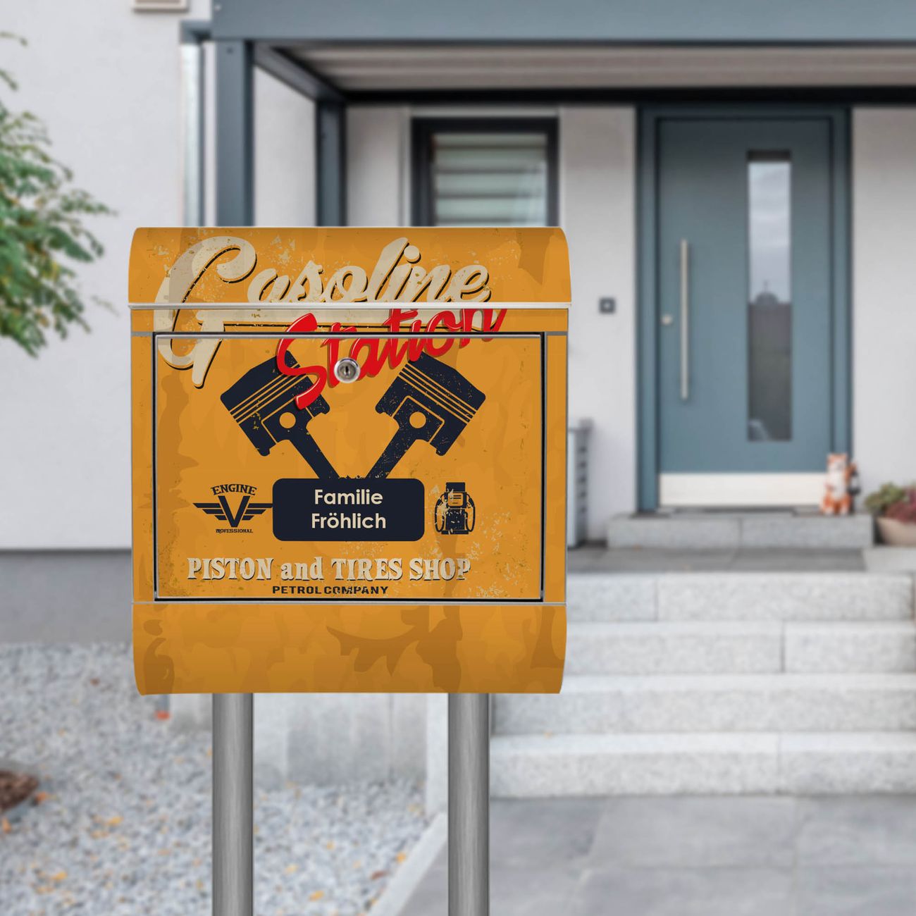 Der Motivstandbriefkasten hat ein sehr ansprechendes und ausgefallenes Design, damit entlocken Sie Ihren Nachbarn und dem Postboten ein Lächeln. Heben Sie Sich ab von der tristen grauen Masse, ohne auf Funktionalität zu verzichten. Der Briefkasten besteht aus hochwertigem 18/0 Edelstahl und die Wetter- und UV-resistenten Folie mit Gasoline Station Motiv ist zusätzlich mit einem Schutzlaminat überzogen. Der Standbriefkasten wird mit Montagematerial und zwei Schlüsseln geliefert.
