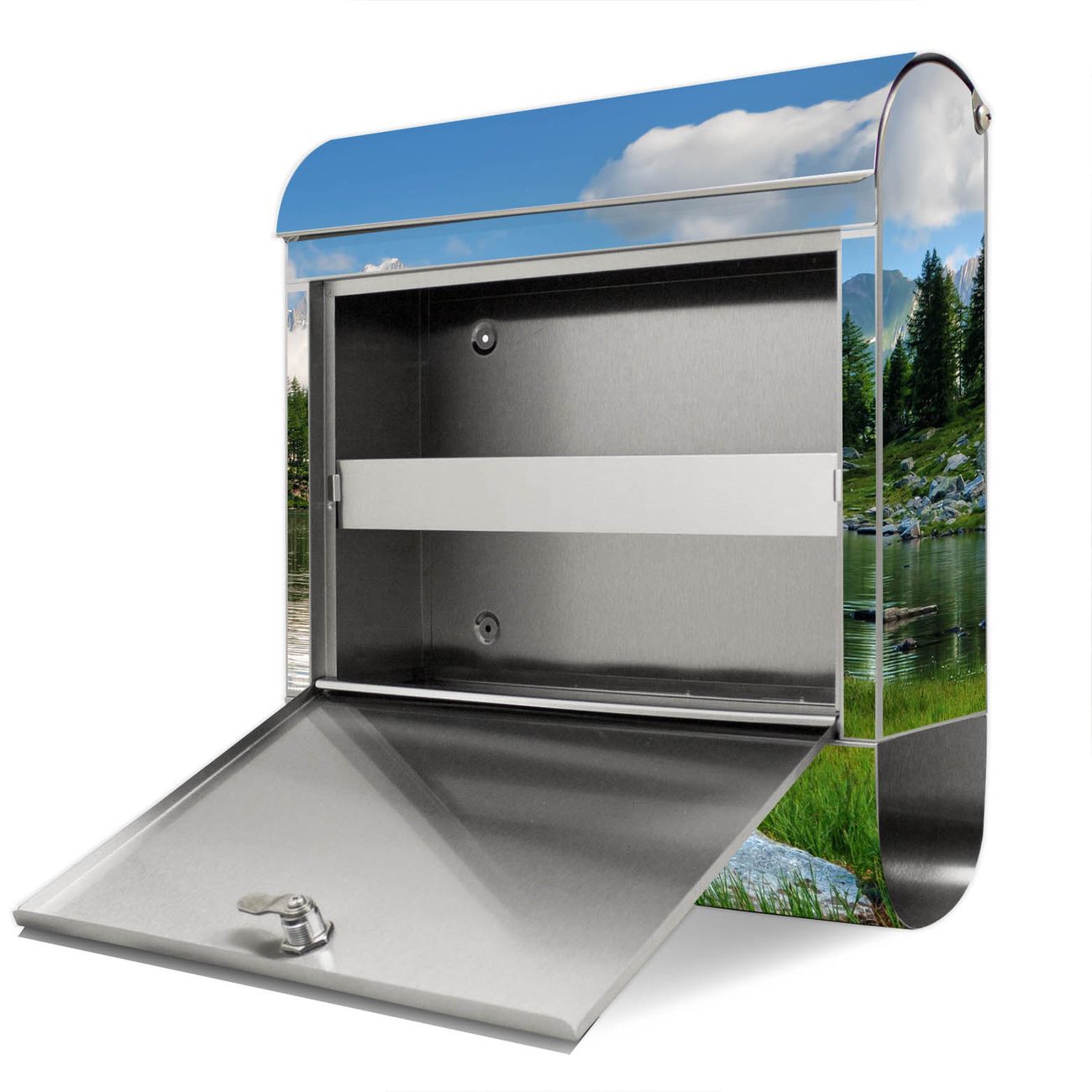 Der Motivstandbriefkasten hat ein sehr ansprechendes und ausgefallenes Design, damit entlocken Sie Ihren Nachbarn und dem Postboten ein Lächeln. Heben Sie Sich ab von der tristen grauen Masse, ohne auf Funktionalität zu verzichten. Der Briefkasten besteht aus hochwertigem 18/0 Edelstahl und die Wetter- und UV-resistenten Folie mit Gebirgssee Motiv ist zusätzlich mit einem Schutzlaminat überzogen. Der Standbriefkasten wird mit Montagematerial und zwei Schlüsseln geliefert.