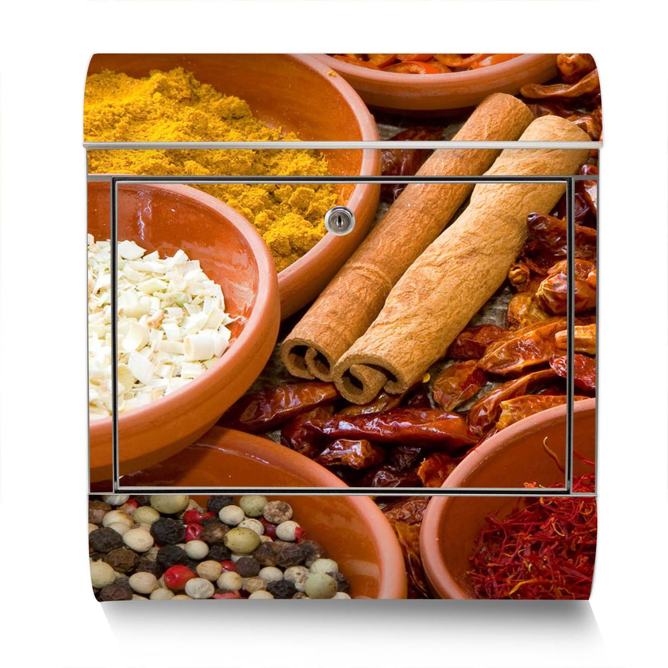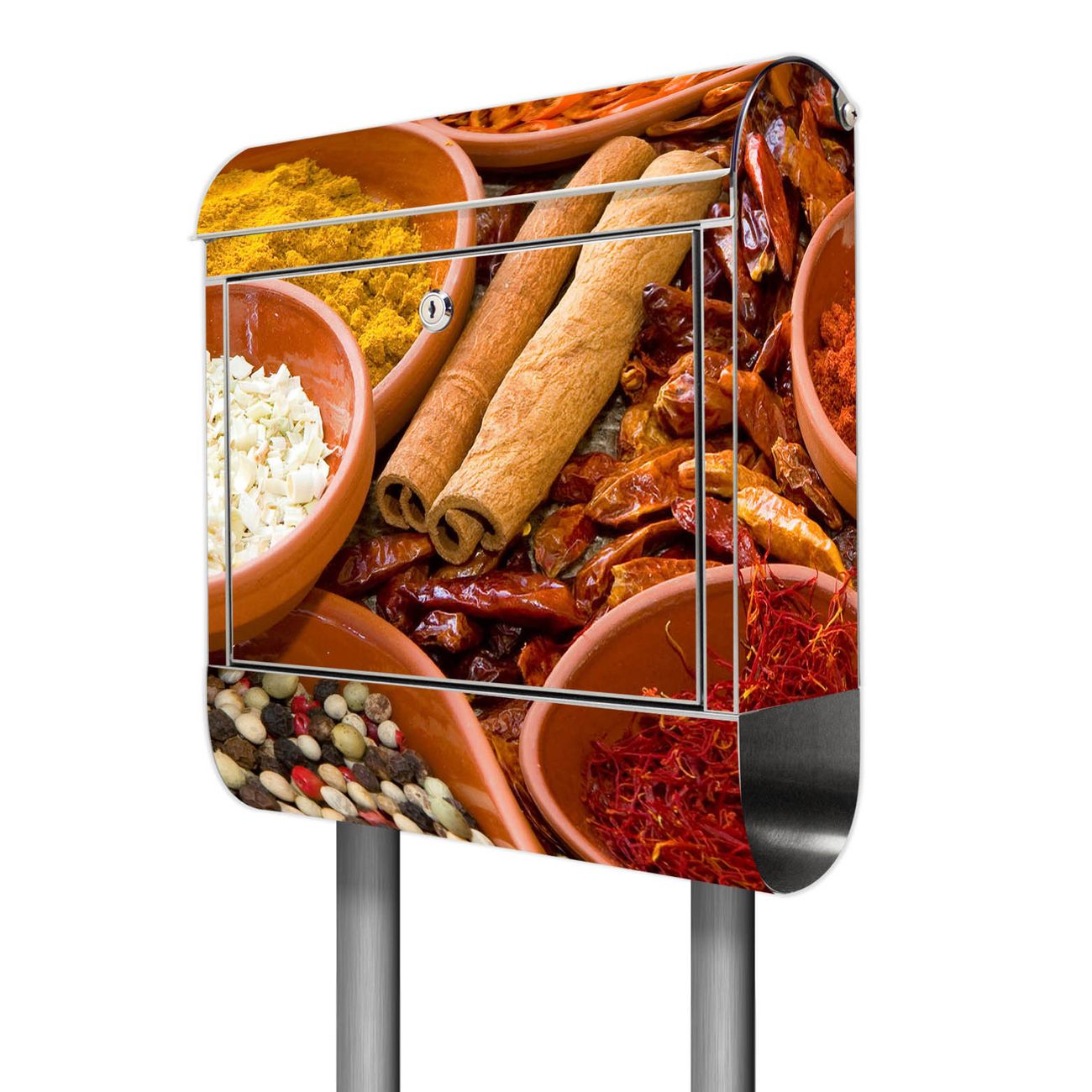 Der Motivstandbriefkasten hat ein sehr ansprechendes und ausgefallenes Design, damit entlocken Sie Ihren Nachbarn und dem Postboten ein Lächeln. Heben Sie Sich ab von der tristen grauen Masse, ohne auf Funktionalität zu verzichten. Der Briefkasten besteht aus hochwertigem 18/0 Edelstahl und die Wetter- und UV-resistenten Folie mit Gewürze Motiv ist zusätzlich mit einem Schutzlaminat überzogen. Der Standbriefkasten wird mit Montagematerial und zwei Schlüsseln geliefert.
