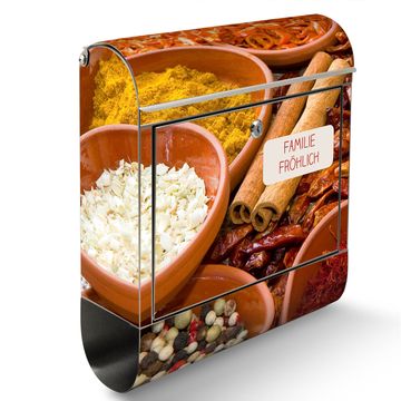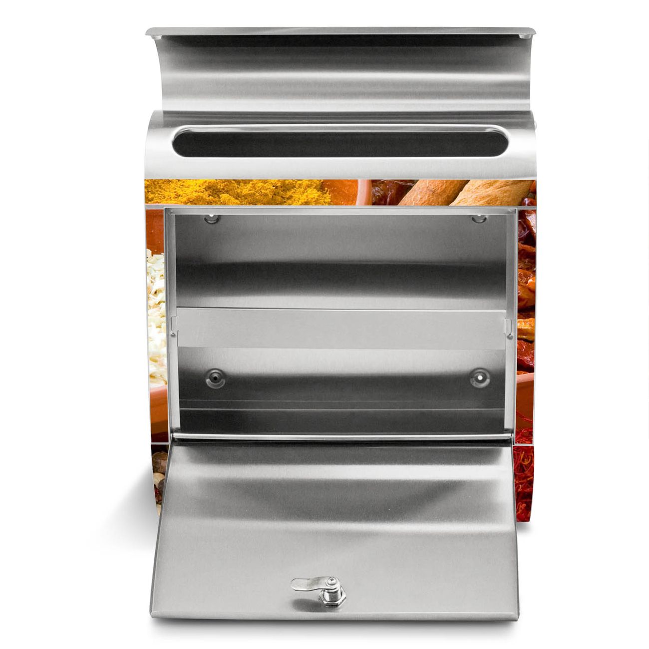 Der banjado Edelstahl Standbriefkasten mit Motiv Gewürze und eigenem Wunschtext bietet Ihnen mit seinem Fassungsvermögen genügend Platz auch für große A4 Sendungen. Das integrierte Zeitungsfach eignet sich hervorragend, um unkompliziert die Tageszeitung zu fassen.