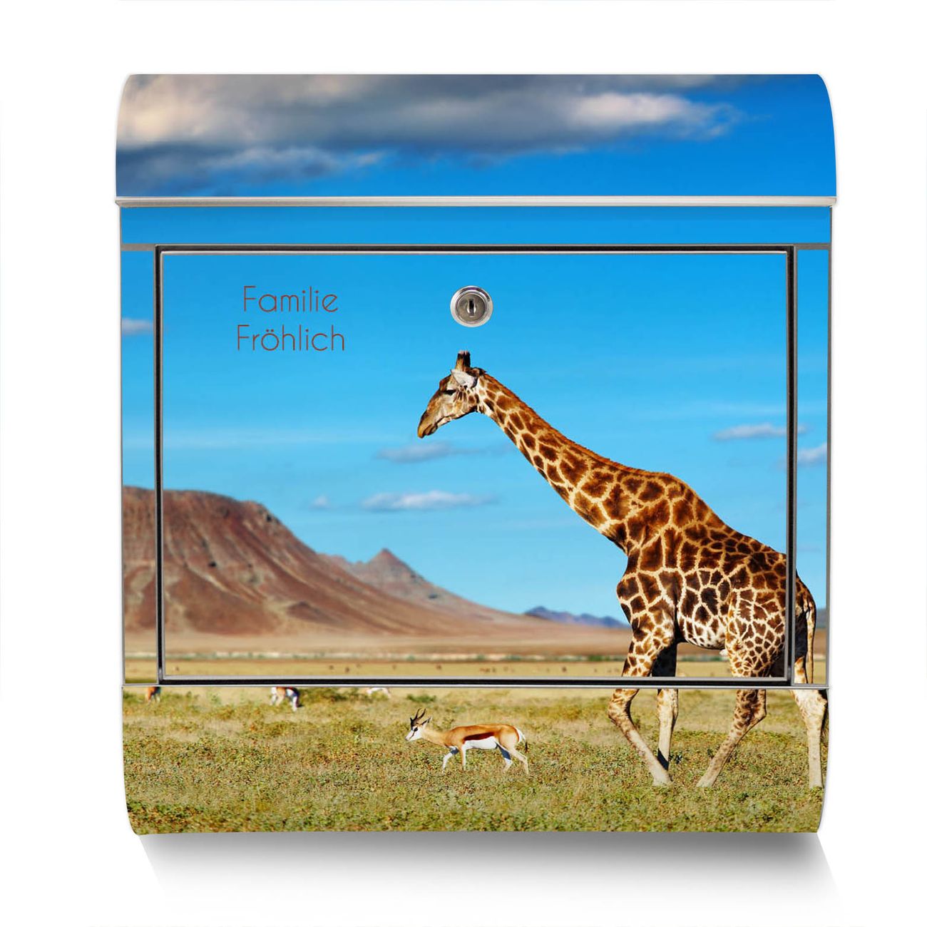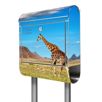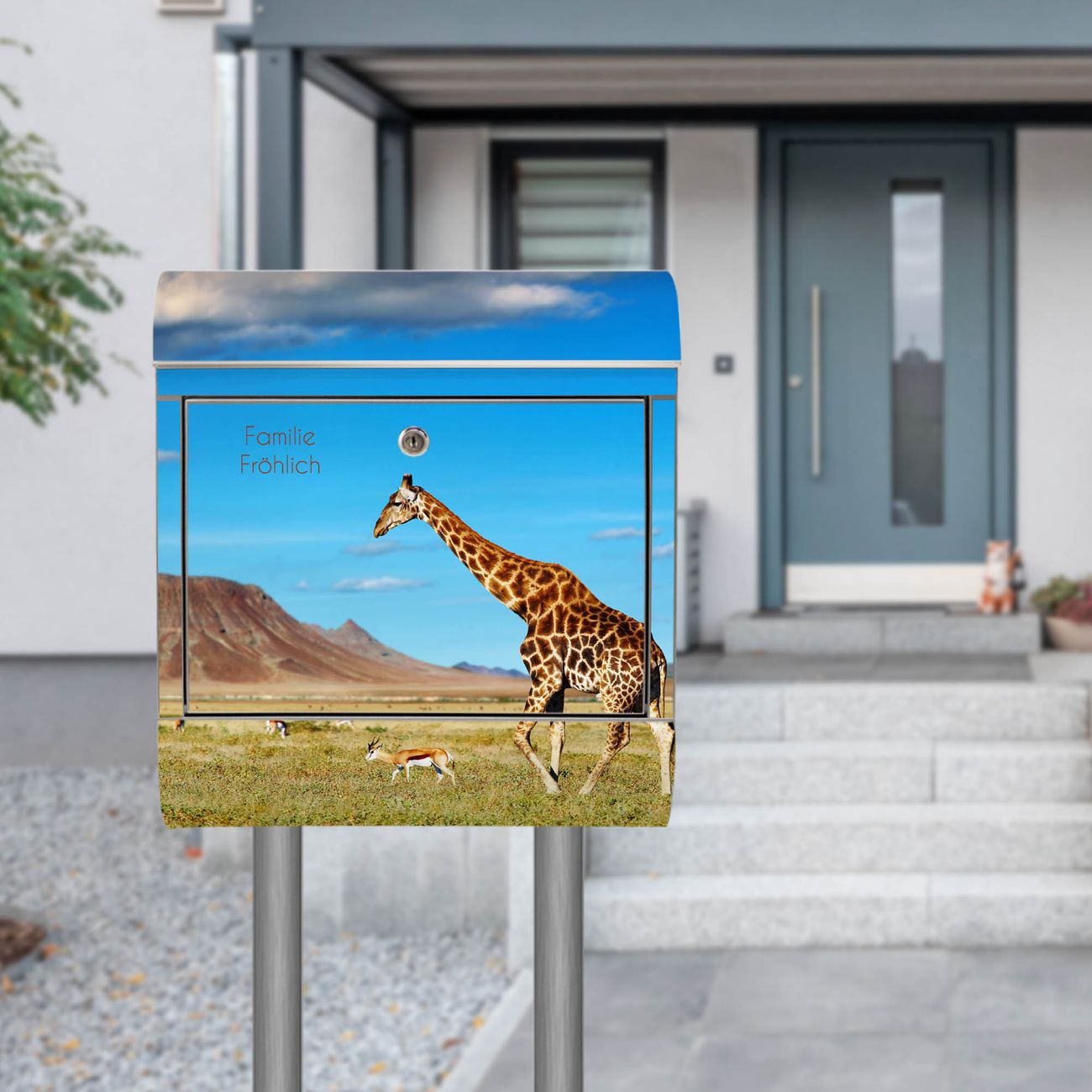 Der banjado Edelstahl Standbriefkasten mit Motiv Giraffe und eigenem Wunschtext bietet Ihnen mit seinem Fassungsvermögen genügend Platz auch für große A4 Sendungen. Das integrierte Zeitungsfach eignet sich hervorragend, um unkompliziert die Tageszeitung zu fassen.