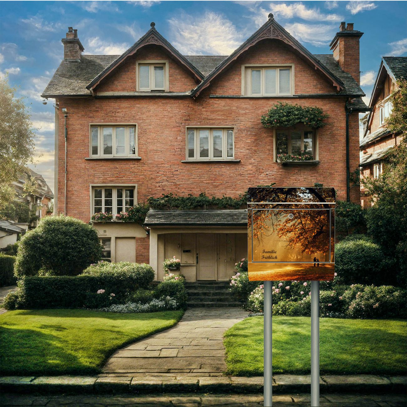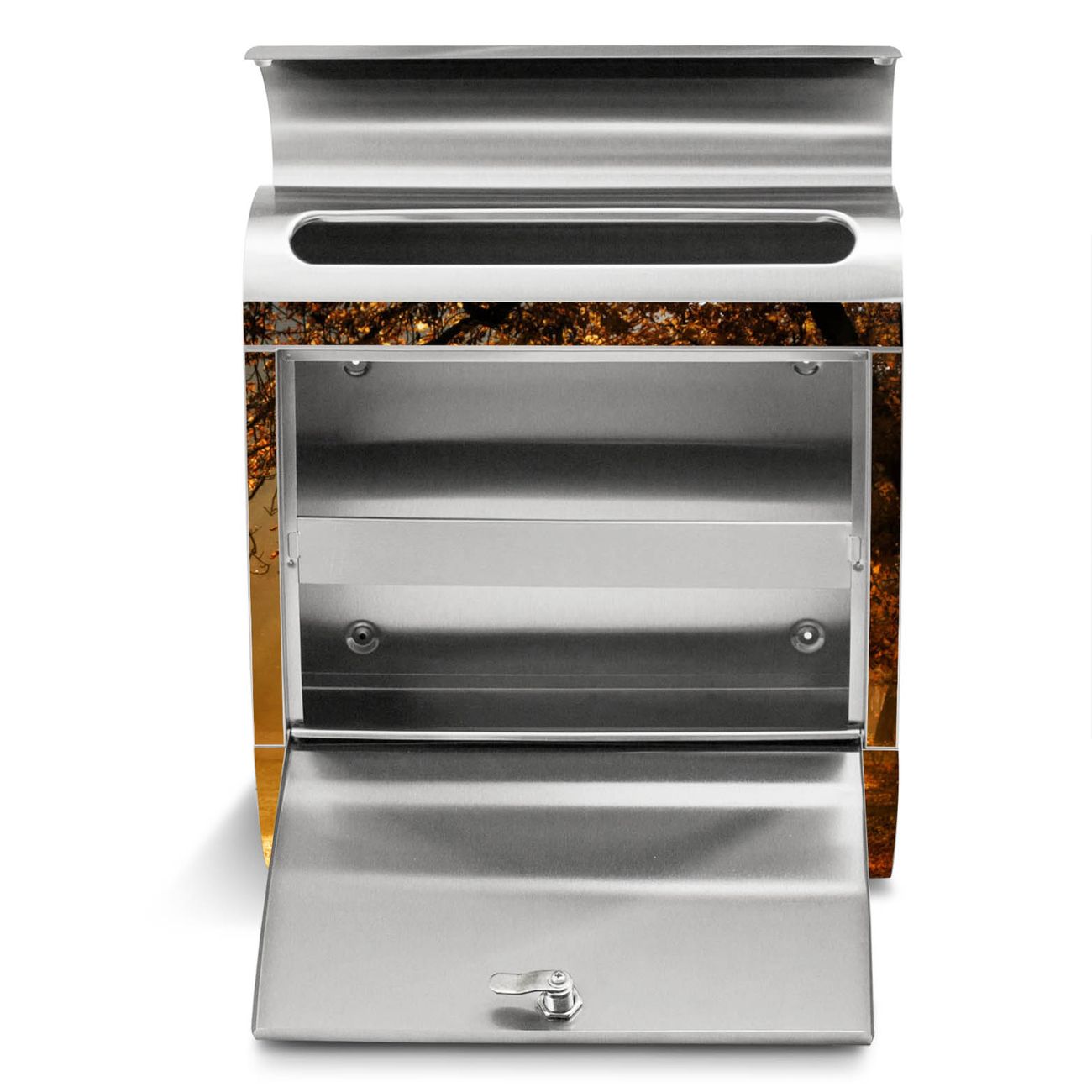 Der banjado Edelstahl Standbriefkasten mit Motiv Goldener Herbst und eigenem Wunschtext bietet Ihnen mit seinem Fassungsvermögen genügend Platz auch für große A4 Sendungen. Das integrierte Zeitungsfach eignet sich hervorragend, um unkompliziert die Tageszeitung zu fassen.