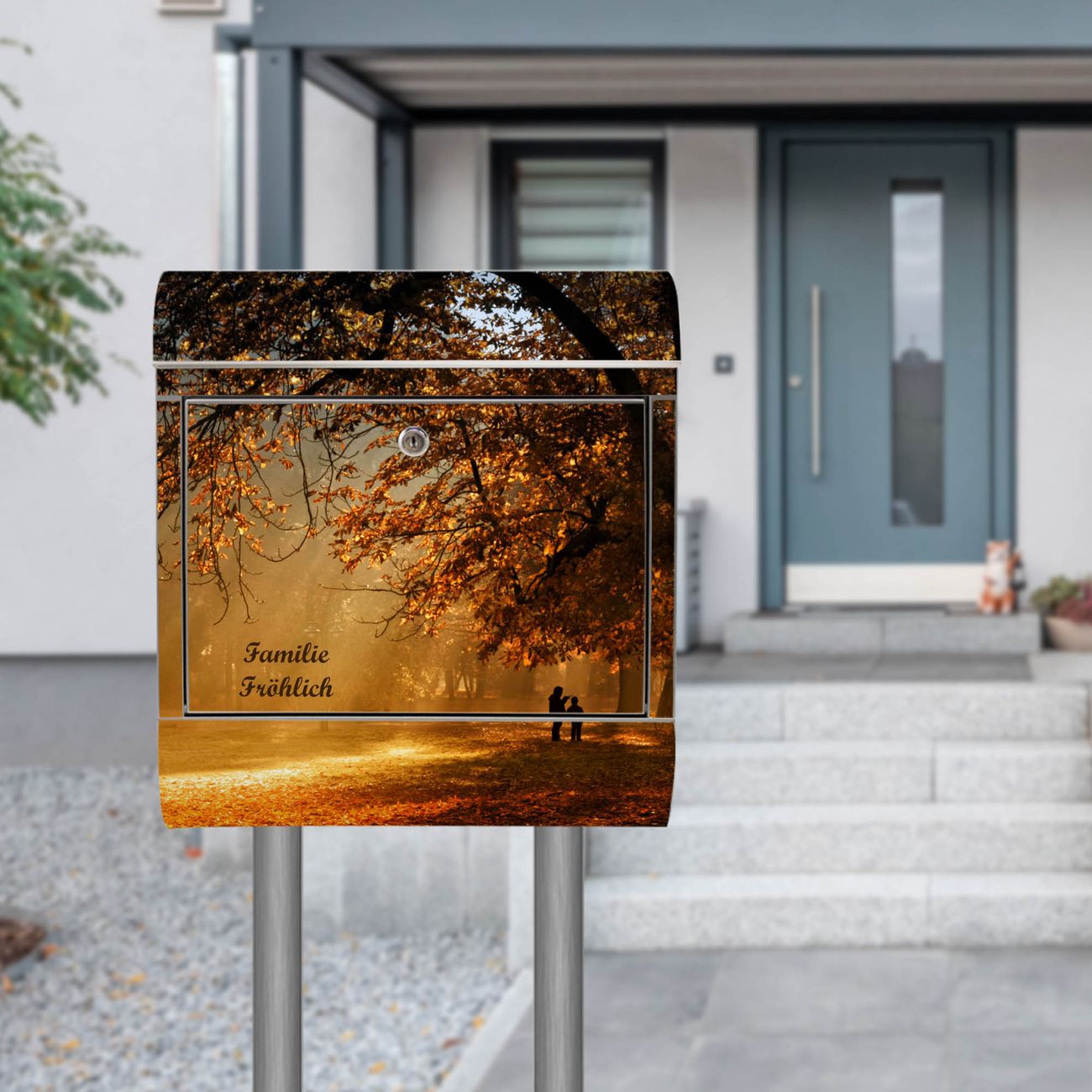 Der Motivstandbriefkasten hat ein sehr ansprechendes und ausgefallenes Design, damit entlocken Sie Ihren Nachbarn und dem Postboten ein Lächeln. Heben Sie Sich ab von der tristen grauen Masse, ohne auf Funktionalität zu verzichten. Der Briefkasten besteht aus hochwertigem 18/0 Edelstahl und die Wetter- und UV-resistenten Folie mit Goldener Herbst Motiv ist zusätzlich mit einem Schutzlaminat überzogen. Der Standbriefkasten wird mit Montagematerial und zwei Schlüsseln geliefert.
