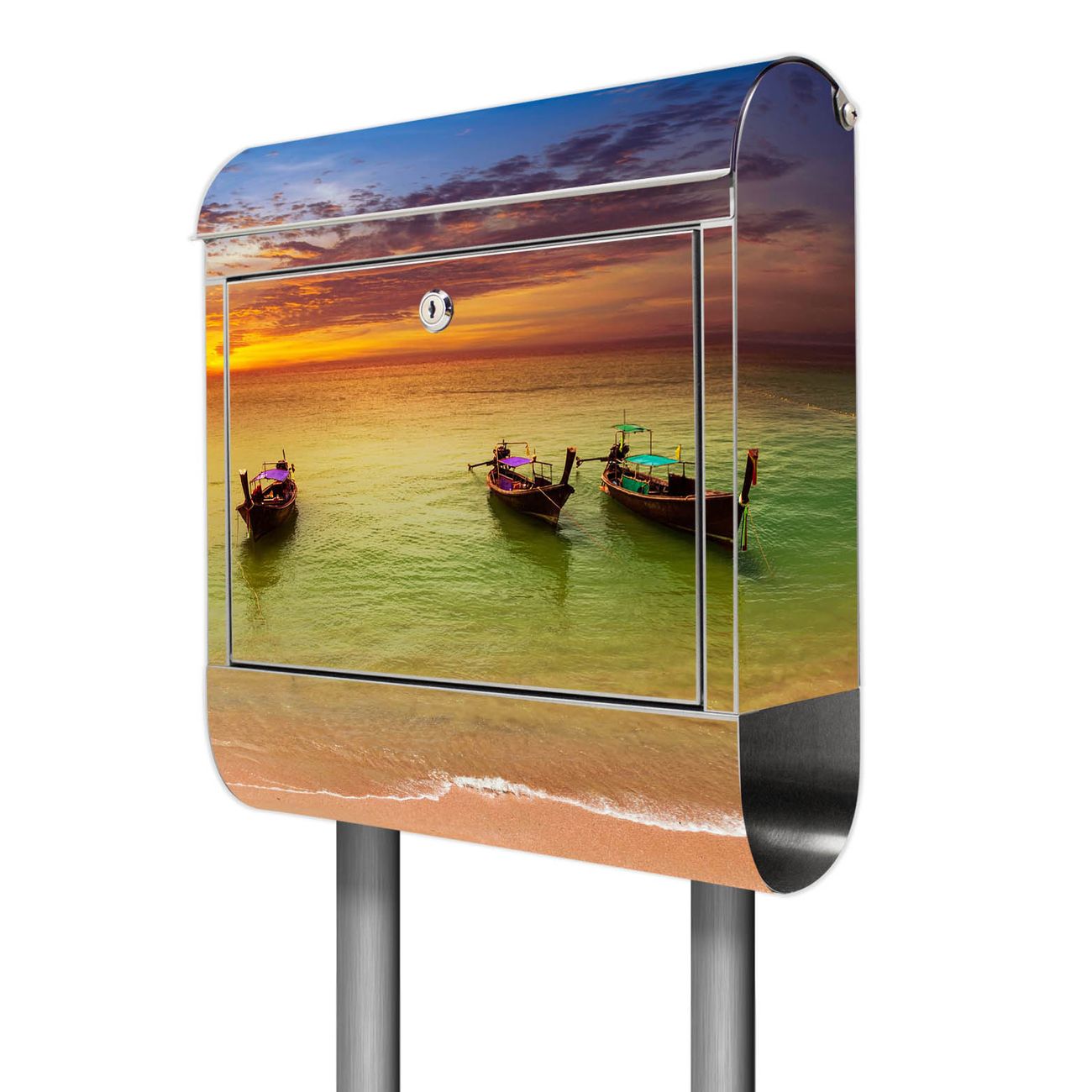 Der Motivstandbriefkasten hat ein sehr ansprechendes und ausgefallenes Design, damit entlocken Sie Ihren Nachbarn und dem Postboten ein Lächeln. Heben Sie Sich ab von der tristen grauen Masse, ohne auf Funktionalität zu verzichten. Der Briefkasten besteht aus hochwertigem 18/0 Edelstahl und die Wetter- und UV-resistenten Folie mit Golf Von Thailand Motiv ist zusätzlich mit einem Schutzlaminat überzogen. Der Standbriefkasten wird mit Montagematerial und zwei Schlüsseln geliefert.