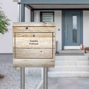 Der banjado Edelstahl Standbriefkasten mit Motiv Graues Holz und eigenem Wunschtext bietet Ihnen mit seinem Fassungsvermögen genügend Platz auch für große A4 Sendungen. Das integrierte Zeitungsfach eignet sich hervorragend, um unkompliziert die Tageszeitung zu fassen.