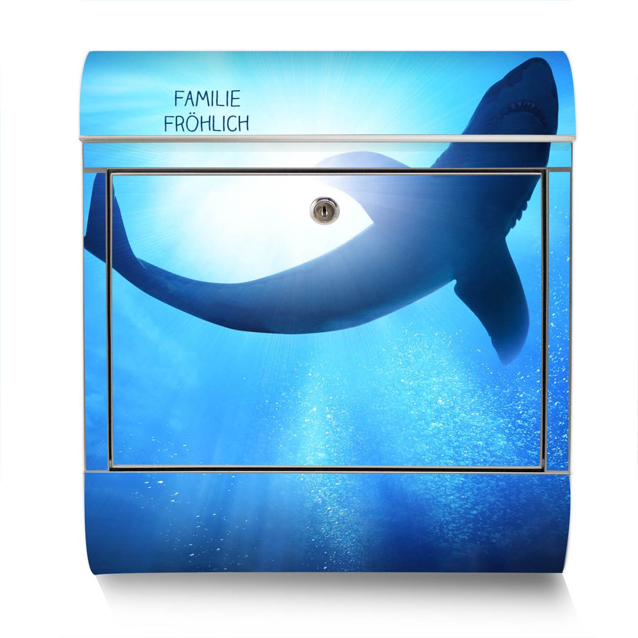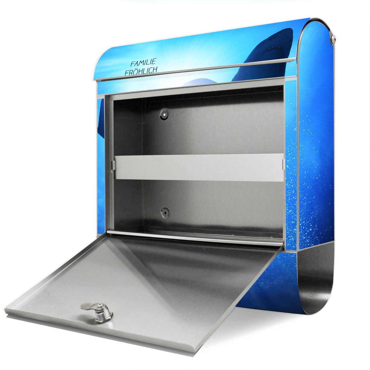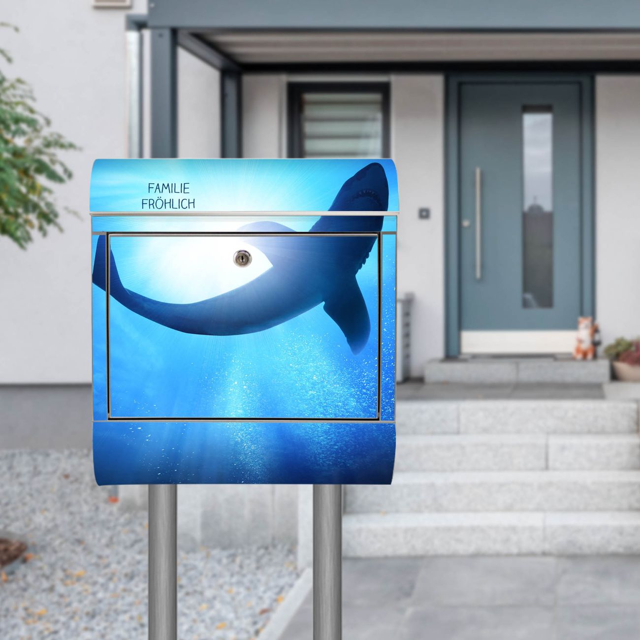 Der banjado Edelstahl Standbriefkasten mit Motiv Hai und eigenem Wunschtext bietet Ihnen mit seinem Fassungsvermögen genügend Platz auch für große A4 Sendungen. Das integrierte Zeitungsfach eignet sich hervorragend, um unkompliziert die Tageszeitung zu fassen.