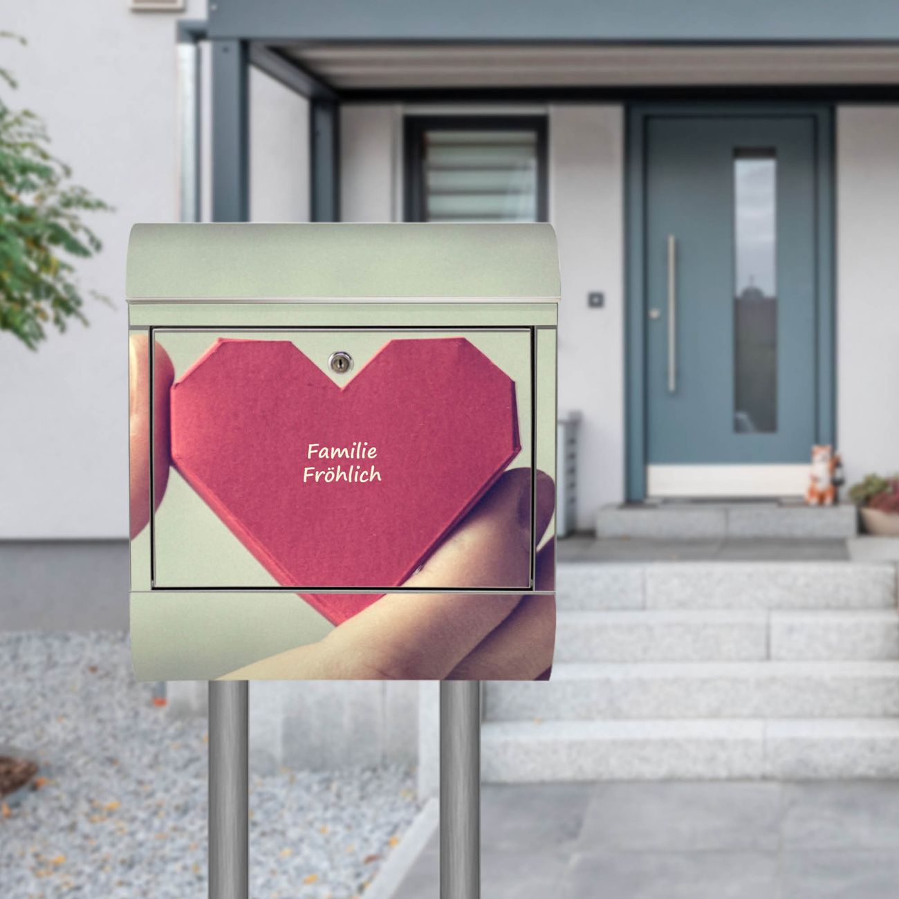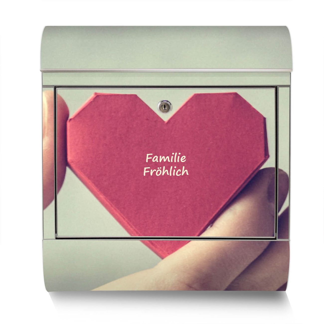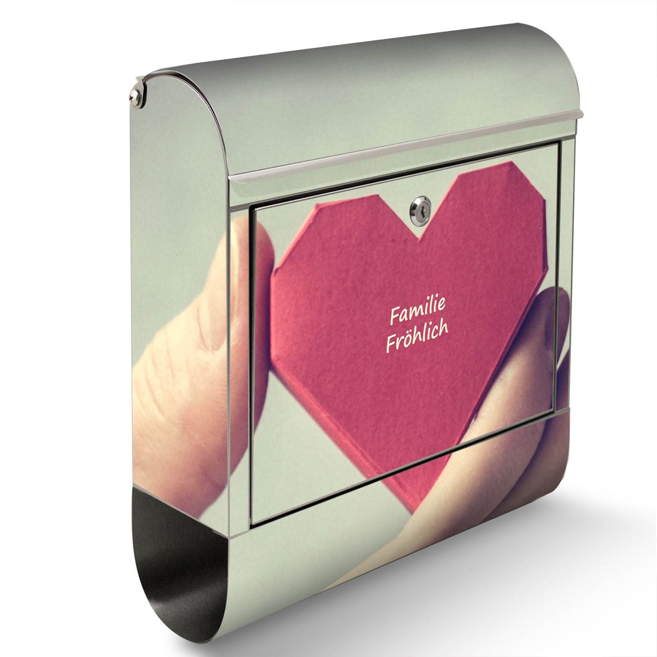 Der Motivstandbriefkasten hat ein sehr ansprechendes und ausgefallenes Design, damit entlocken Sie Ihren Nachbarn und dem Postboten ein Lächeln. Heben Sie Sich ab von der tristen grauen Masse, ohne auf Funktionalität zu verzichten. Der Briefkasten besteht aus hochwertigem 18/0 Edelstahl und die Wetter- und UV-resistenten Folie mit Hand Aufs Herz Motiv ist zusätzlich mit einem Schutzlaminat überzogen. Der Standbriefkasten wird mit Montagematerial und zwei Schlüsseln geliefert.
