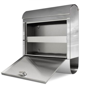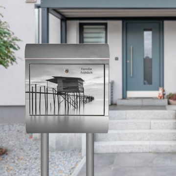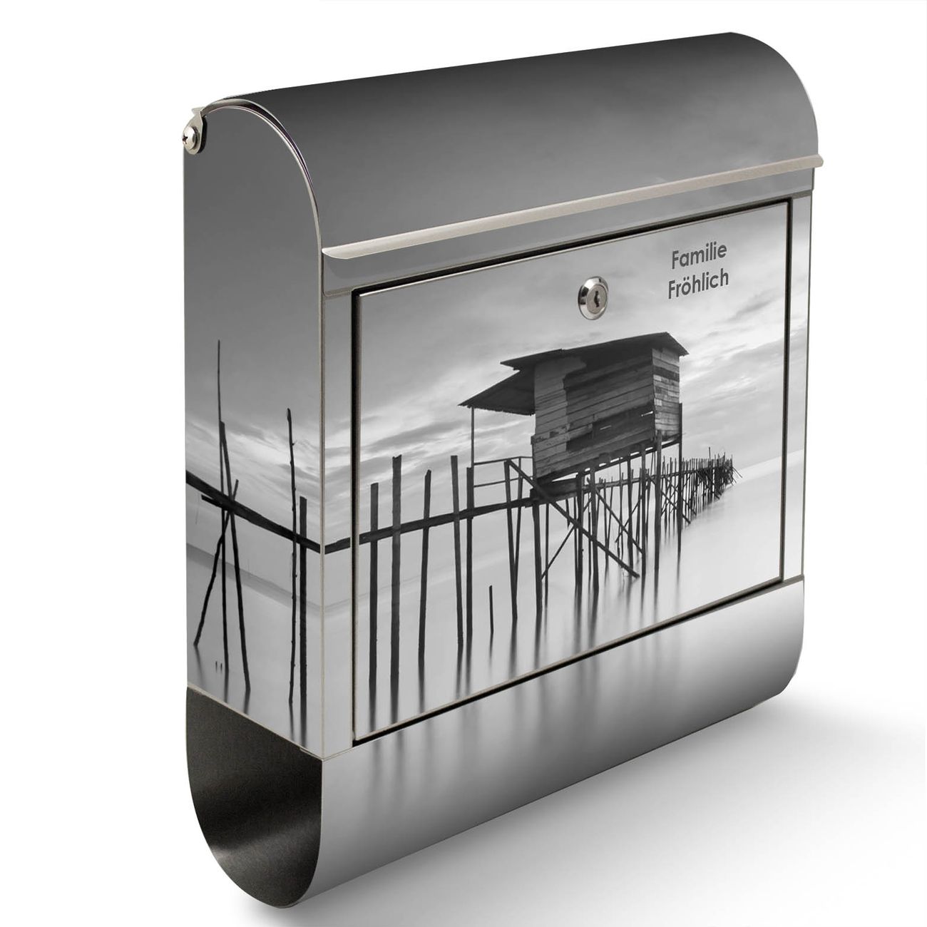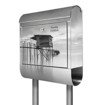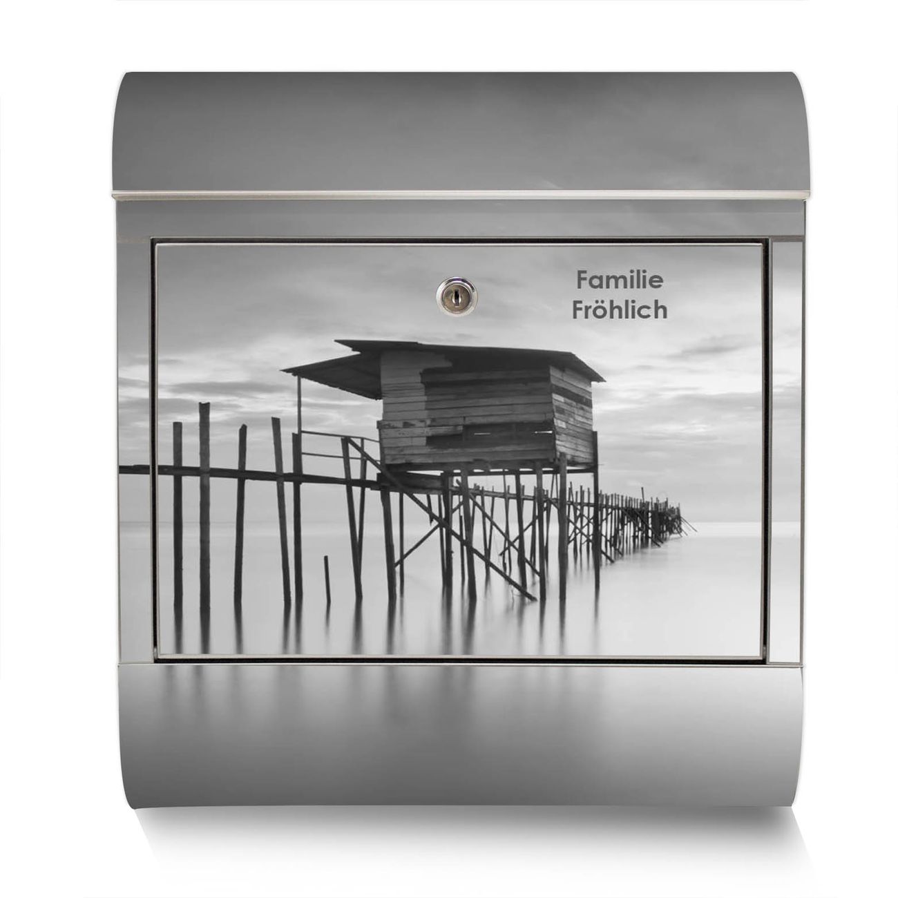 Der banjado Edelstahl Standbriefkasten mit Motiv Haus am See und eigenem Wunschtext bietet Ihnen mit seinem Fassungsvermögen genügend Platz auch für große A4 Sendungen. Das integrierte Zeitungsfach eignet sich hervorragend, um unkompliziert die Tageszeitung zu fassen.