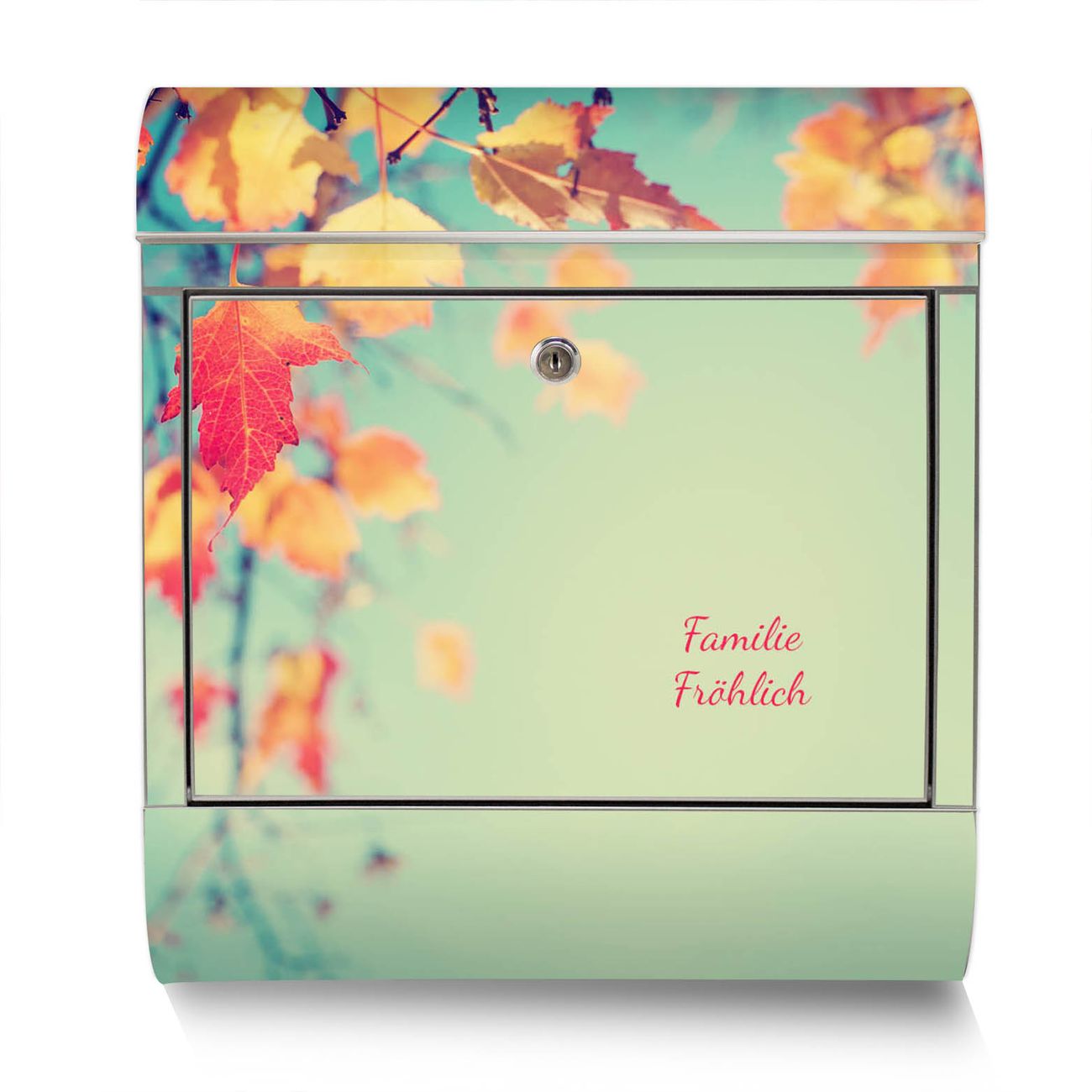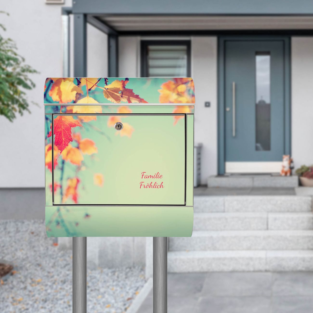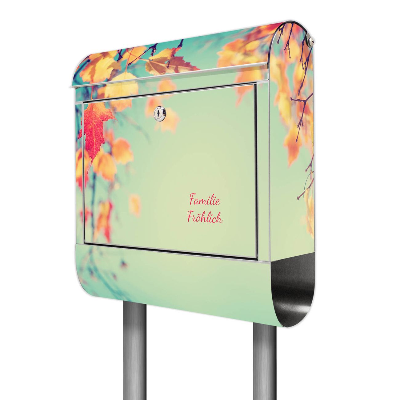 Der banjado Edelstahl Standbriefkasten mit Motiv Herbst und eigenem Wunschtext bietet Ihnen mit seinem Fassungsvermögen genügend Platz auch für große A4 Sendungen. Das integrierte Zeitungsfach eignet sich hervorragend, um unkompliziert die Tageszeitung zu fassen.