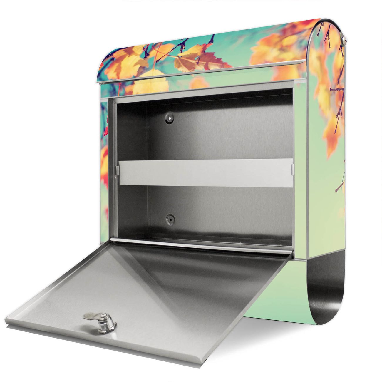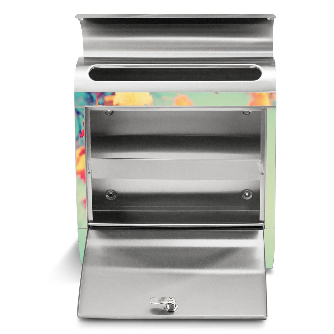 Der Motivstandbriefkasten hat ein sehr ansprechendes und ausgefallenes Design, damit entlocken Sie Ihren Nachbarn und dem Postboten ein Lächeln. Heben Sie Sich ab von der tristen grauen Masse, ohne auf Funktionalität zu verzichten. Der Briefkasten besteht aus hochwertigem 18/0 Edelstahl und die Wetter- und UV-resistenten Folie mit Herbst Motiv ist zusätzlich mit einem Schutzlaminat überzogen. Der Standbriefkasten wird mit Montagematerial und zwei Schlüsseln geliefert.