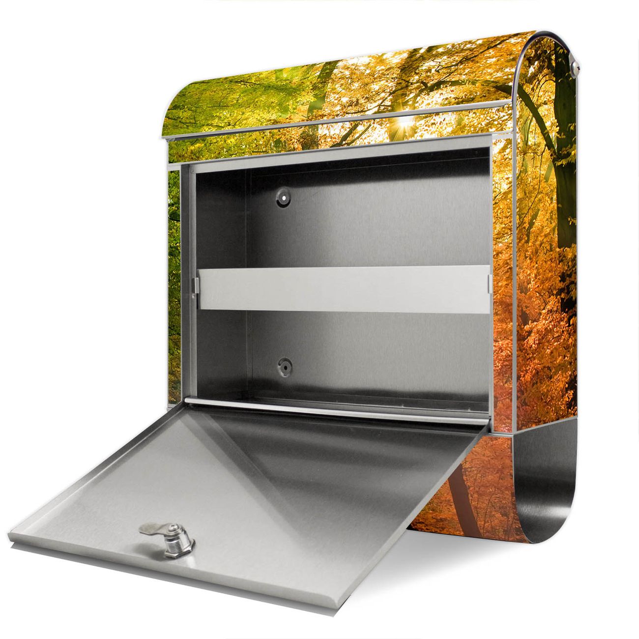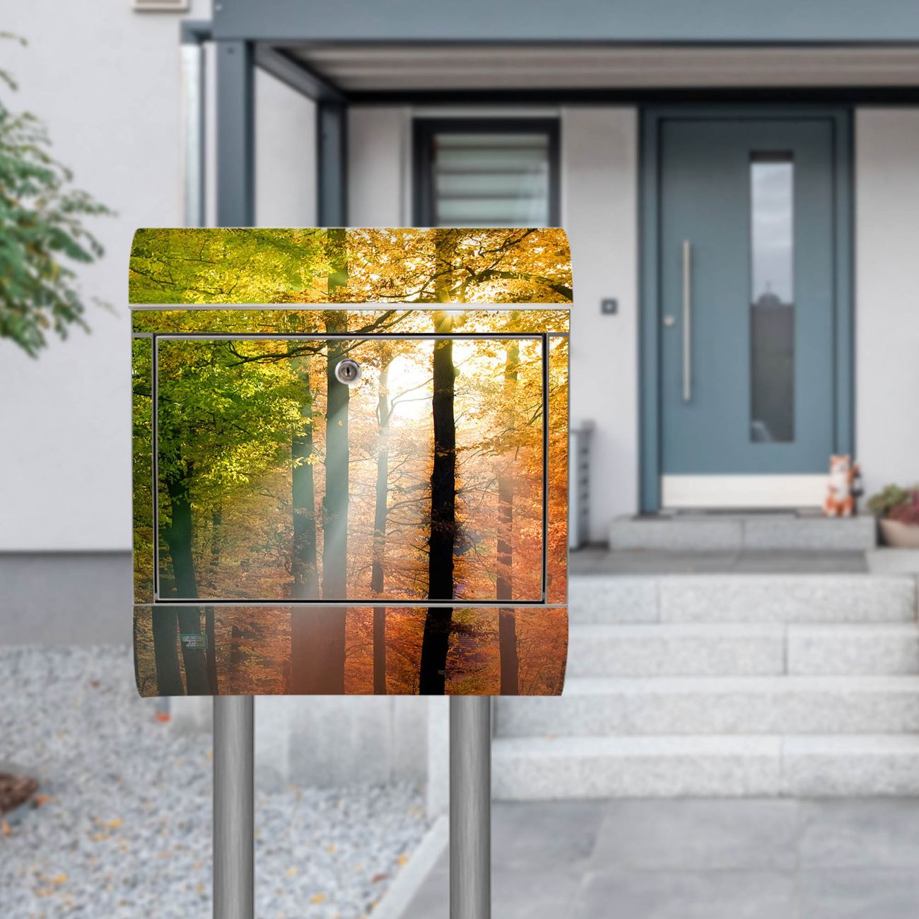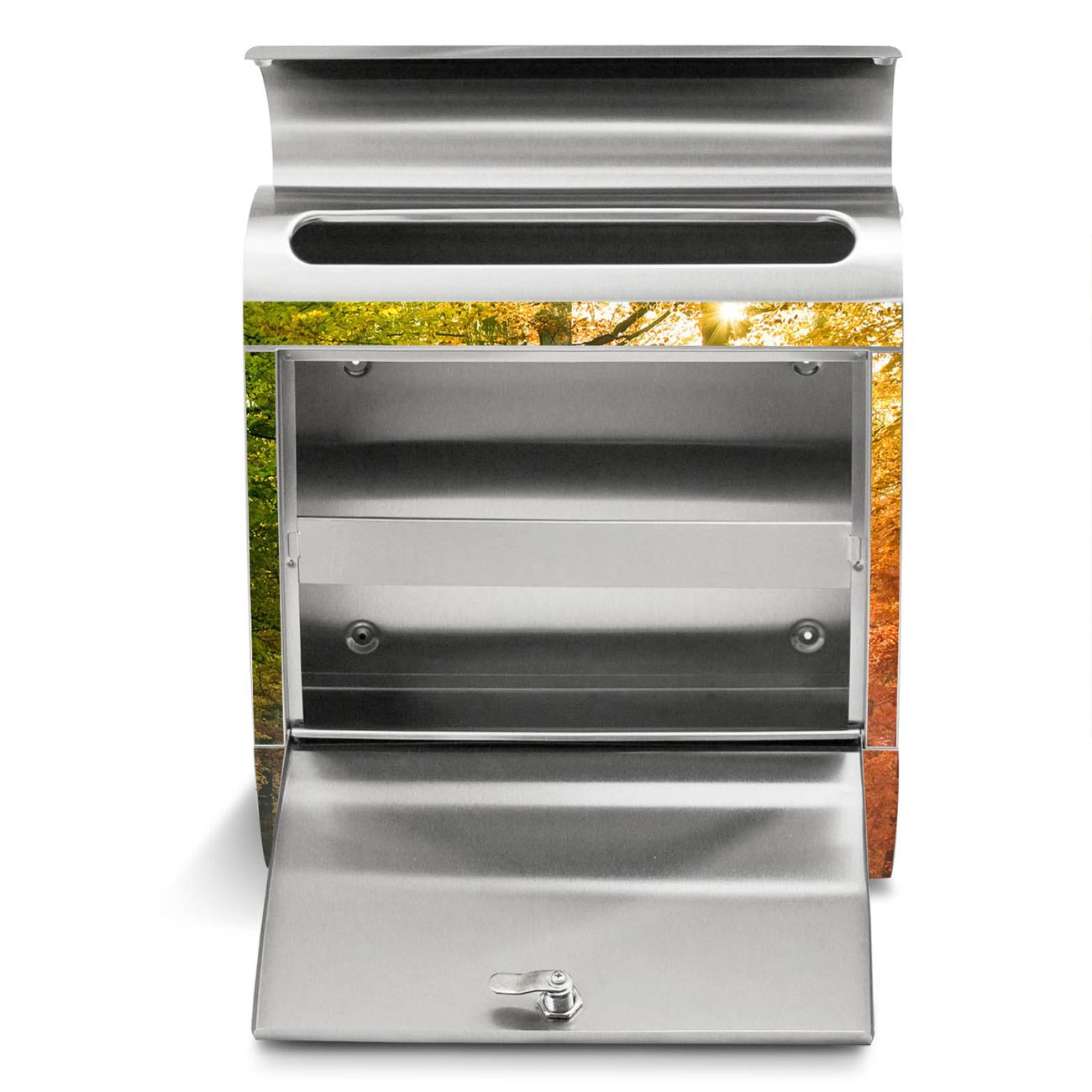Der Motivstandbriefkasten hat ein sehr ansprechendes und ausgefallenes Design, damit entlocken Sie Ihren Nachbarn und dem Postboten ein Lächeln. Heben Sie Sich ab von der tristen grauen Masse, ohne auf Funktionalität zu verzichten. Der Briefkasten besteht aus hochwertigem 18/0 Edelstahl und die Wetter- und UV-resistenten Folie mit Herbstwald Motiv ist zusätzlich mit einem Schutzlaminat überzogen. Der Standbriefkasten wird mit Montagematerial und zwei Schlüsseln geliefert.