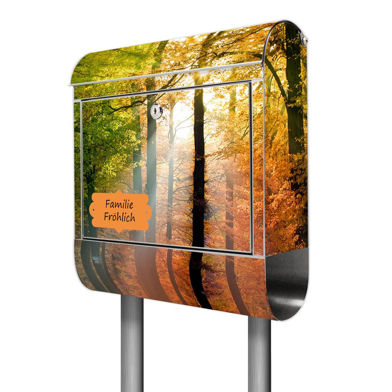 Der Motivstandbriefkasten hat ein sehr ansprechendes und ausgefallenes Design, damit entlocken Sie Ihren Nachbarn und dem Postboten ein Lächeln. Heben Sie Sich ab von der tristen grauen Masse, ohne auf Funktionalität zu verzichten. Der Briefkasten besteht aus hochwertigem 18/0 Edelstahl und die Wetter- und UV-resistenten Folie mit Herbstwald Motiv ist zusätzlich mit einem Schutzlaminat überzogen. Der Standbriefkasten wird mit Montagematerial und zwei Schlüsseln geliefert.
