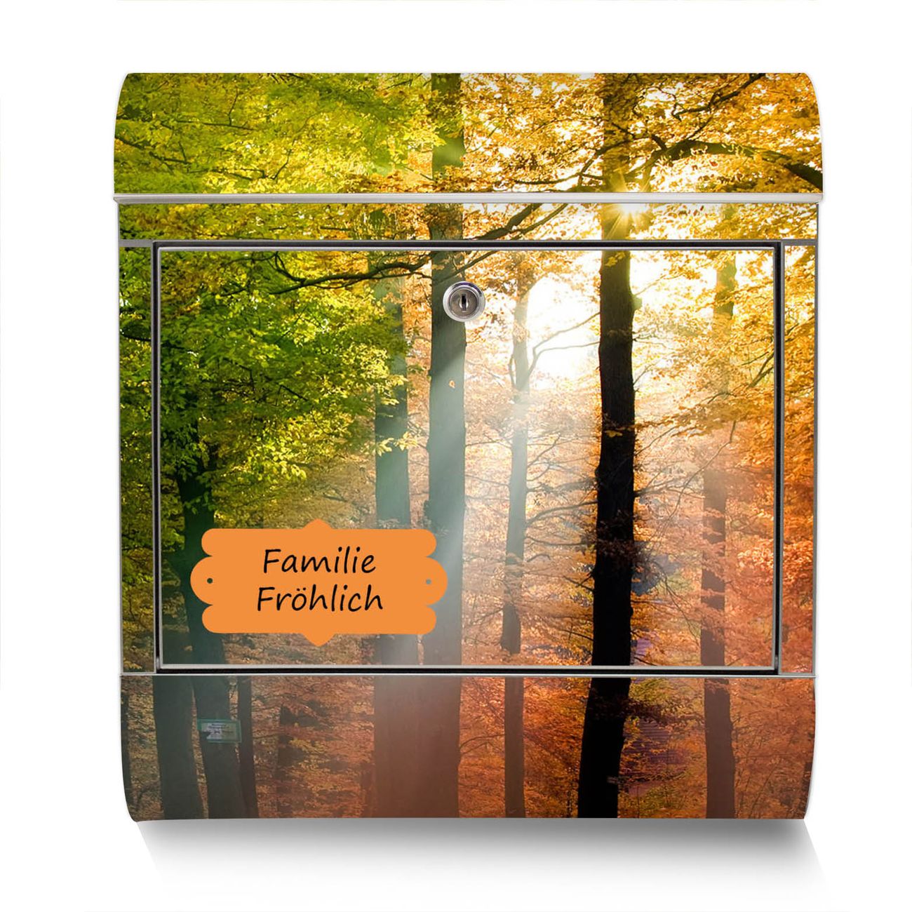 Der banjado Edelstahl Standbriefkasten mit Motiv Herbstwald und eigenem Wunschtext bietet Ihnen mit seinem Fassungsvermögen genügend Platz auch für große A4 Sendungen. Das integrierte Zeitungsfach eignet sich hervorragend, um unkompliziert die Tageszeitung zu fassen.