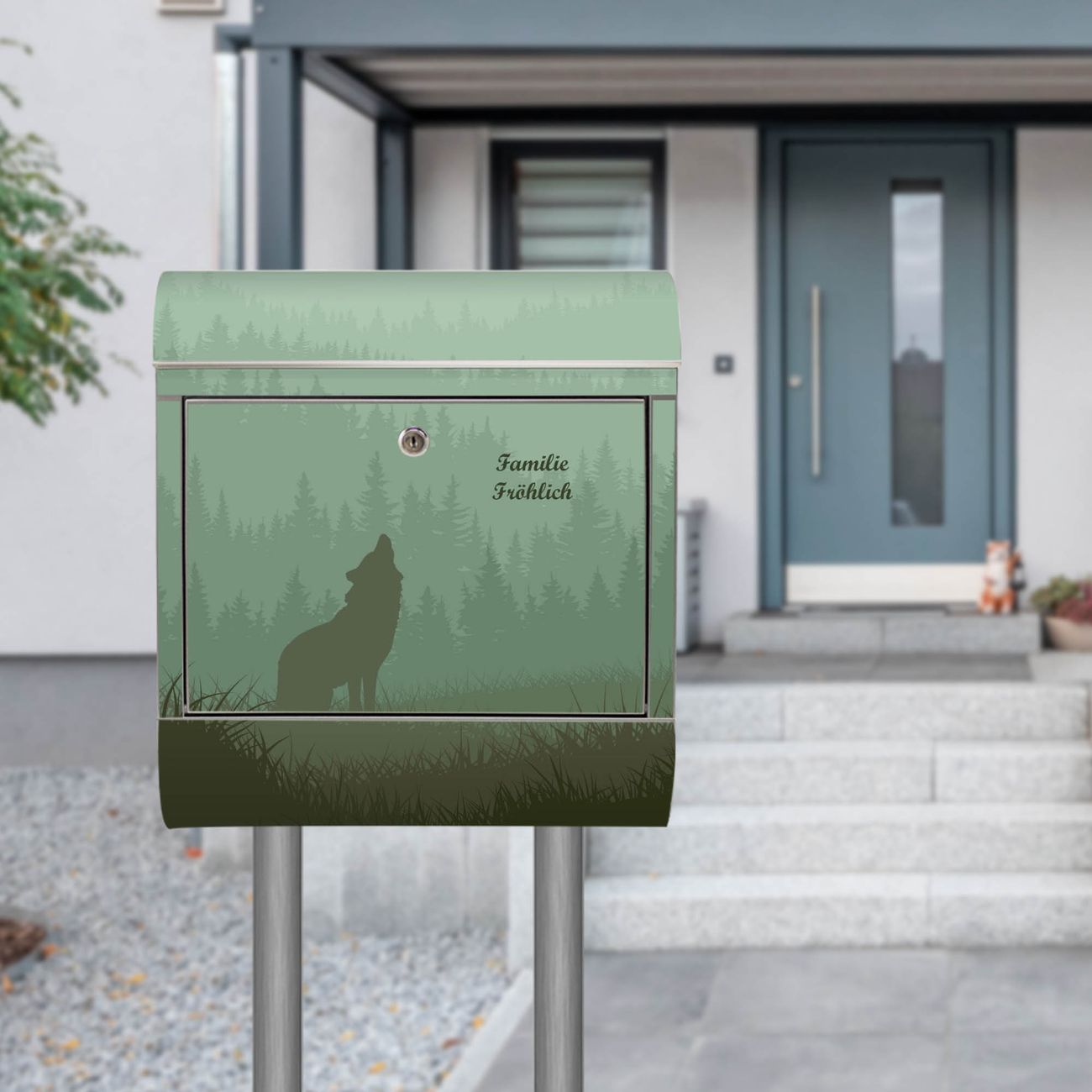 Der banjado Edelstahl Standbriefkasten mit Motiv Heulender Wolf und eigenem Wunschtext bietet Ihnen mit seinem Fassungsvermögen genügend Platz auch für große A4 Sendungen. Das integrierte Zeitungsfach eignet sich hervorragend, um unkompliziert die Tageszeitung zu fassen.
