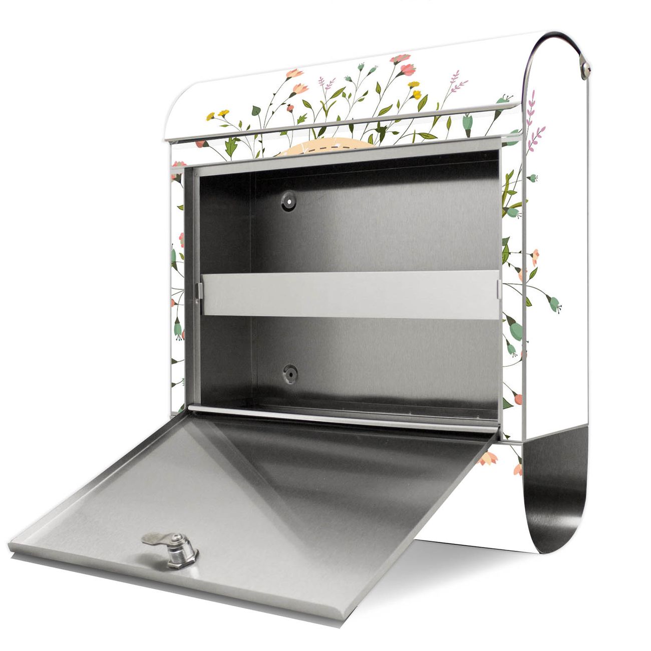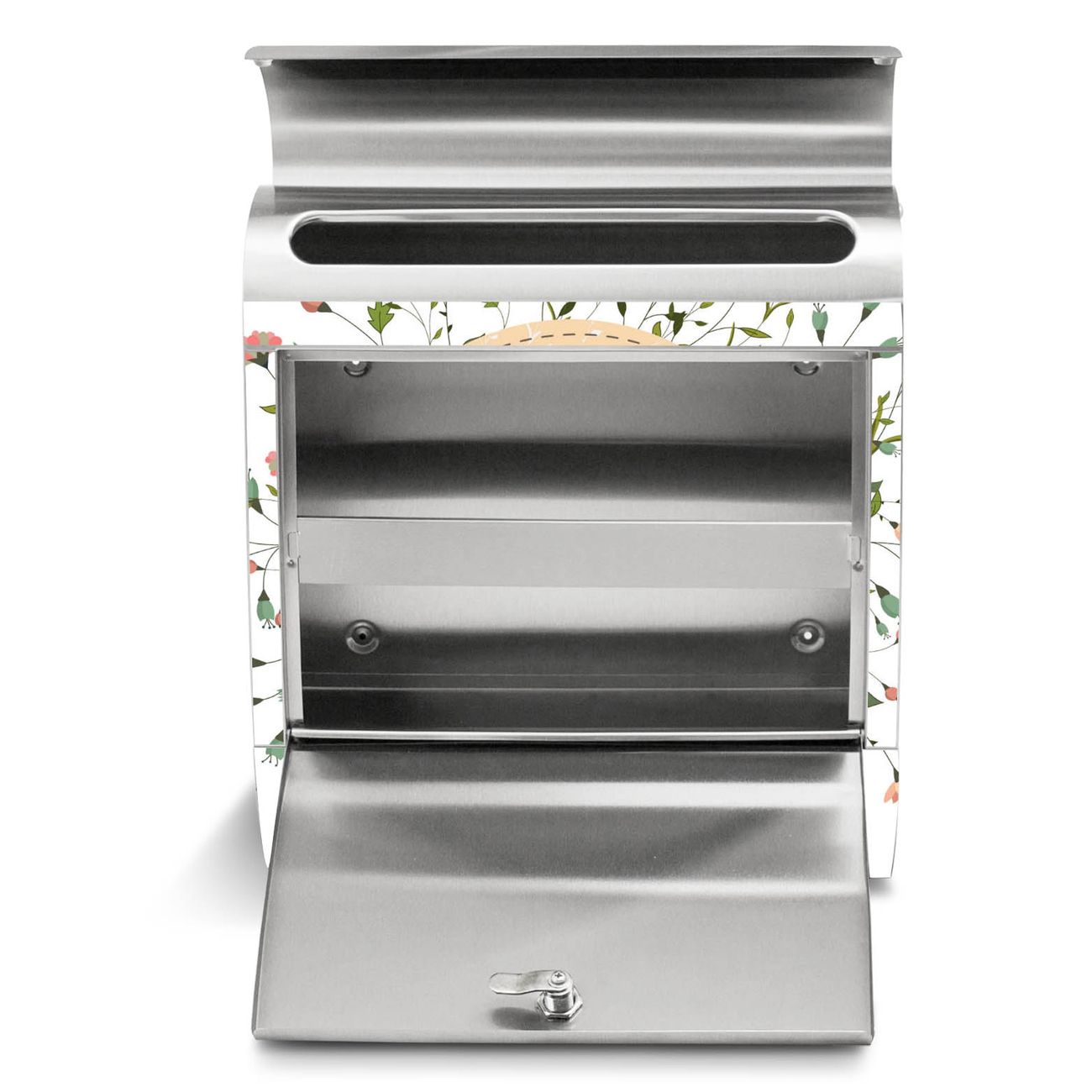 Der banjado Edelstahl Standbriefkasten mit Motiv Hibiskus Kreis und eigenem Wunschtext bietet Ihnen mit seinem Fassungsvermögen genügend Platz auch für große A4 Sendungen. Das integrierte Zeitungsfach eignet sich hervorragend, um unkompliziert die Tageszeitung zu fassen.