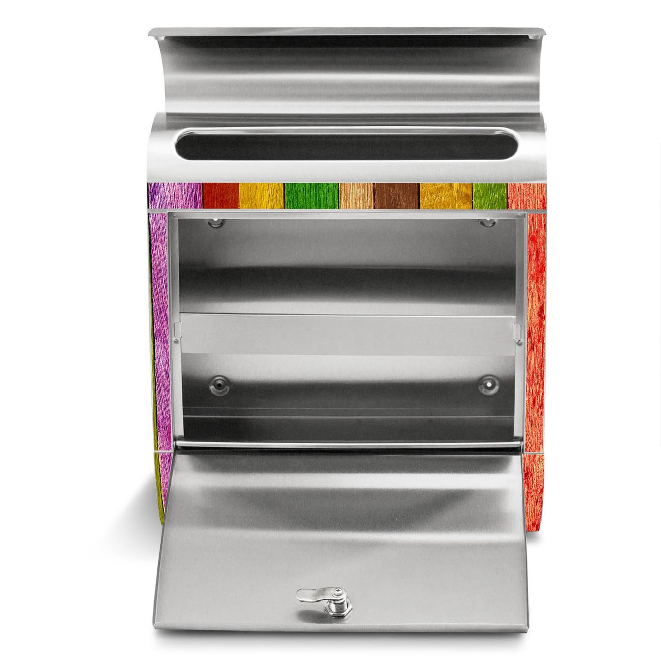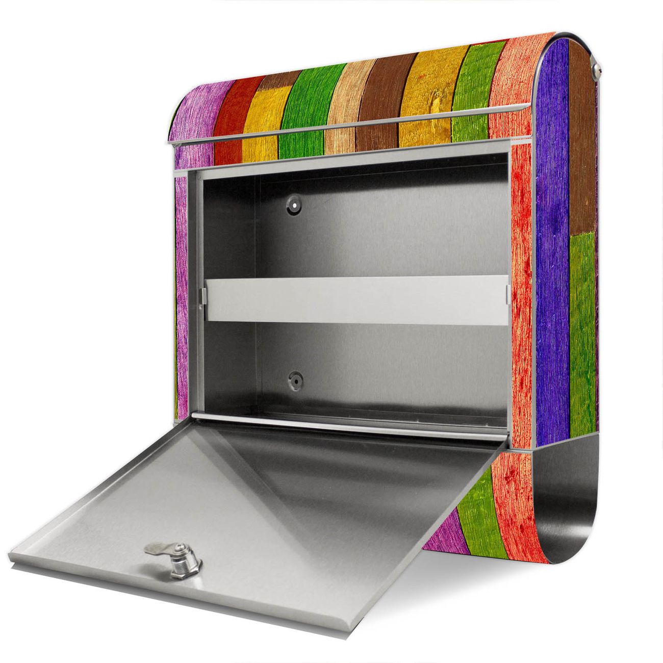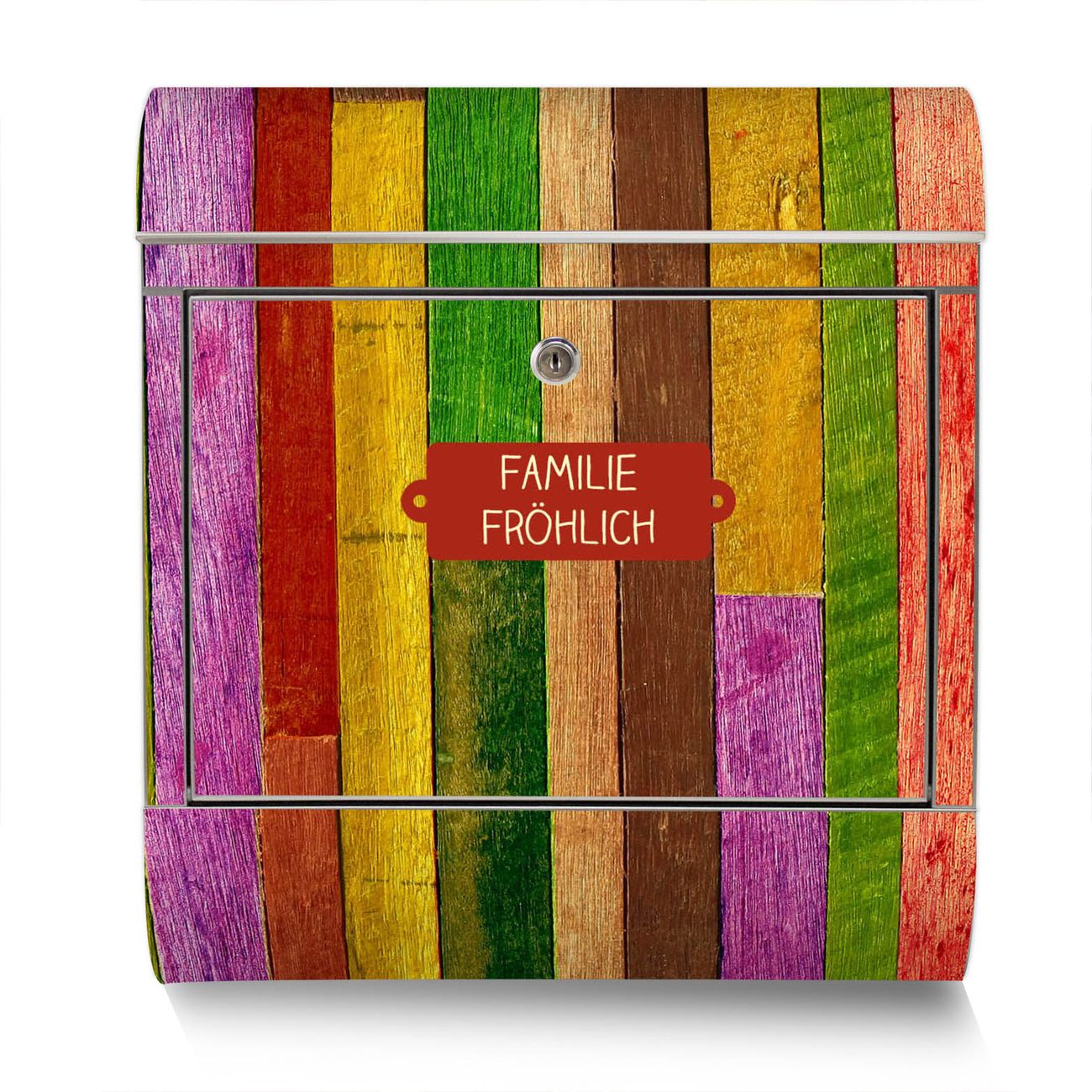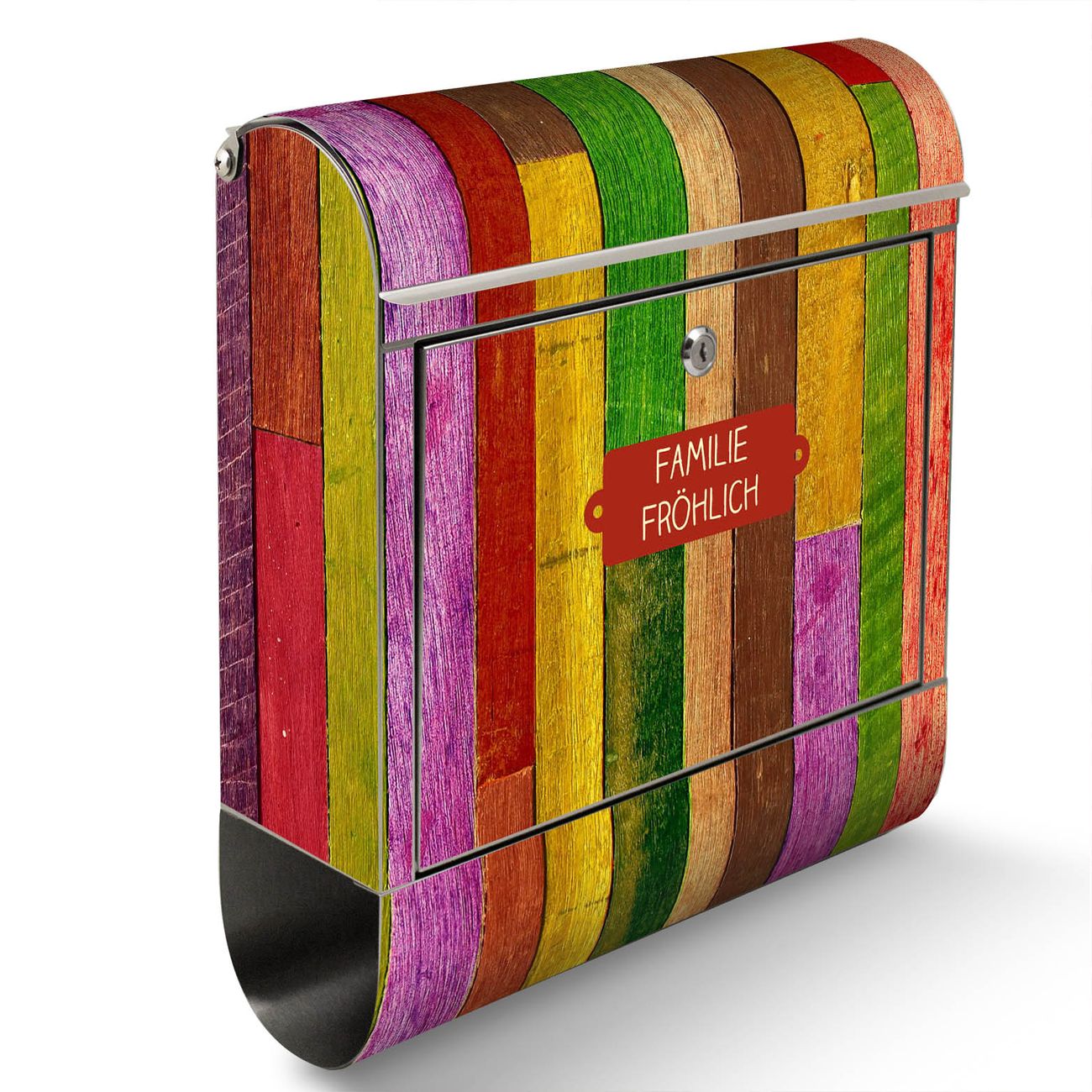 Der Motivstandbriefkasten hat ein sehr ansprechendes und ausgefallenes Design, damit entlocken Sie Ihren Nachbarn und dem Postboten ein Lächeln. Heben Sie Sich ab von der tristen grauen Masse, ohne auf Funktionalität zu verzichten. Der Briefkasten besteht aus hochwertigem 18/0 Edelstahl und die Wetter- und UV-resistenten Folie mit Holz Collage Bunt Motiv ist zusätzlich mit einem Schutzlaminat überzogen. Der Standbriefkasten wird mit Montagematerial und zwei Schlüsseln geliefert.