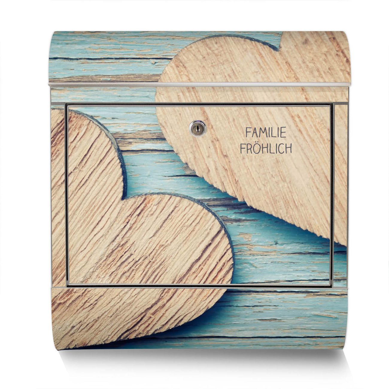 Der banjado Edelstahl Standbriefkasten mit Motiv Holz Herzen und eigenem Wunschtext bietet Ihnen mit seinem Fassungsvermögen genügend Platz auch für große A4 Sendungen. Das integrierte Zeitungsfach eignet sich hervorragend, um unkompliziert die Tageszeitung zu fassen.