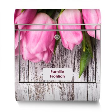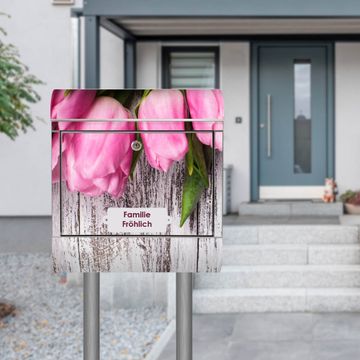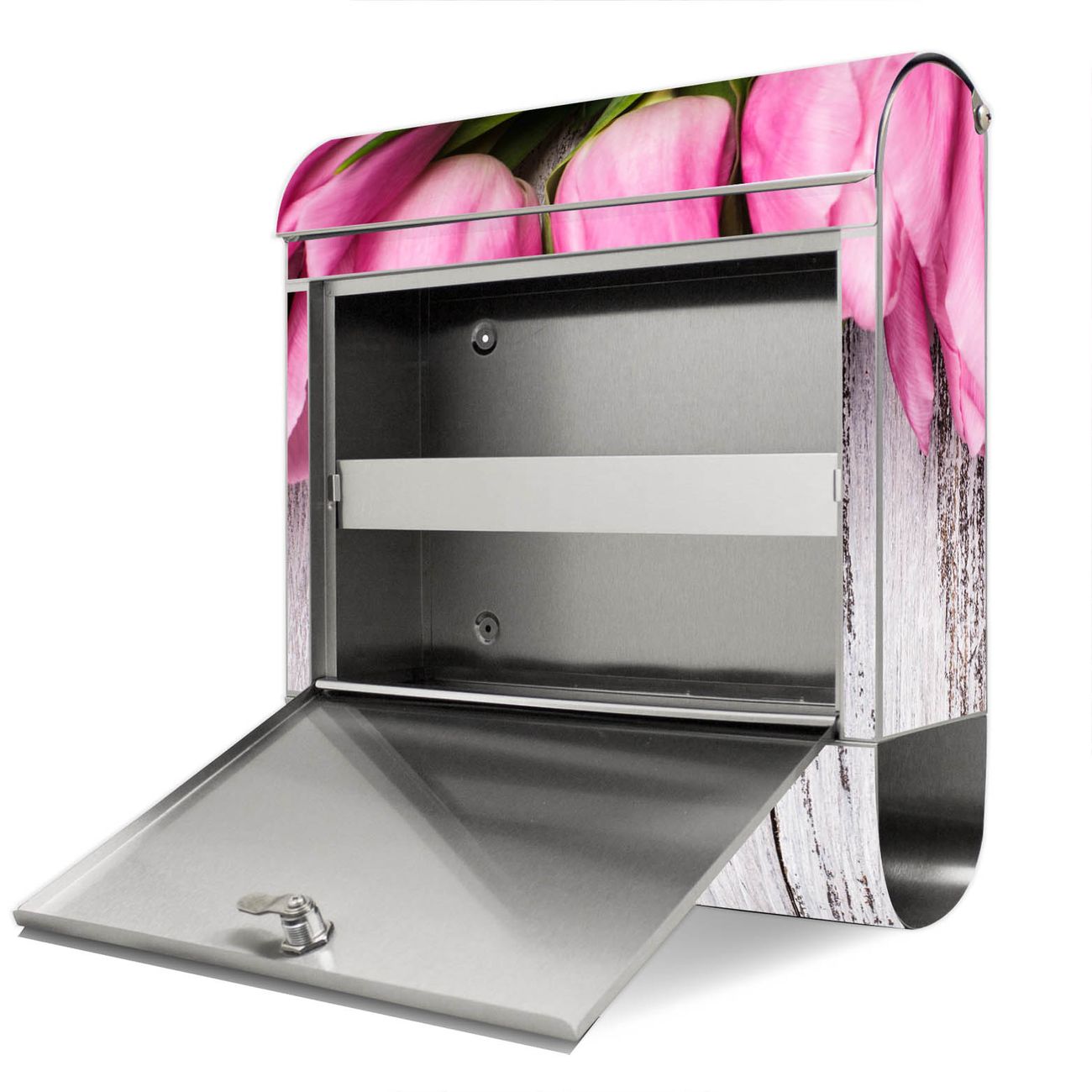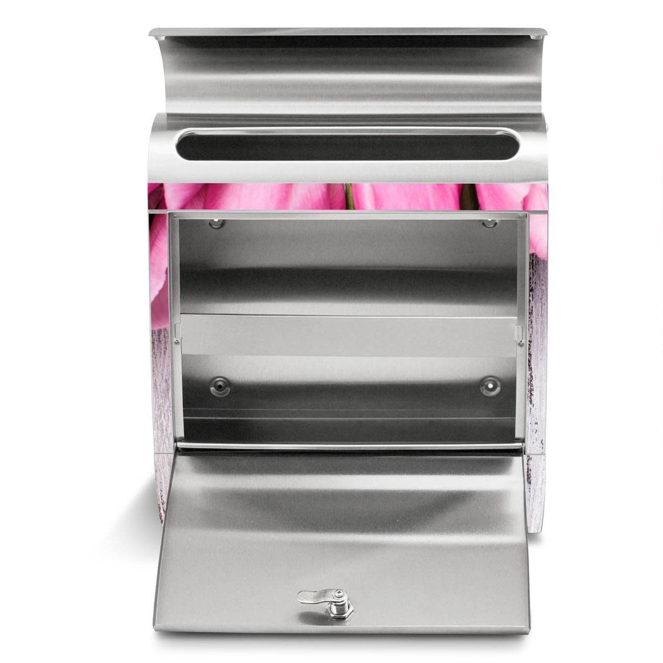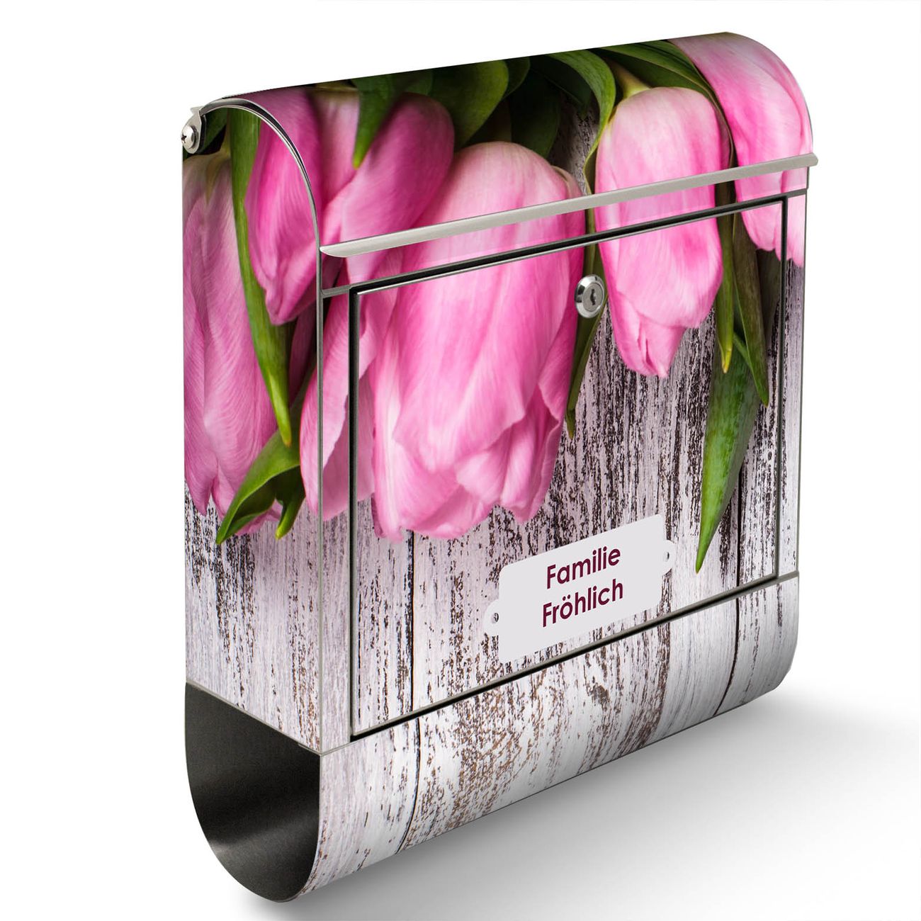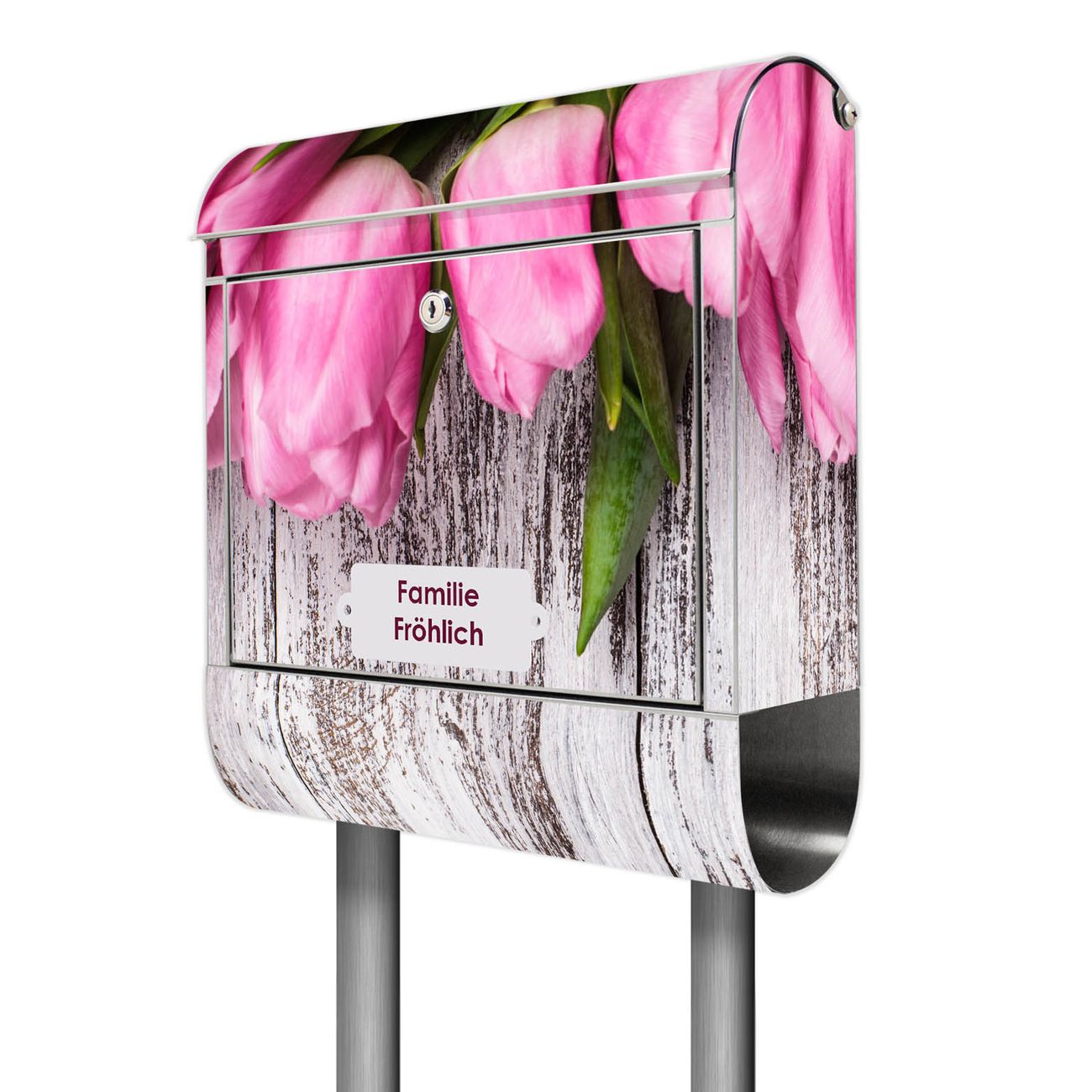 Der banjado Edelstahl Standbriefkasten mit Motiv Holz und Tulpen und eigenem Wunschtext bietet Ihnen mit seinem Fassungsvermögen genügend Platz auch für große A4 Sendungen. Das integrierte Zeitungsfach eignet sich hervorragend, um unkompliziert die Tageszeitung zu fassen.