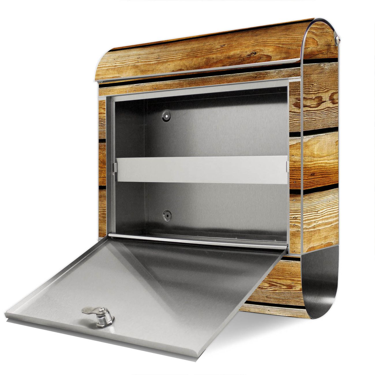 Der Motivstandbriefkasten hat ein sehr ansprechendes und ausgefallenes Design, damit entlocken Sie Ihren Nachbarn und dem Postboten ein Lächeln. Heben Sie Sich ab von der tristen grauen Masse, ohne auf Funktionalität zu verzichten. Der Briefkasten besteht aus hochwertigem 18/0 Edelstahl und die Wetter- und UV-resistenten Folie mit Holzbretter Motiv ist zusätzlich mit einem Schutzlaminat überzogen. Der Standbriefkasten wird mit Montagematerial und zwei Schlüsseln geliefert.