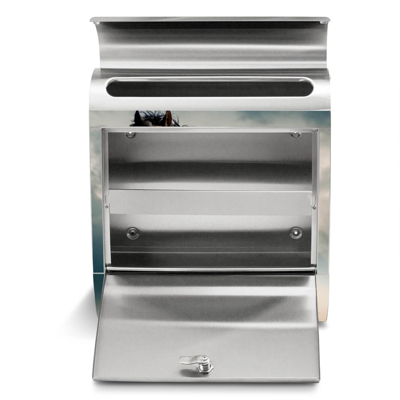 Der banjado Edelstahl Standbriefkasten mit Motiv Ibrahim bietet Ihnen mit seinem Fassungsvermögen genügend Platz auch für große A4 Sendungen. Das integrierte Zeitungsfach eignet sich hervorragend, um unkompliziert die Tageszeitung zu fassen.