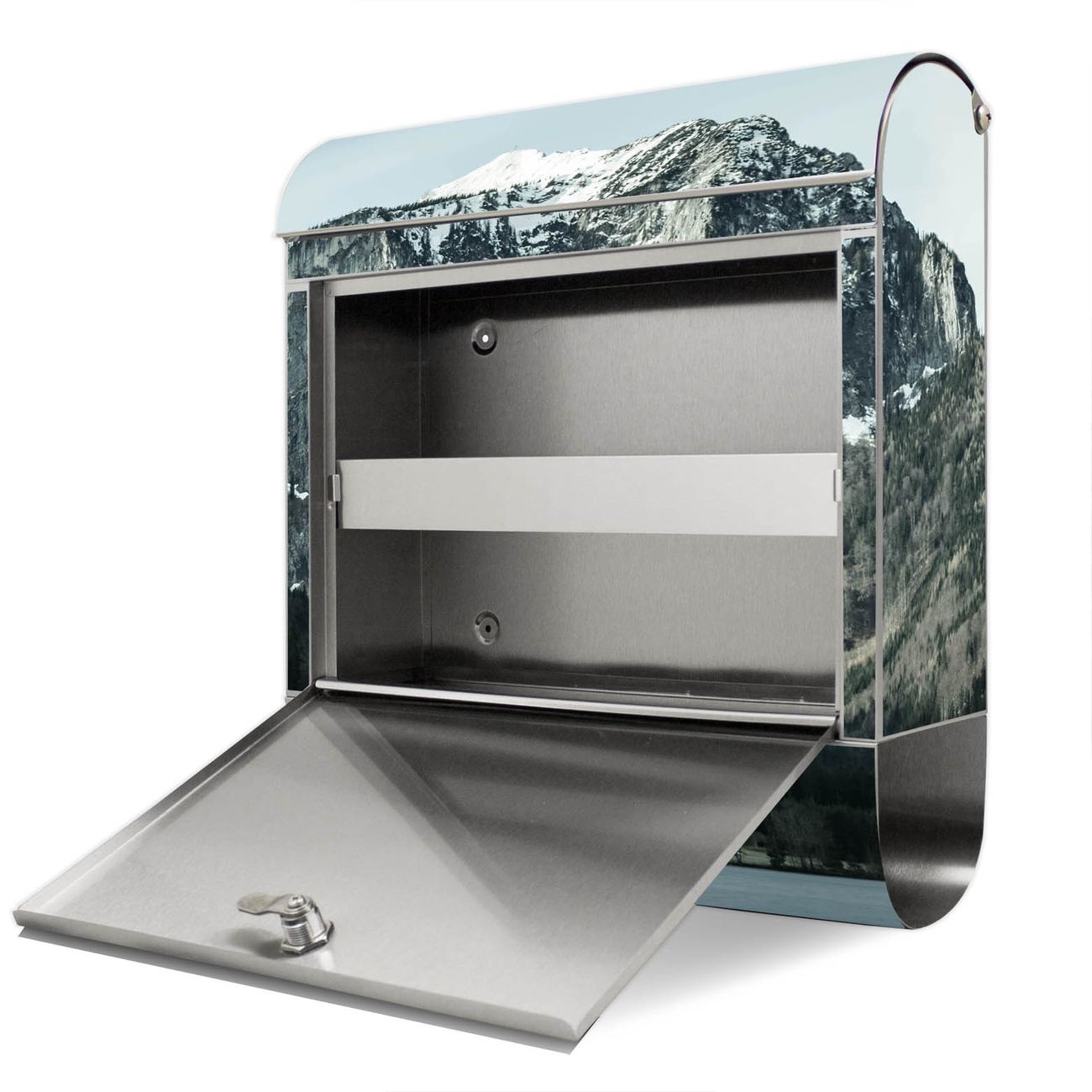 Der banjado Edelstahl Standbriefkasten mit Motiv Im Schatten des Bergs und eigenem Wunschtext bietet Ihnen mit seinem Fassungsvermögen genügend Platz auch für große A4 Sendungen. Das integrierte Zeitungsfach eignet sich hervorragend, um unkompliziert die Tageszeitung zu fassen.