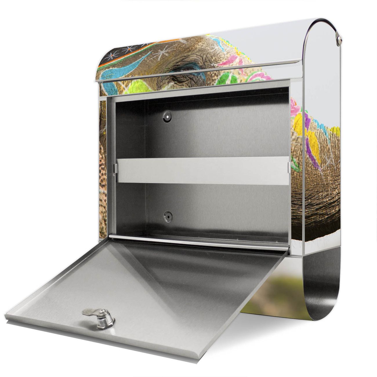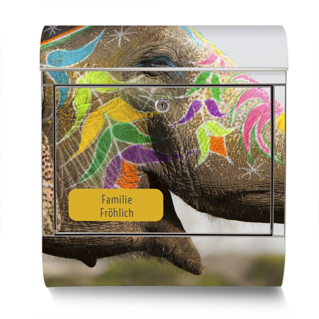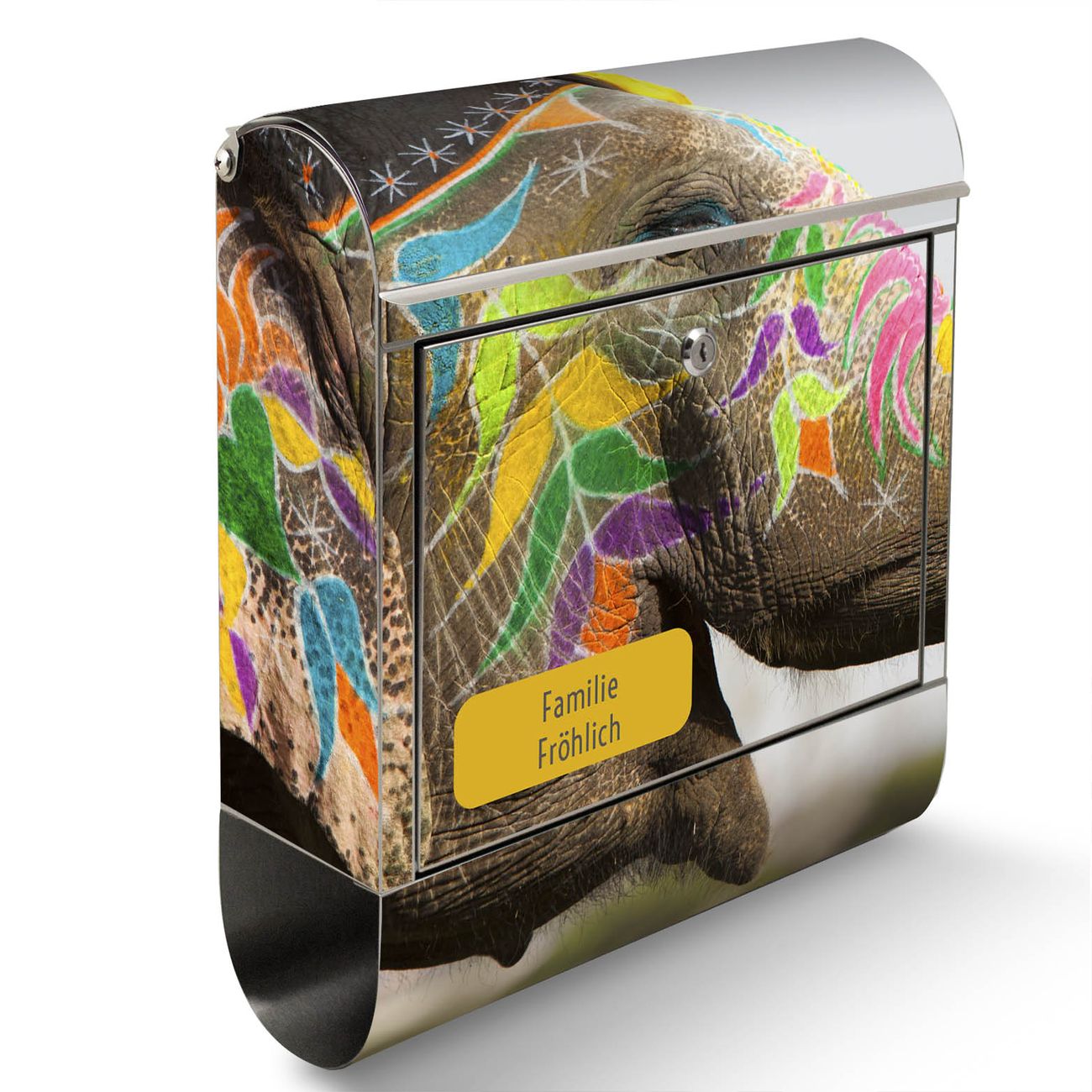 Der Motivstandbriefkasten hat ein sehr ansprechendes und ausgefallenes Design, damit entlocken Sie Ihren Nachbarn und dem Postboten ein Lächeln. Heben Sie Sich ab von der tristen grauen Masse, ohne auf Funktionalität zu verzichten. Der Briefkasten besteht aus hochwertigem 18/0 Edelstahl und die Wetter- und UV-resistenten Folie mit Indischer Elephant Motiv ist zusätzlich mit einem Schutzlaminat überzogen. Der Standbriefkasten wird mit Montagematerial und zwei Schlüsseln geliefert.