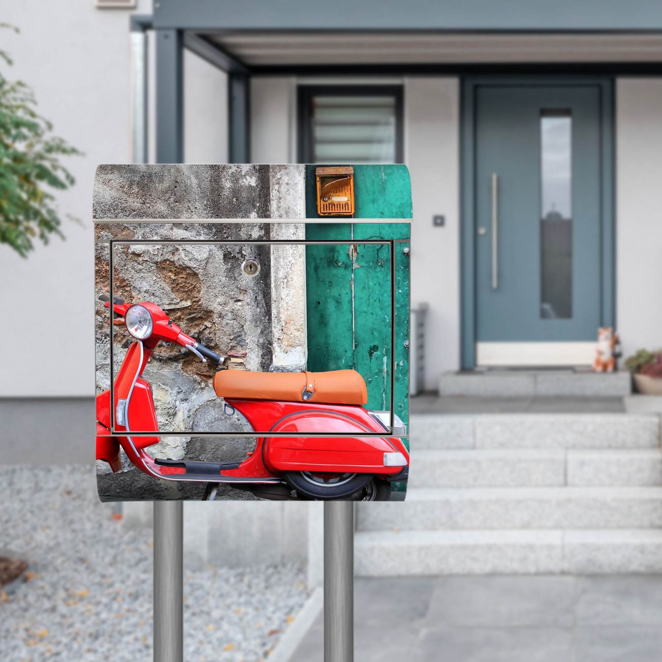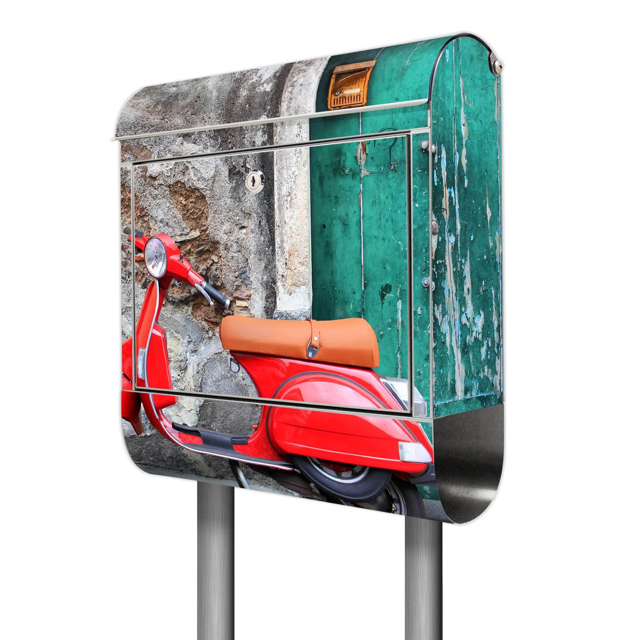 Der Motivstandbriefkasten hat ein sehr ansprechendes und ausgefallenes Design, damit entlocken Sie Ihren Nachbarn und dem Postboten ein Lächeln. Heben Sie Sich ab von der tristen grauen Masse, ohne auf Funktionalität zu verzichten. Der Briefkasten besteht aus hochwertigem 18/0 Edelstahl und die Wetter- und UV-resistenten Folie mit Italienischer Roller Motiv ist zusätzlich mit einem Schutzlaminat überzogen. Der Standbriefkasten wird mit Montagematerial und zwei Schlüsseln geliefert.